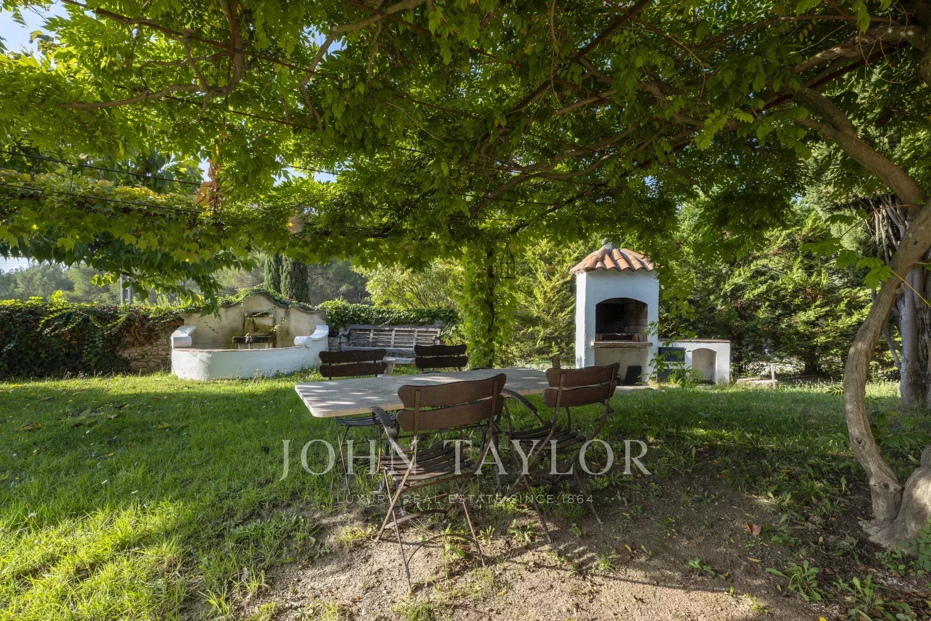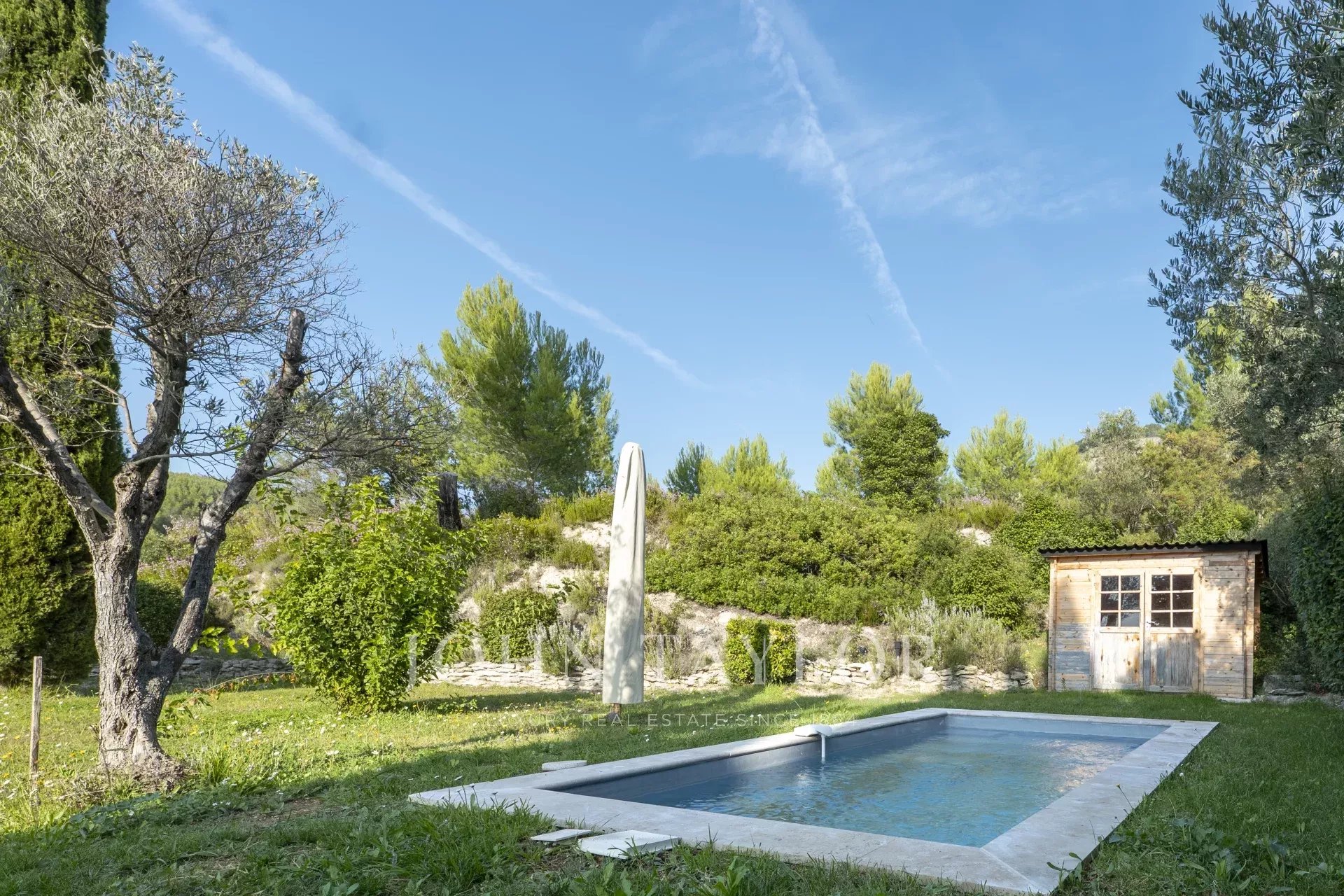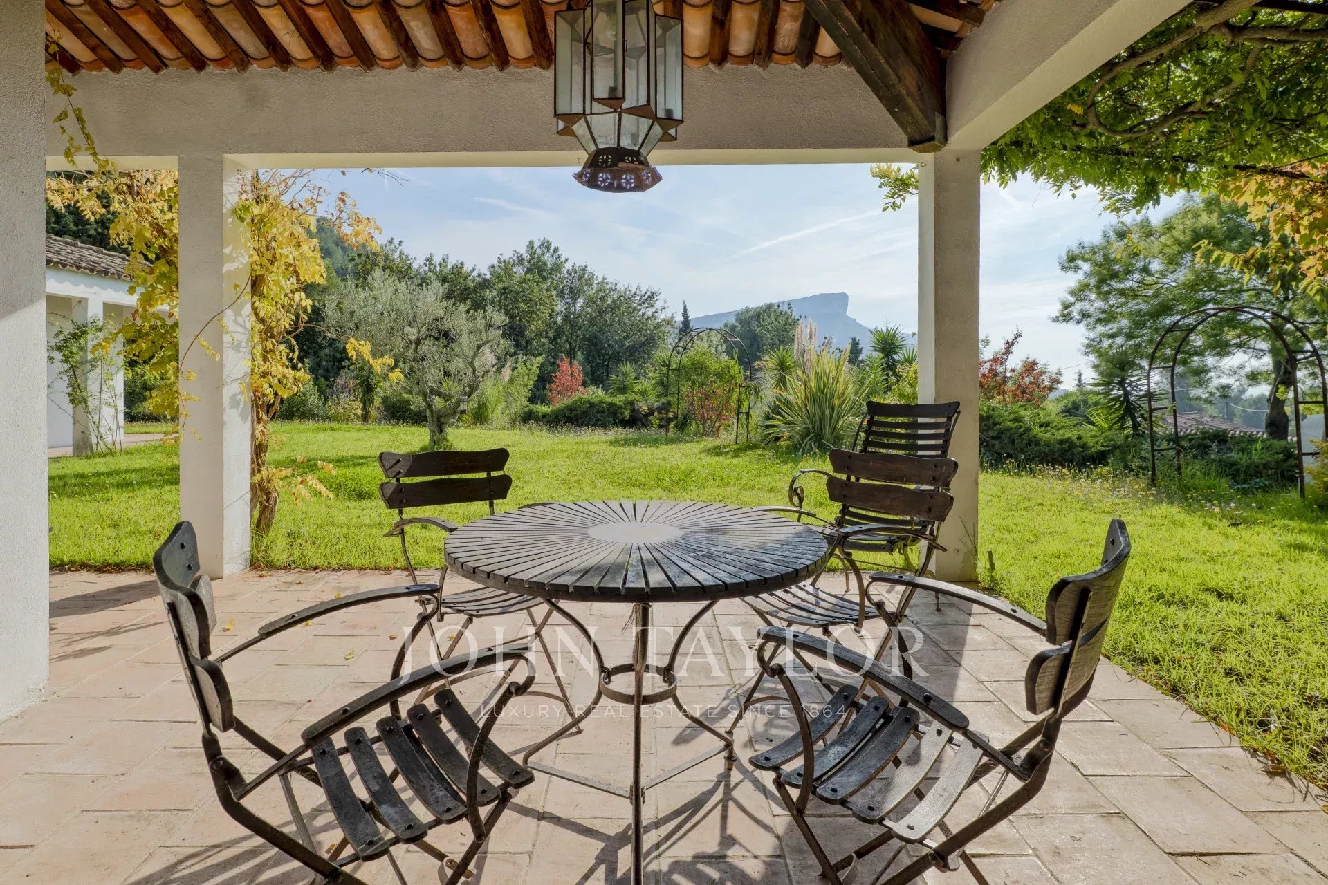 Édifiée sur un terrain plat et arboré de 3 020 m², orienté plein sud, la propriété profite de superbes perspectives sur la mer, la Couronne de Charlemagne et la campagne environnante. Le jardin paysager accueille une piscine au sel, une tonnelle, une fontaine et un abri voiture.