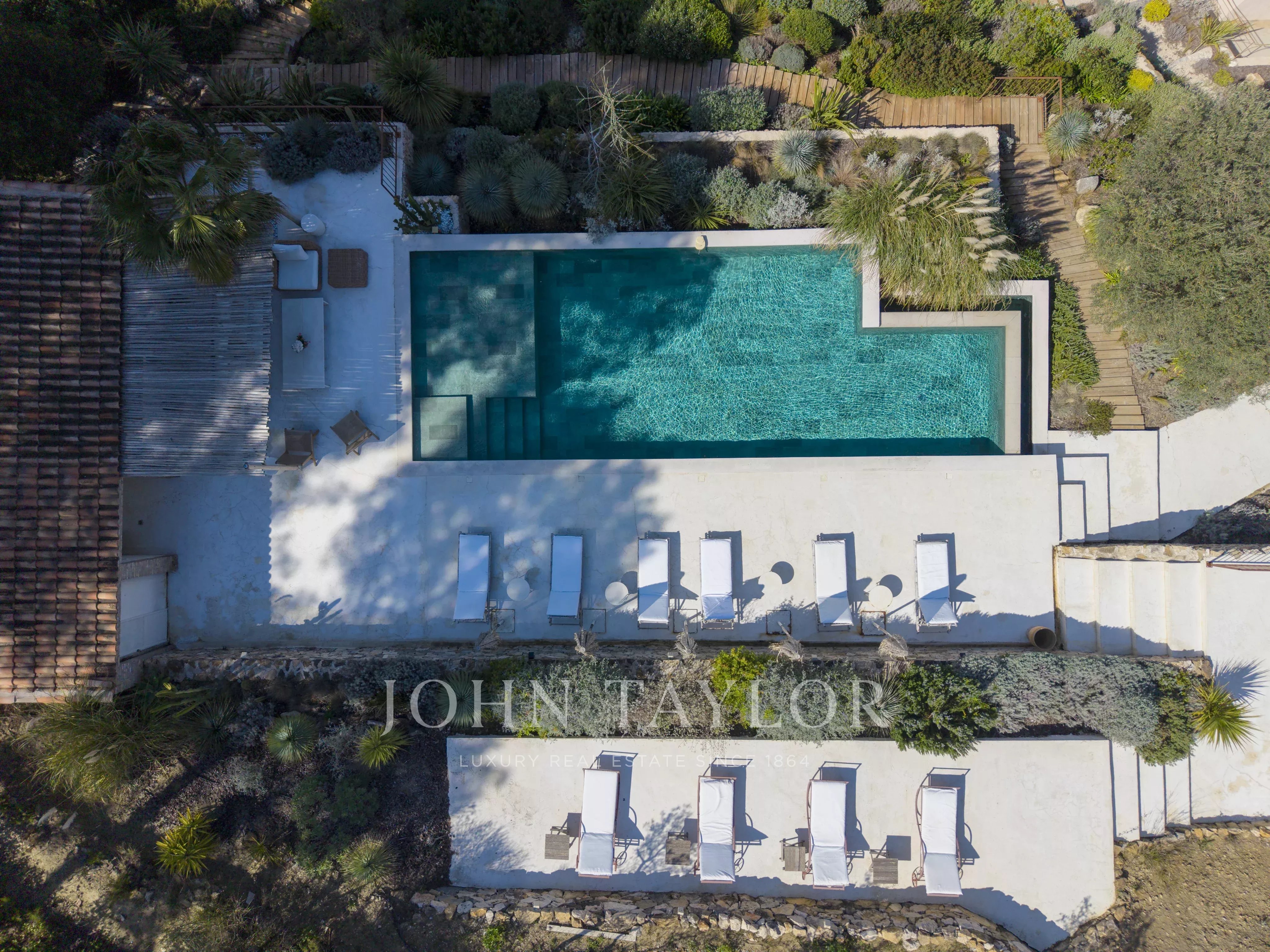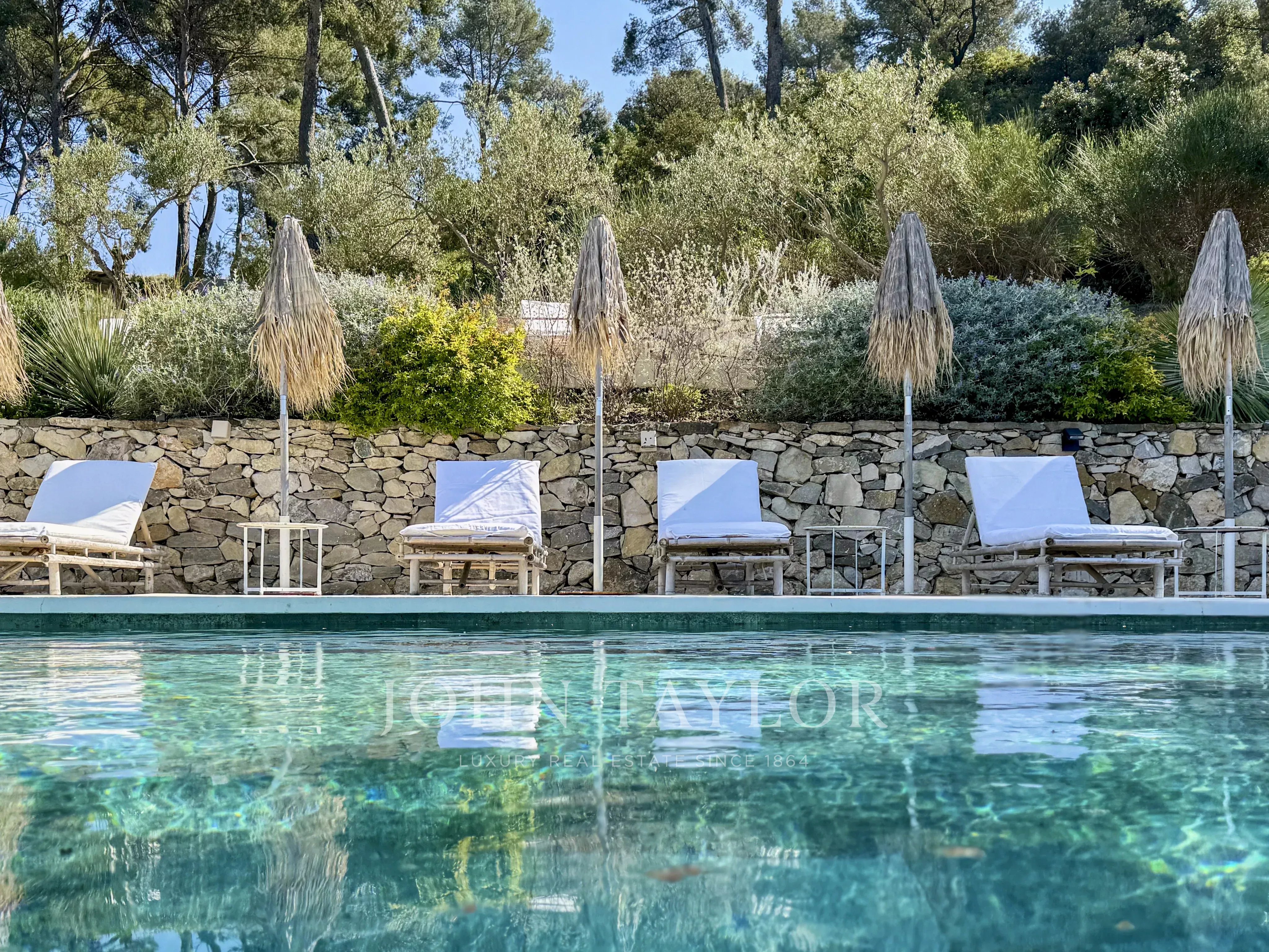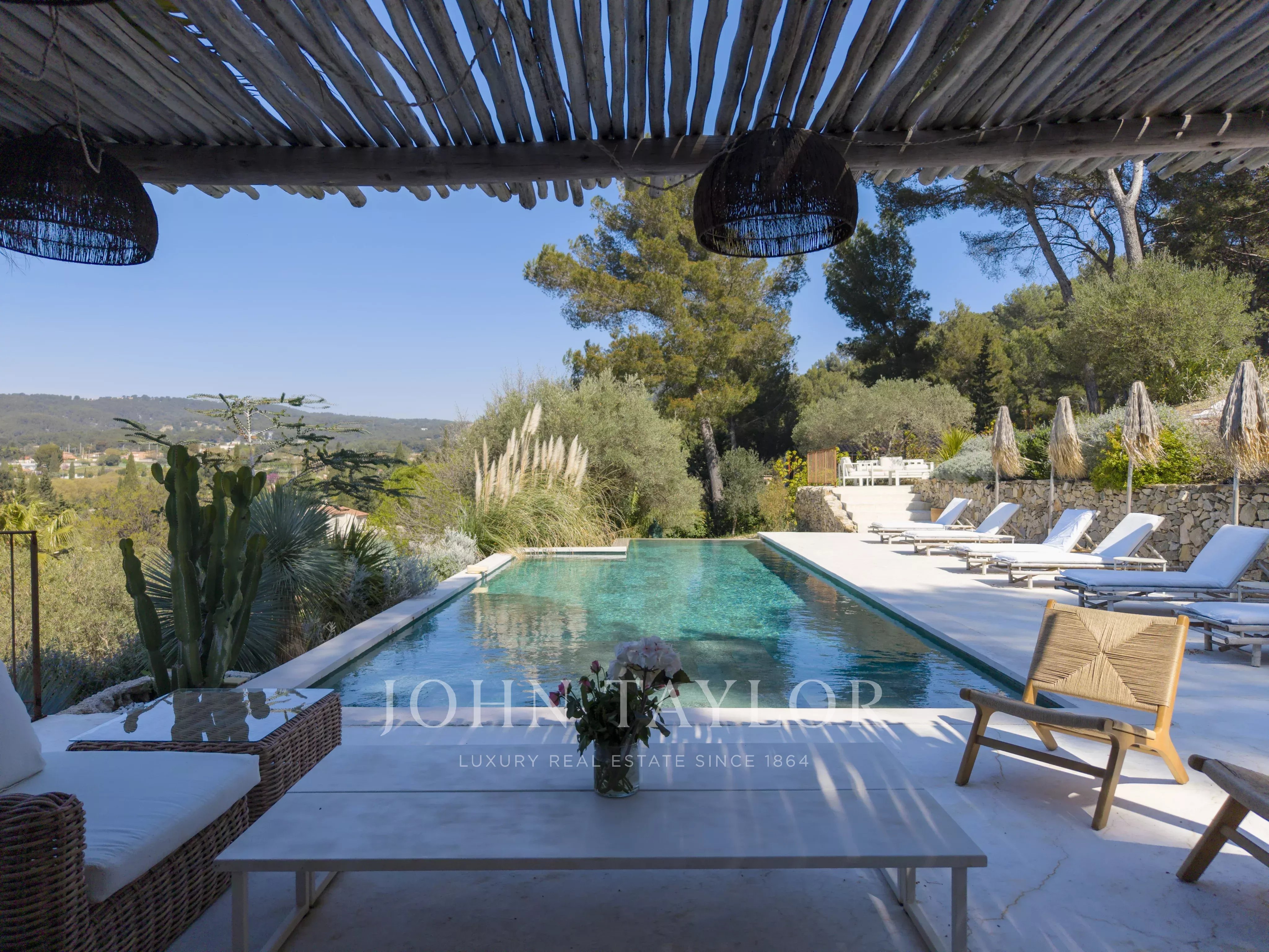 Cette villa méditerranéenne offre un cadre de vie idyllique entre un jardin luxuriant inspiré du maquis corse rempli d’essences aromatiques et d’oliviers centenaires et son élégante piscine et espace de villégiature profitant de magnifique couchers de soleils toute l’année.