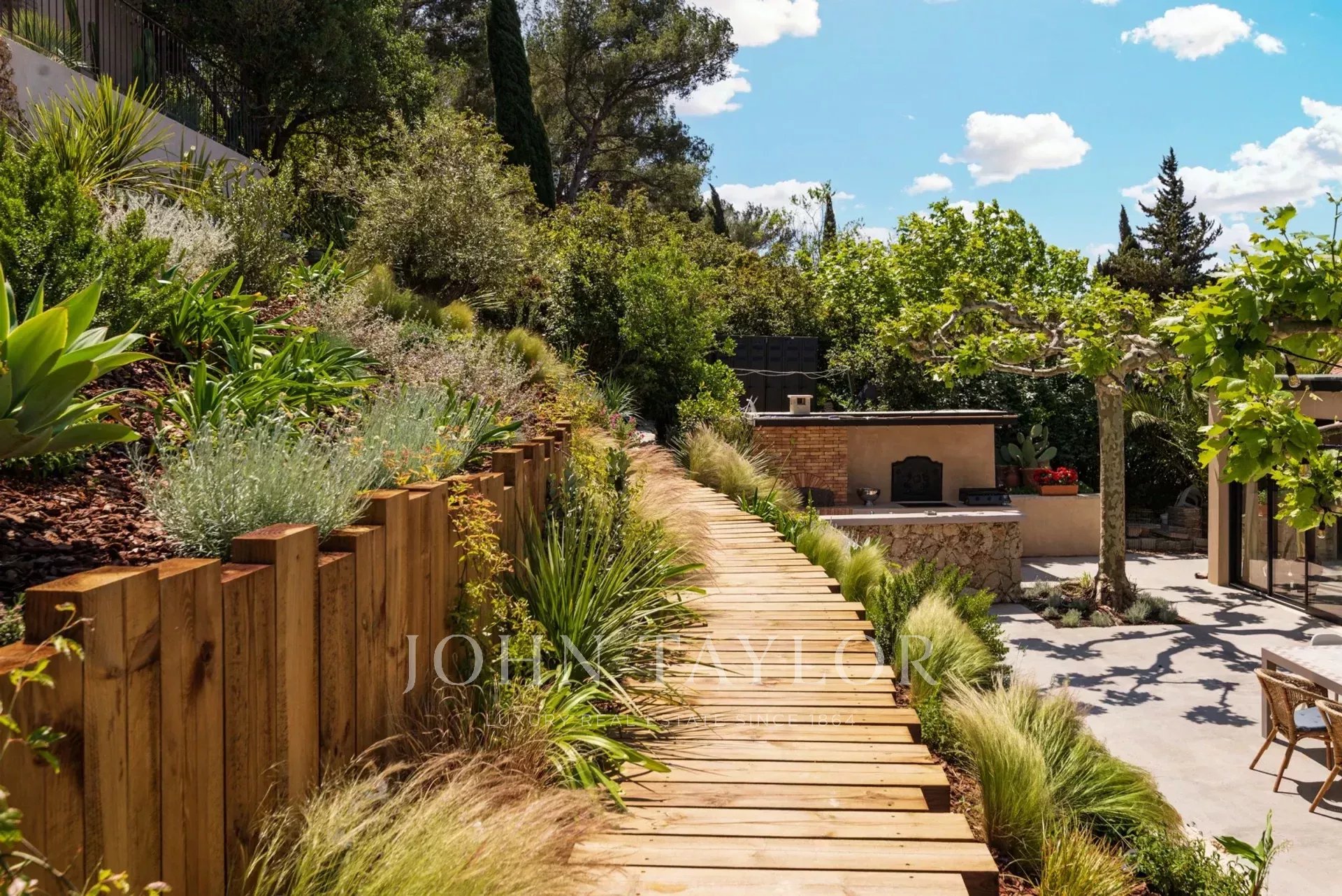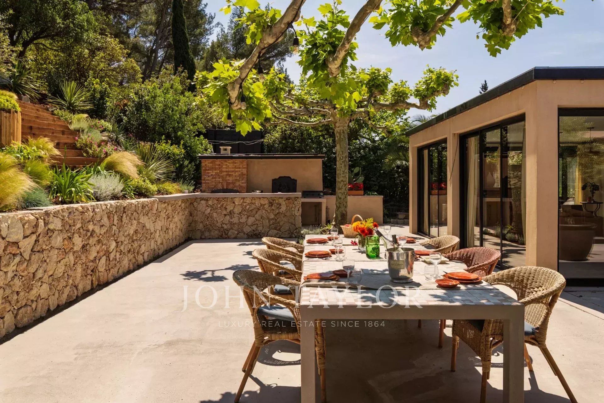 On accède à la porte d’entrée de la maison en parcourant la terrasse principale d’env. 200m², ombragée par de magnifiques platanes et la cuisine d’été protégée par son auvent. Celle-ci est entièrement équipée (four à pizzas, plancha et barbecue).