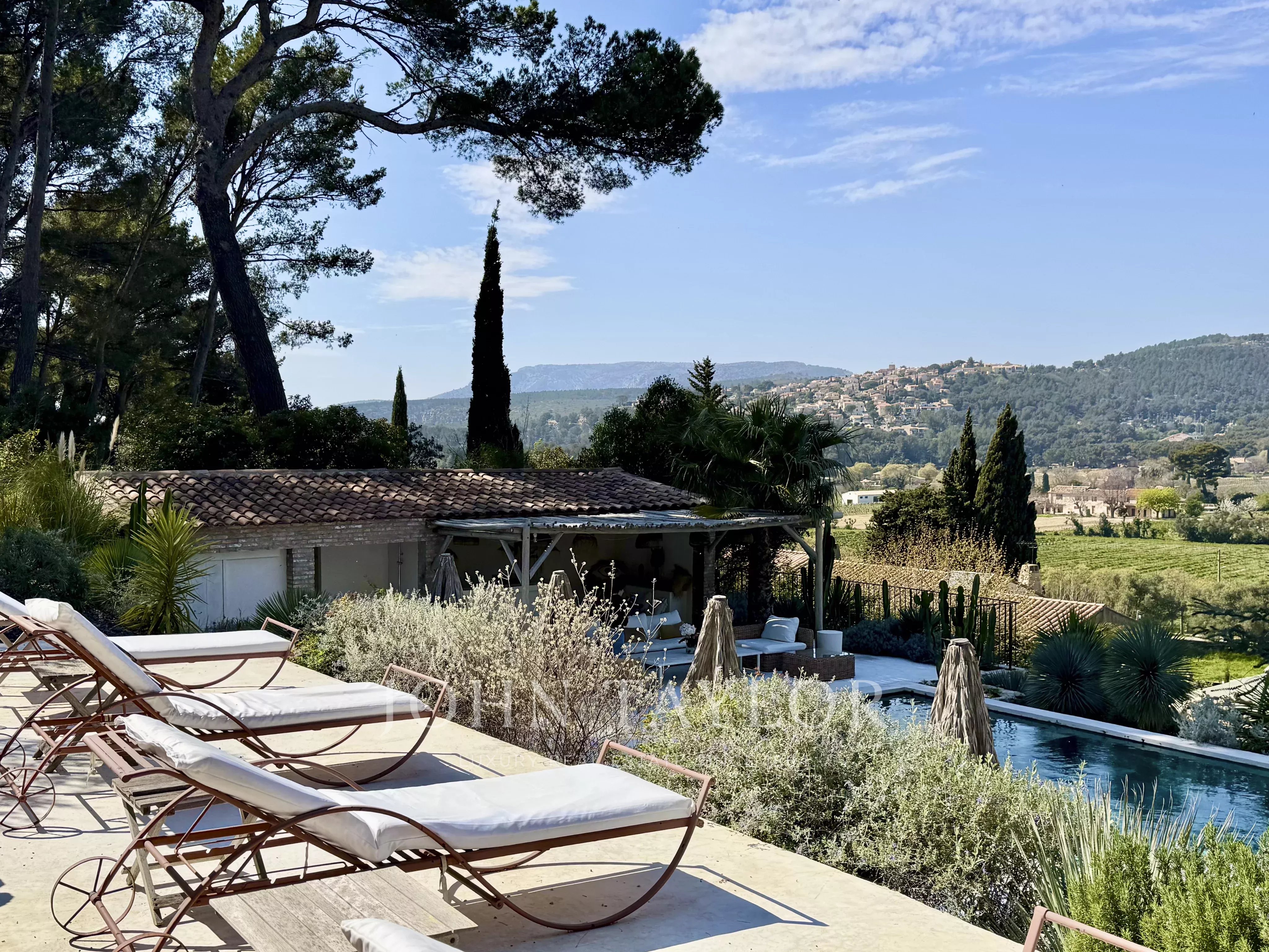 La partie piscine se trouve en situation dominante, avec solarium et pool house équipé, offrant un cadre idéal pour se détendre en toute tranquillité et contempler les couchers de soleil et la ligne de crêtes.