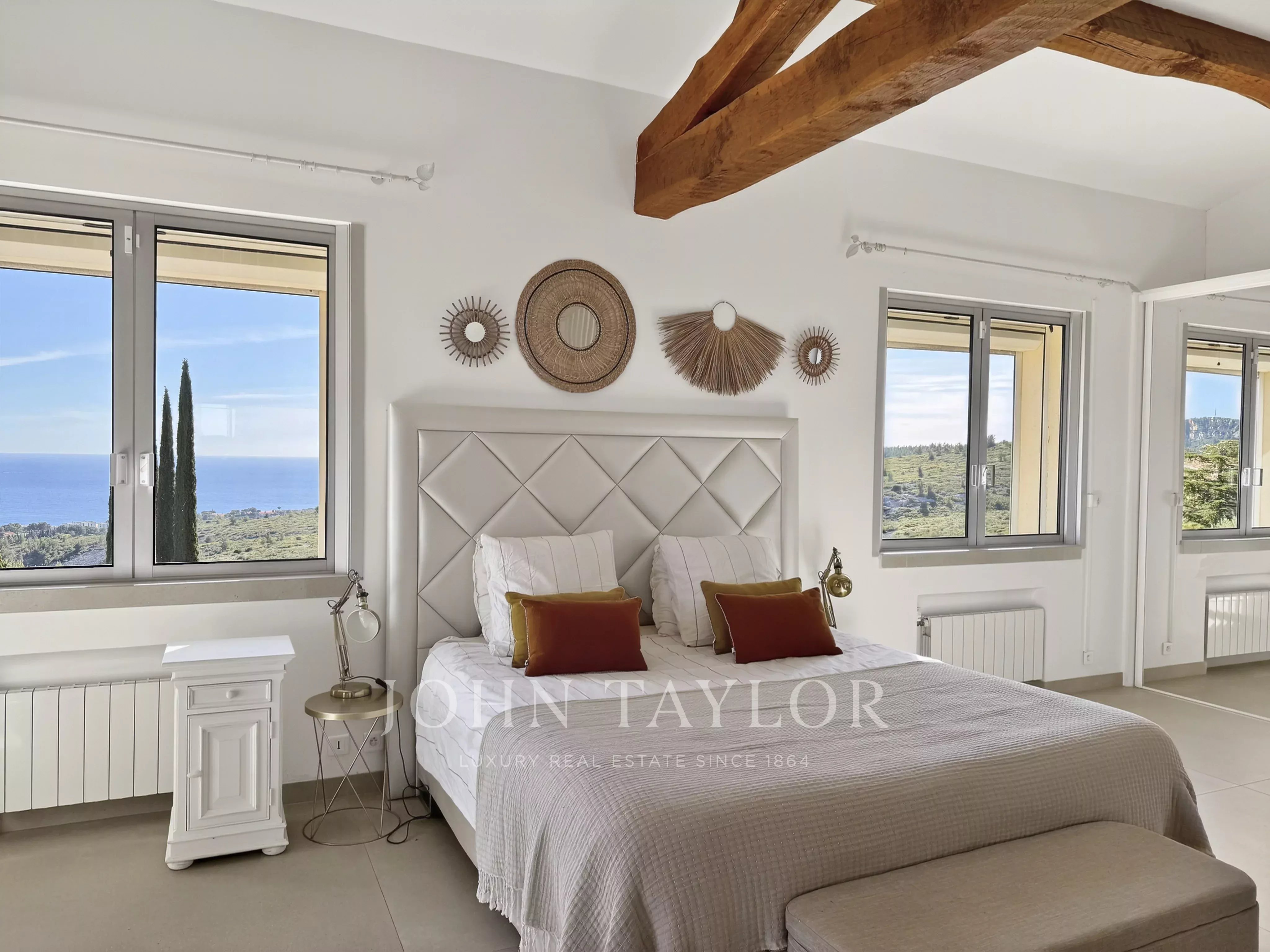 À l’étage, une grande suite parentale d’environ 35 m² dispose de sa salle de bain privative et d’une terrasse offrant un point de vue spectaculaire sur la mer et les reliefs environnants. Une seconde chambre avec salle de bain attenante complète ce niveau et profite d’un balcon ouvert sur les collines.