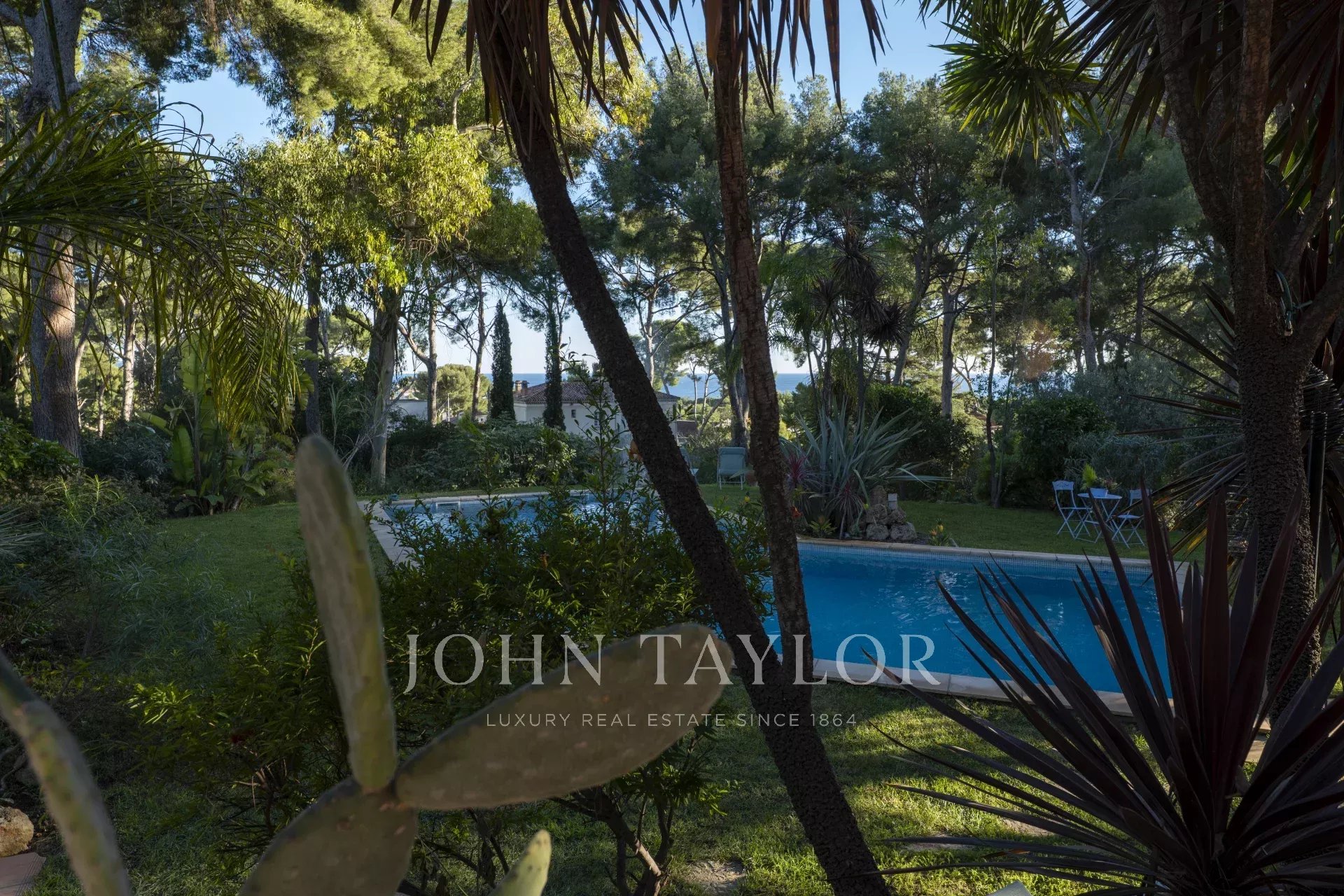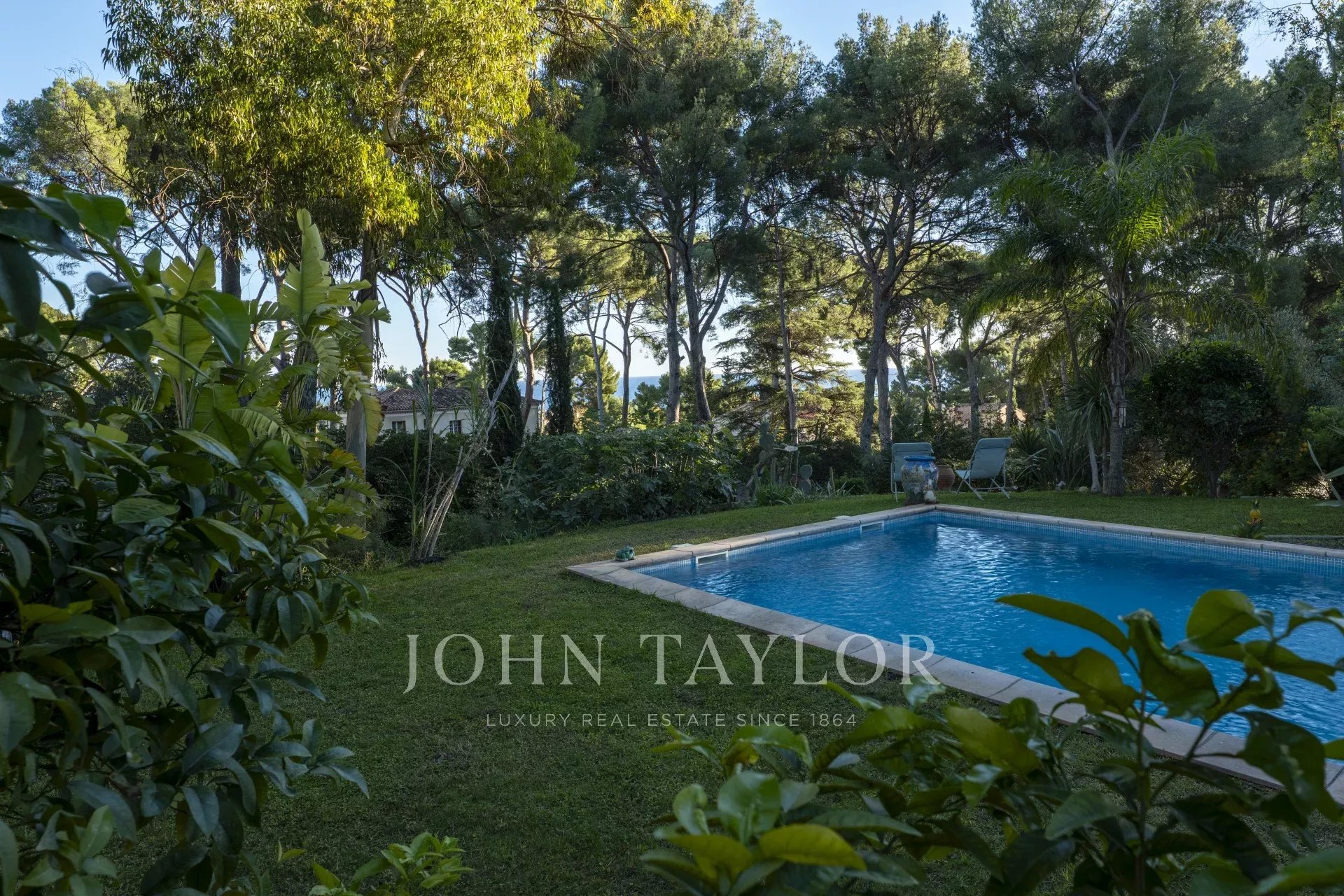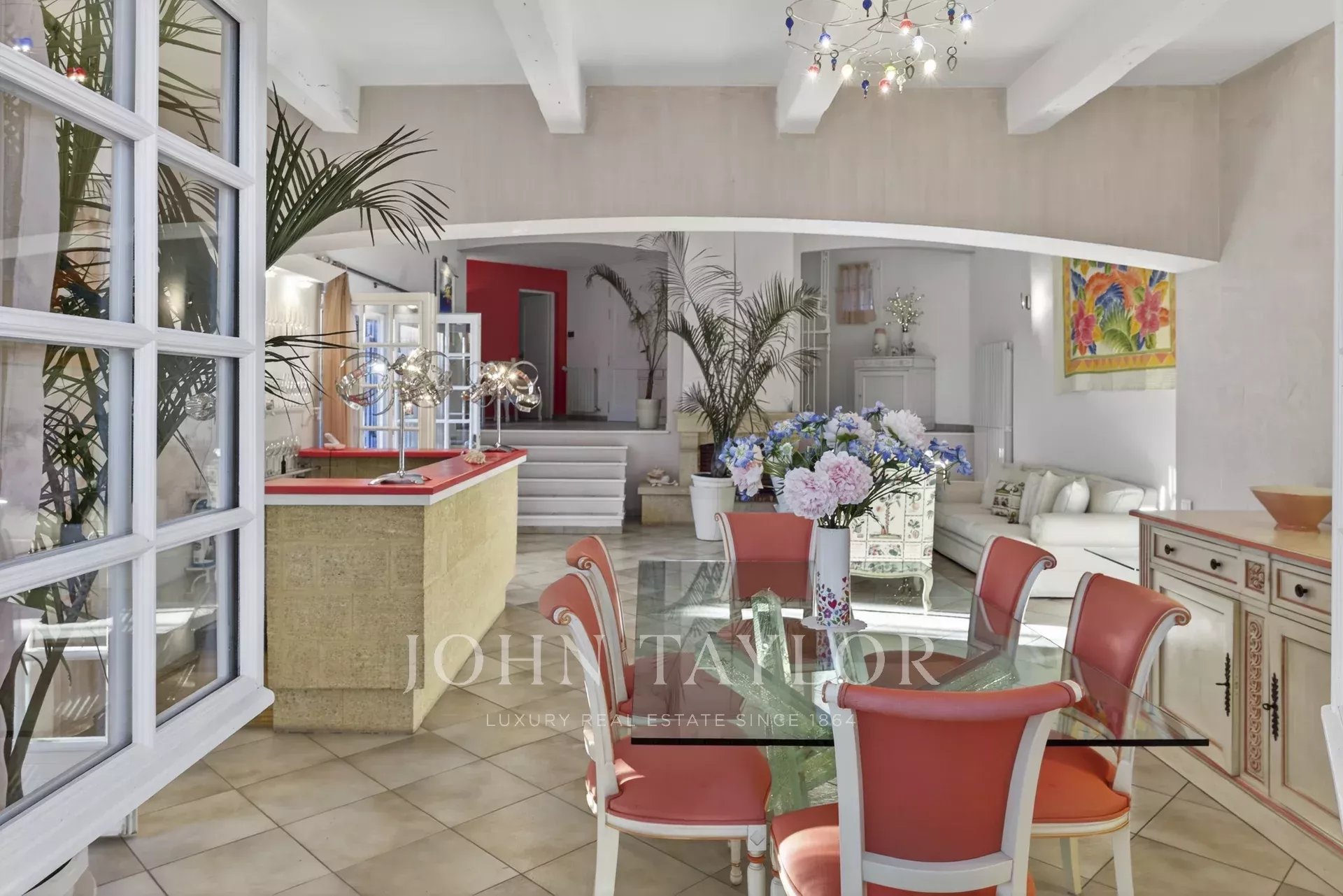 La villa, soigneusement maçonnée et dotée d’une toiture à génoises, s’ouvre sur 130 m² de terrasses donnant sur un parc agrémenté d’une piscine de 100 m³. Le vaste salon cathédrale de 67 m² séduit par ses volumes et sa clarté, avec un bar et une cheminée en pierre de Rognes. Il communique avec une cuisine provençale équipée, prolongée par une terrasse plein sud avec espace barbecue et vue mer.