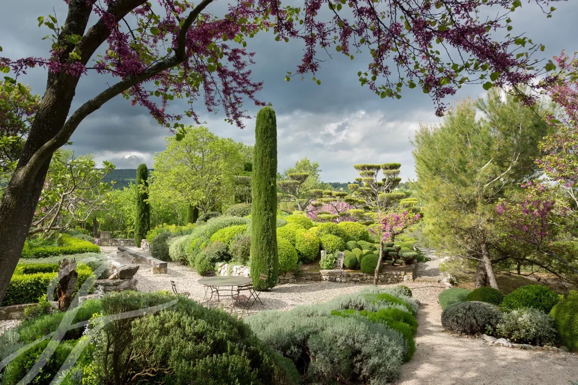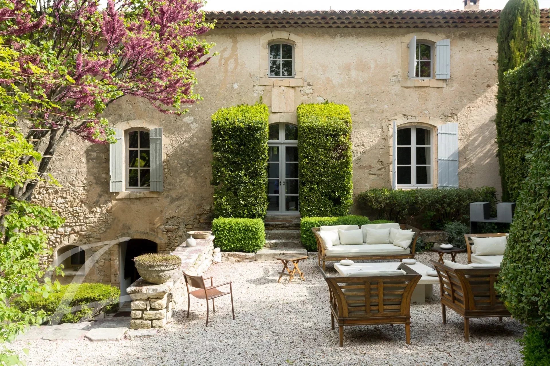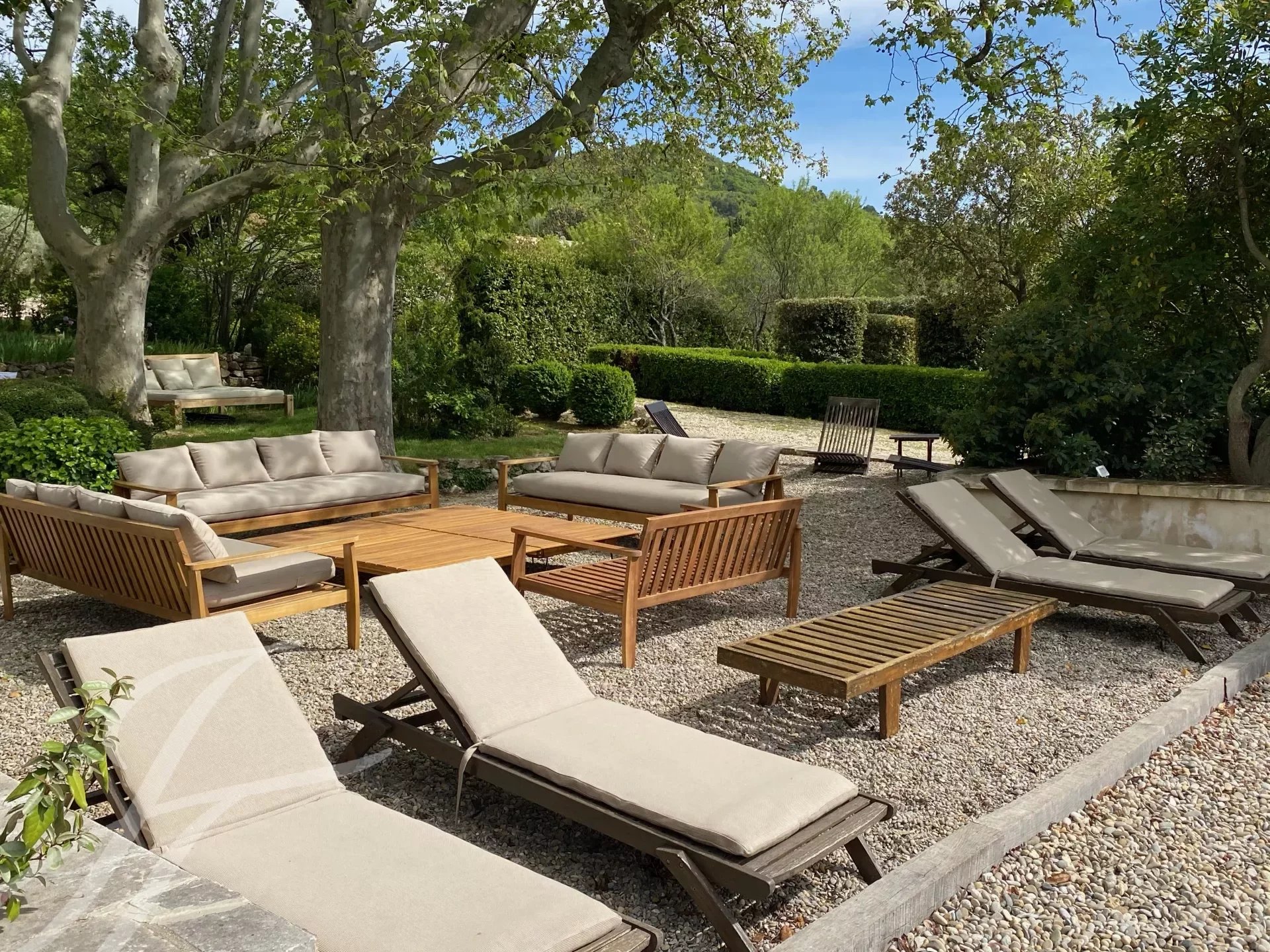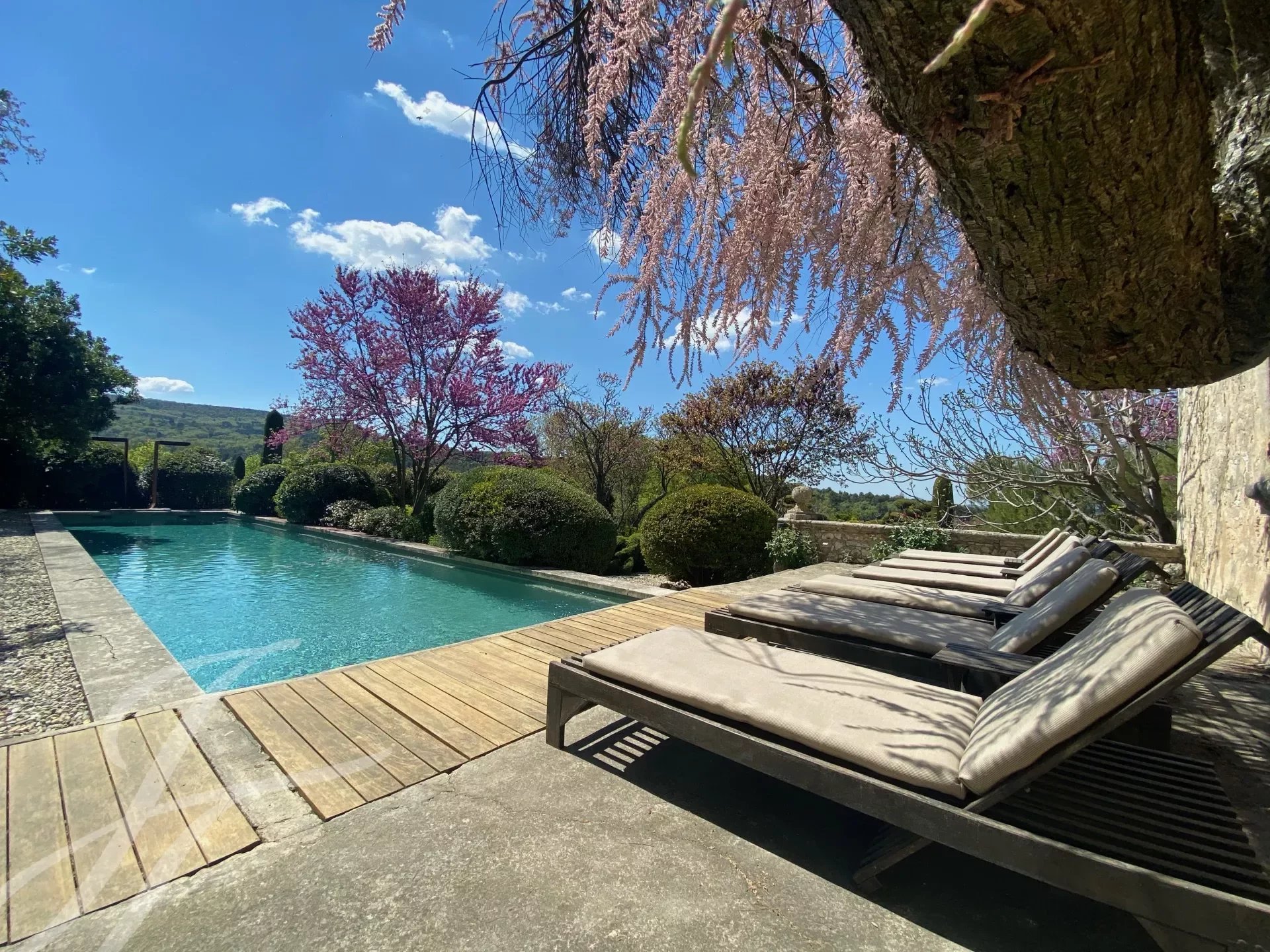 À l'extérieur, vous pourrez profiter de la piscine de 18 mètres et de sa cuisine d'été entièrement équipée, ou vous détendre dans l'un des nombreux espaces de détente autour de la propriété. Ces lieux intimes, séparés par des murets ou des différences de niveau, sont rythmés par des topiaires globuleuses et des colonnes fuselées de cyprès, parfois ombragés par des figuiers, des arbres de Judée, des chênes ou d’immenses platanes. Le parc de plus de 7 hectares semble se prolonger infiniment vers les collines boisées du Parc naturel du Luberon et la plaine en contrebas.