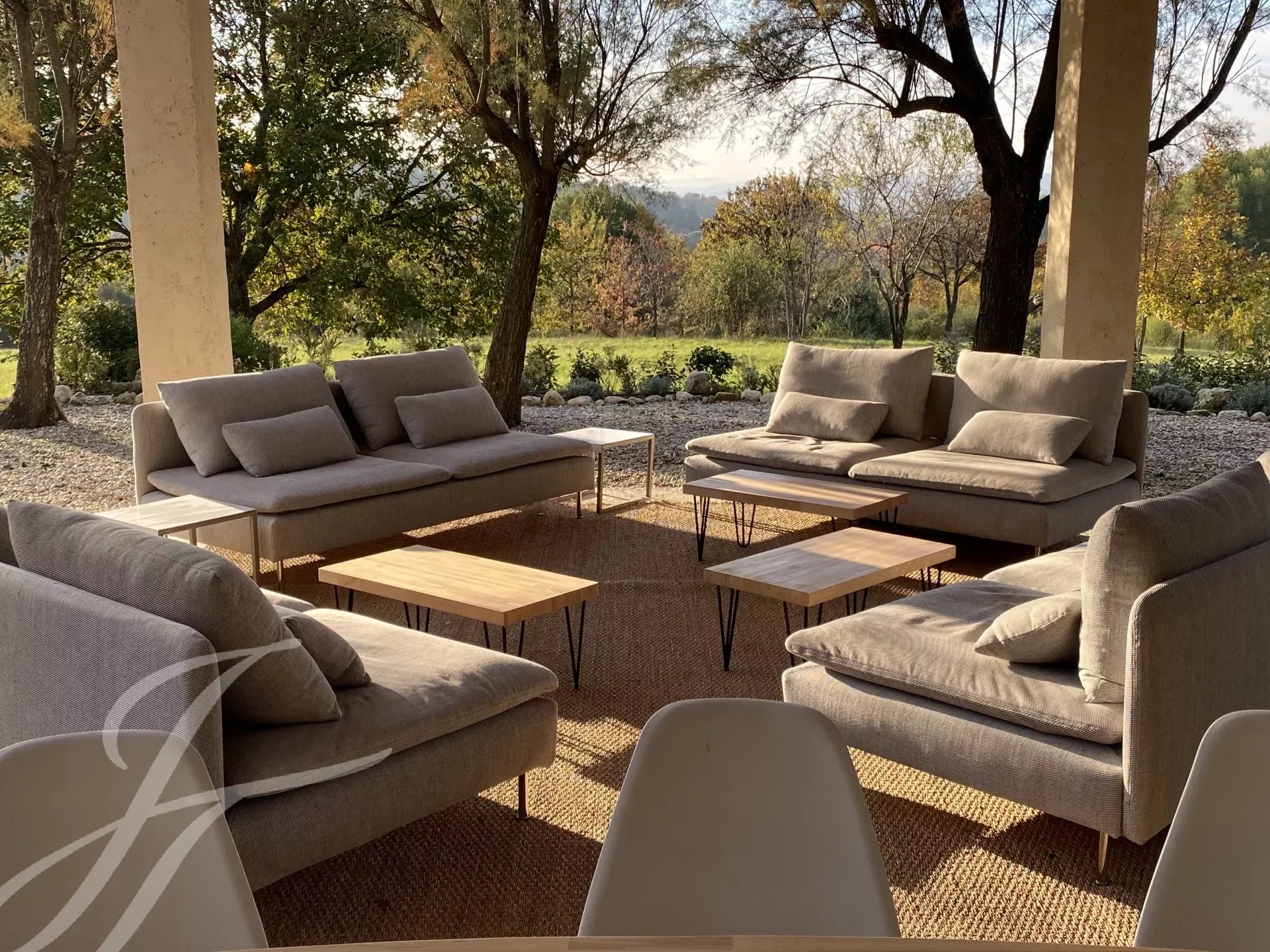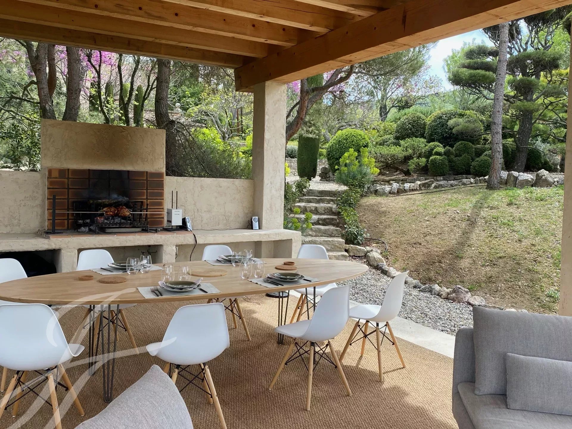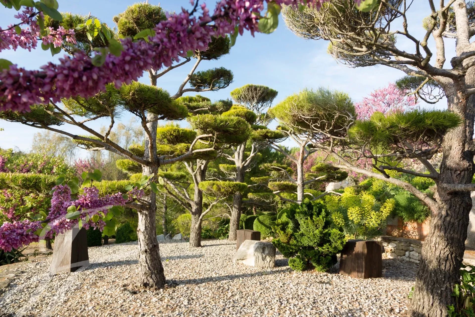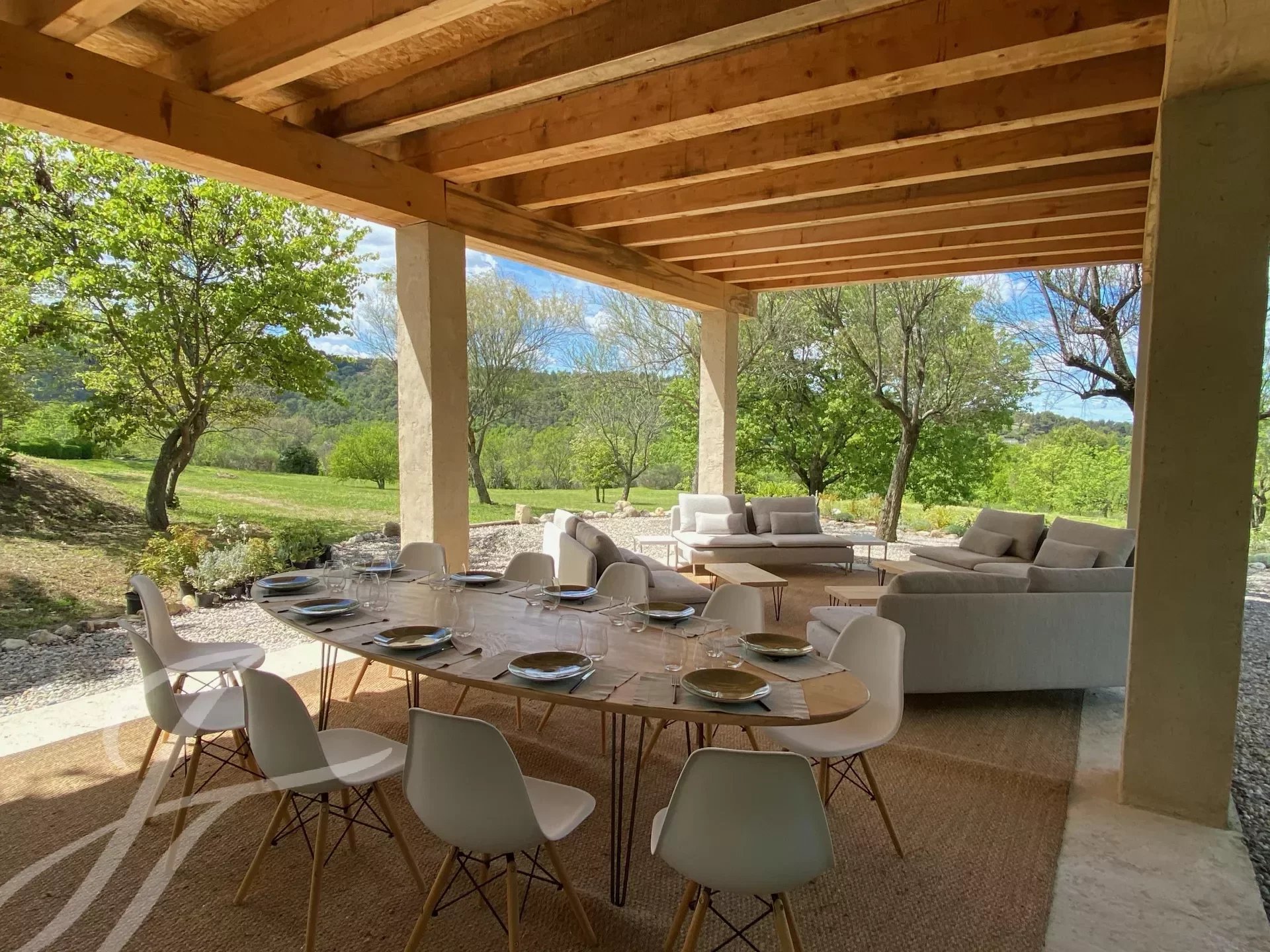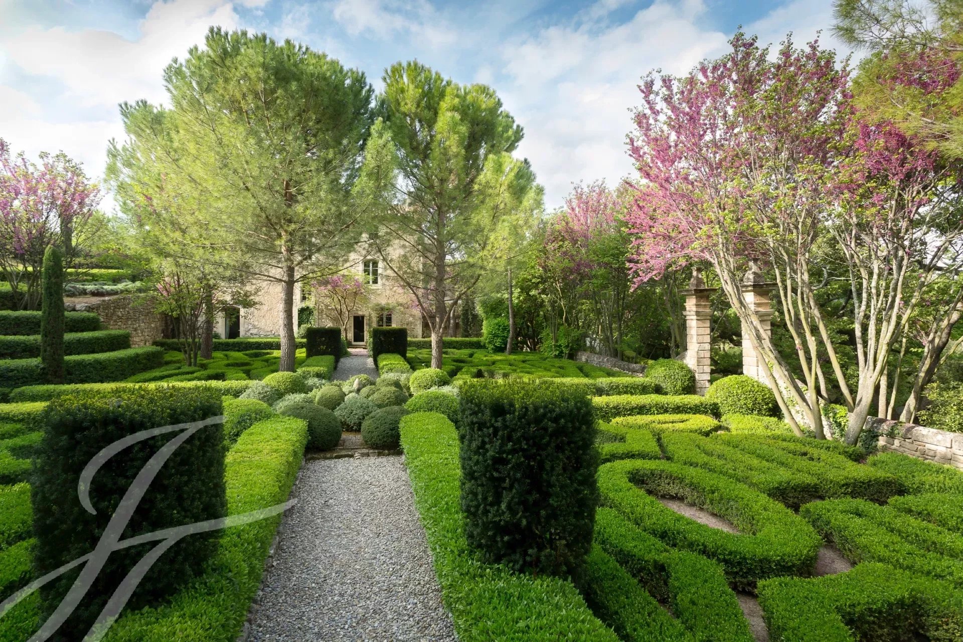 À l'extérieur, vous pourrez profiter de la piscine de 18 mètres et de sa cuisine d'été entièrement équipée, ou vous détendre dans l'un des nombreux espaces de détente autour de la propriété. Ces lieux intimes, séparés par des murets ou des différences de niveau, sont rythmés par des topiaires globuleuses et des colonnes fuselées de cyprès, parfois ombragés par des figuiers, des arbres de Judée, des chênes ou d’immenses platanes. Le parc de plus de 7 hectares semble se prolonger infiniment vers les collines boisées du Parc naturel du Luberon et la plaine en contrebas.