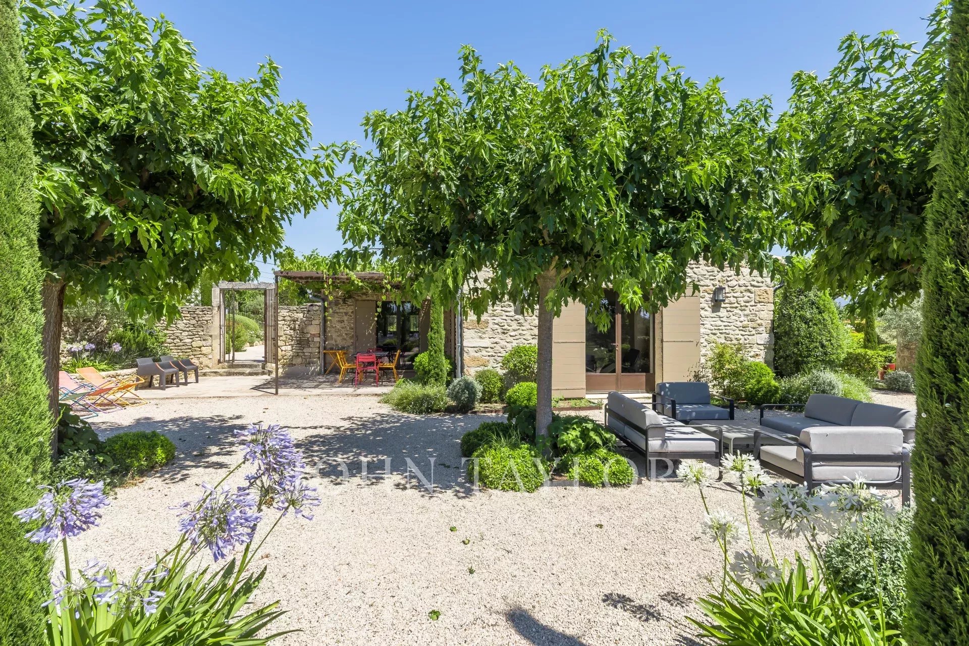 L'emplacement et l'aménagement du terrain constituent l'un des principaux atouts de cette propriété : située à flanc de colline, elle offre des vues panoramiques sur le Luberon et une exposition plein sud. Le terrain est entièrement clos et planté majoritairement d'arbres fruitiers, de cyprès, d'une oliveraie en production (environ 200 litres d huile) et de lavande. L'irrigation est assurée par le Canal de Provence.