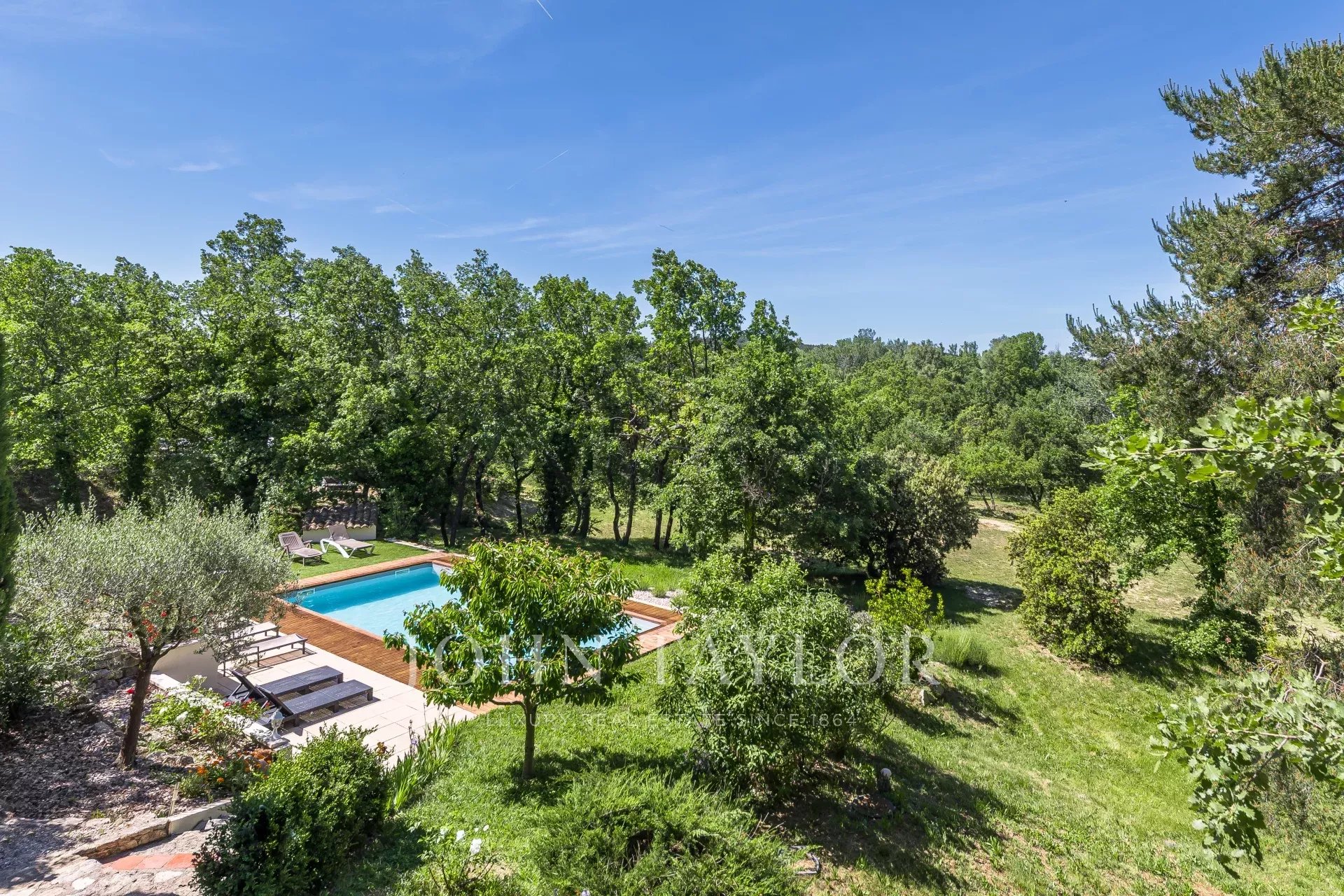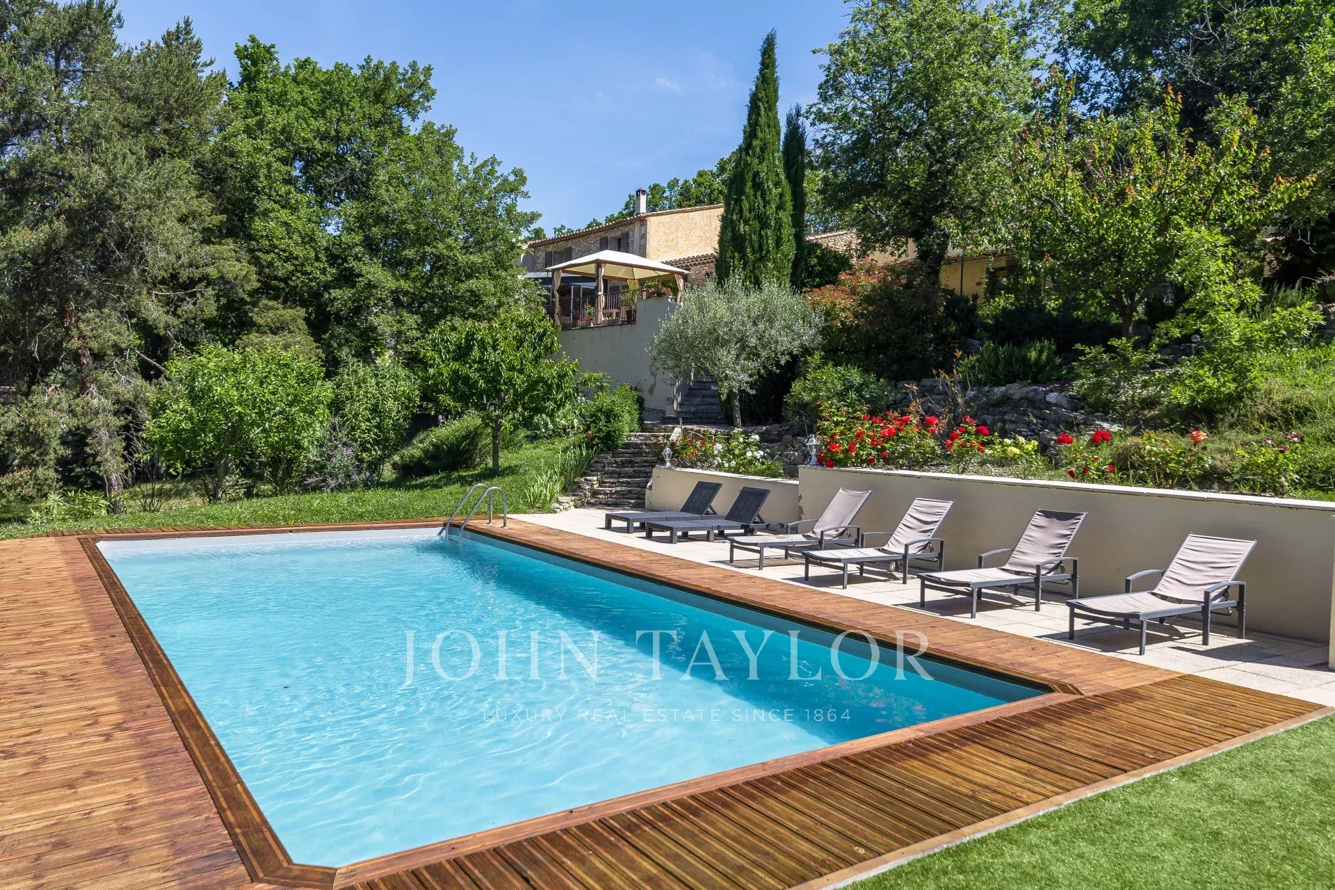 Nichée au milieu d’une végétation typiquement provençale, chênes centenaires, cyprès, oliviers, rosiers et arbustes.