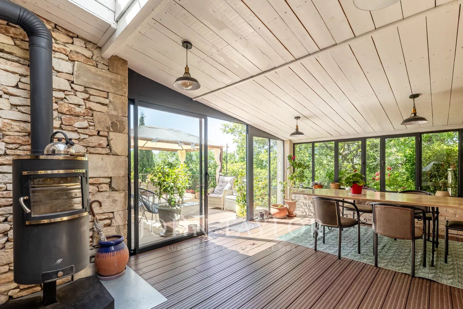 En rez-de-jardin, un vaste salon-séjour d’environ 50 m² avec poêle à granulés et larges ouvertures sur les terrasses exposées sud, une salle à manger avec cuisine ouverte, une véranda lumineuse de 25 m² avec poêle à bois, deux chambres en suite climatisées avec salle d’eau, WC, terrasse et accès privatif, ainsi qu’une buanderie, des toilettes invités et un cellier.