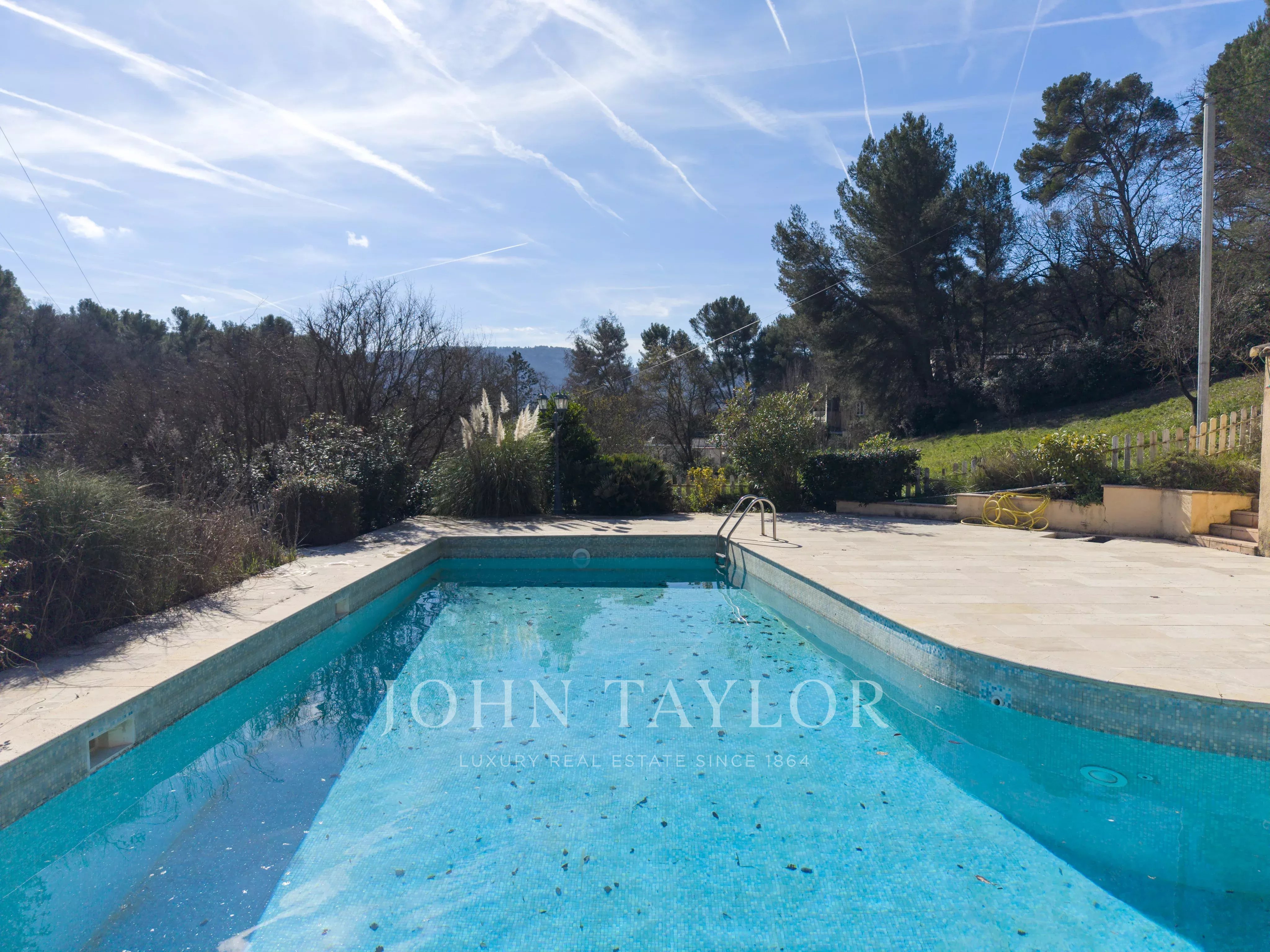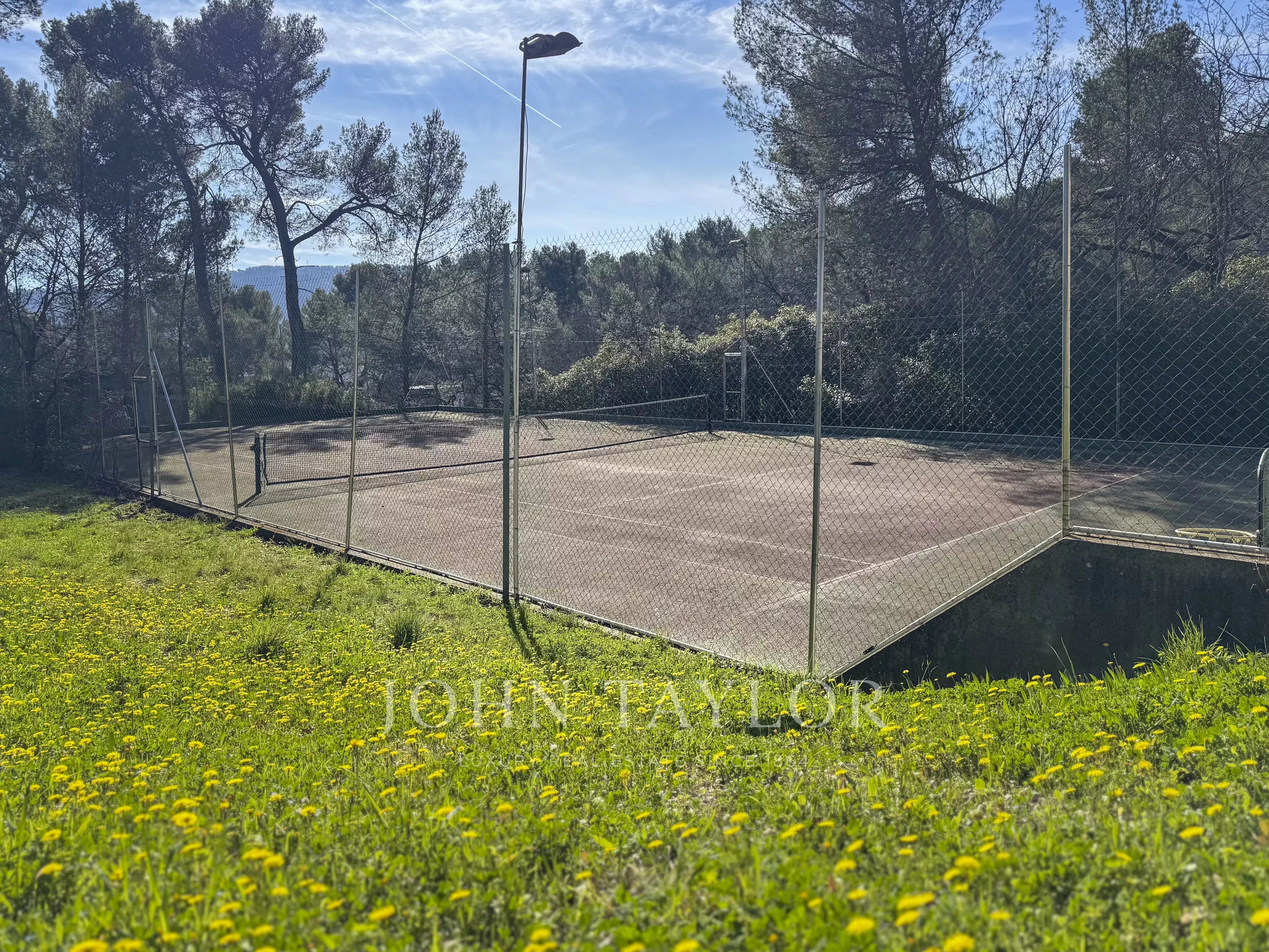 À l’extérieur, les prestations sont complètes : piscine avec plage en travertin et pool house, terrain de tennis privé et deux forages assurant l’autonomie en eau.