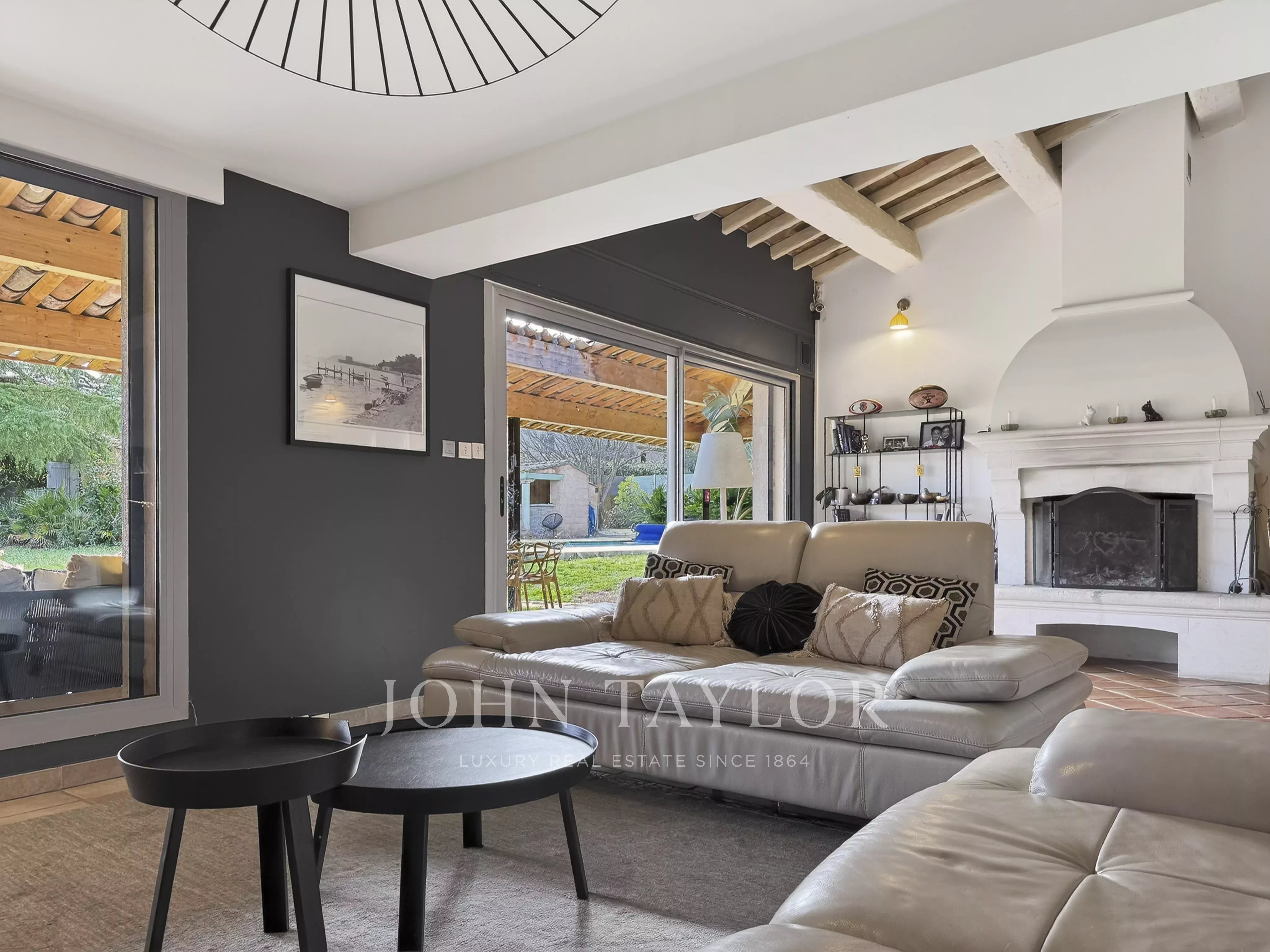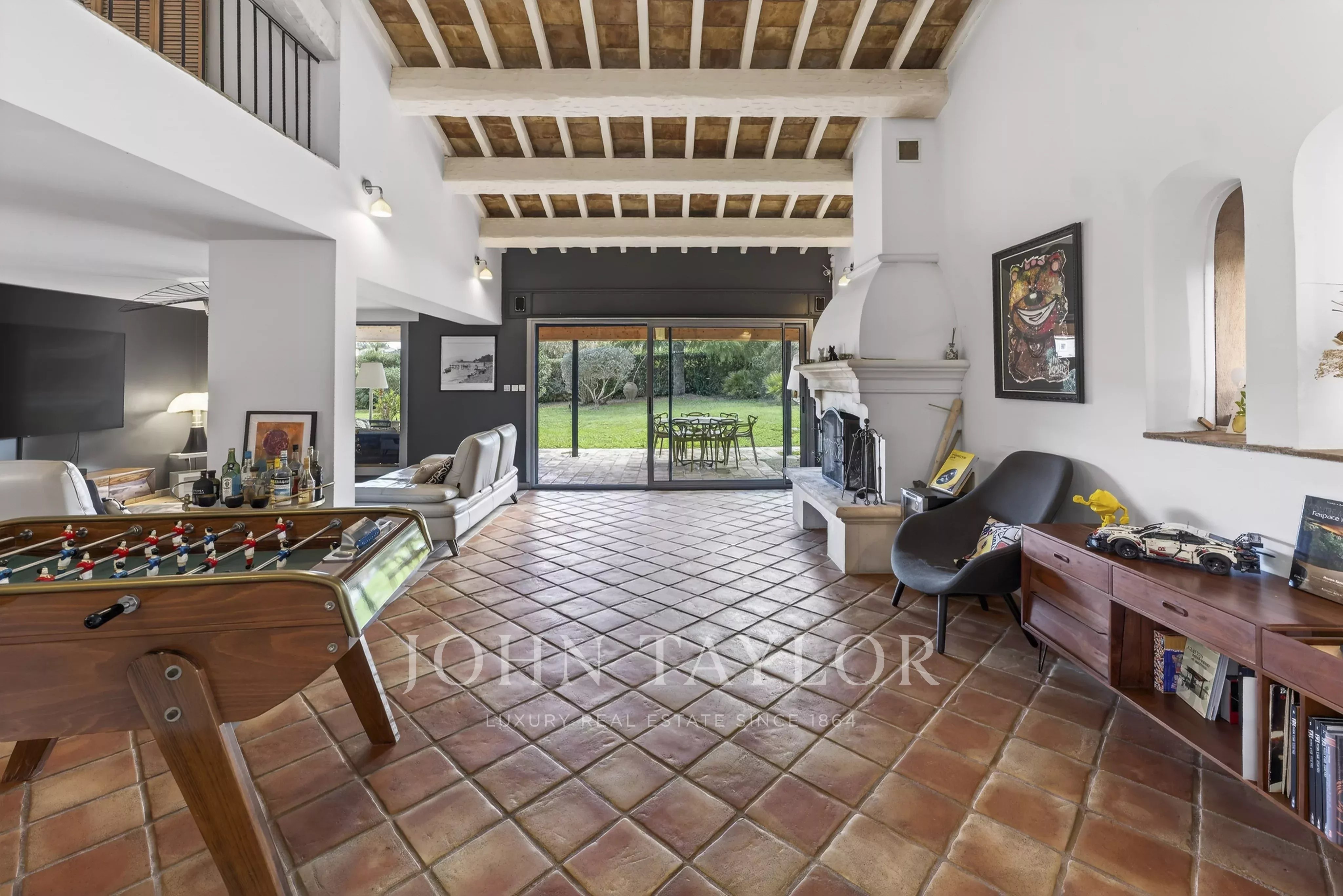 Développant environ 257 m² habitables. la villa séduit dès l’entrée par un hall spacieux ouvrant sur une pièce de vie lumineuse d’environ 60 m². sublimée par de larges baies vitrées. une cheminée. des poutres apparentes et des pierres de caractère. Une salle à manger attenante prolonge harmonieusement cet espace de réception.