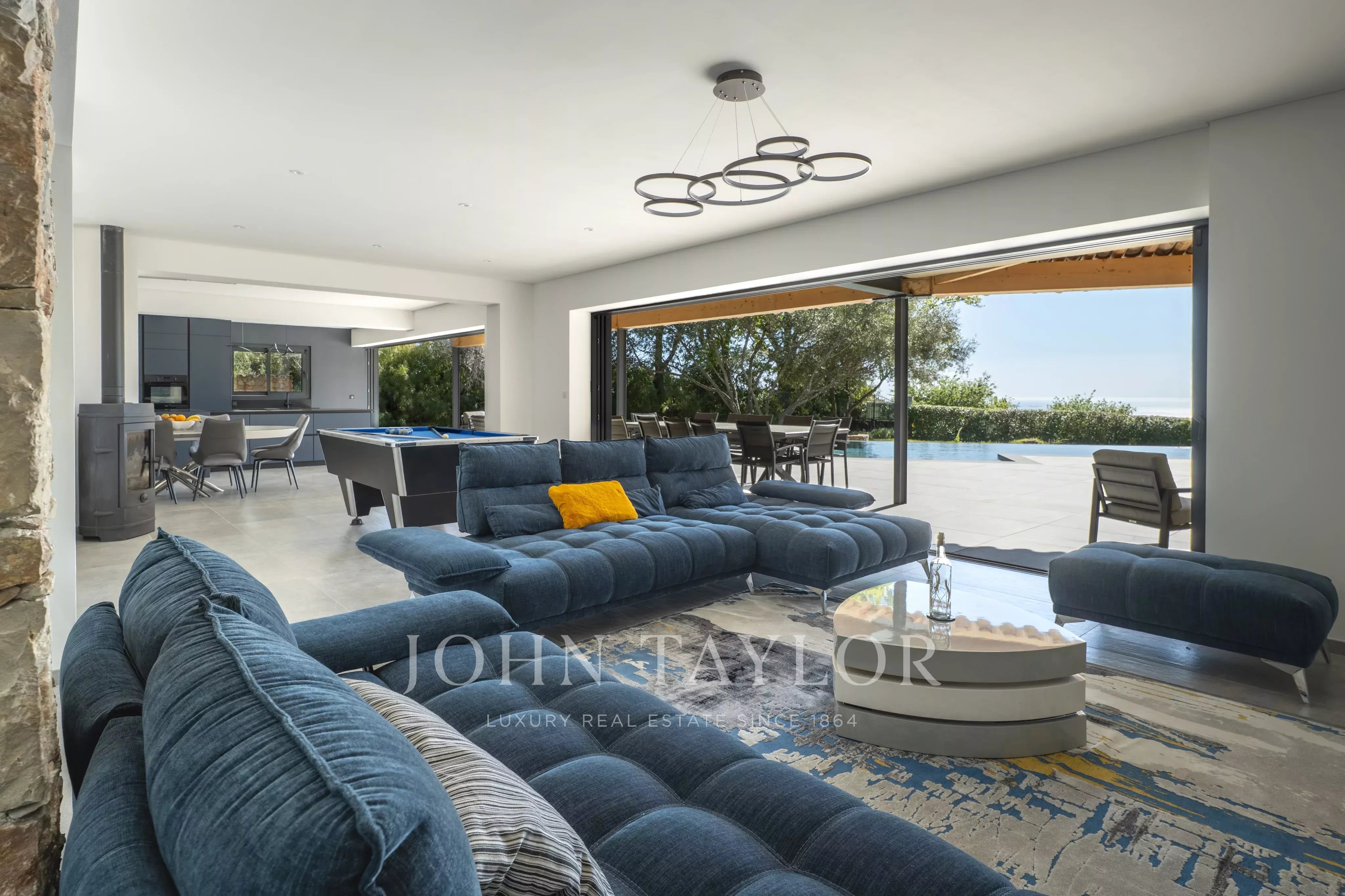 Le séjour, en parfaite continuité avec la piscine à débordement, crée une atmosphère fluide où intérieur et extérieur ne font qu’un, invitant à une expérience de vie résolument tournée vers la Méditerranée.