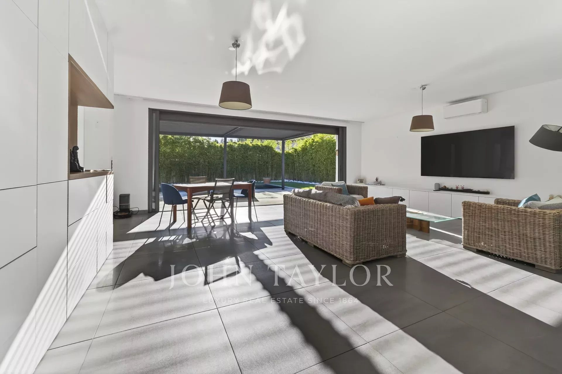 Conçue pour le confort et la lumière, elle s’ouvre sur un vaste séjour de 50 m² prolongé par une cuisine ouverte entièrement équipée. De larges baies vitrées à galandage créent une continuité fluide entre l’intérieur et l’extérieur, menant à la terrasse, la pergola bioclimatique et la piscine chauffée.