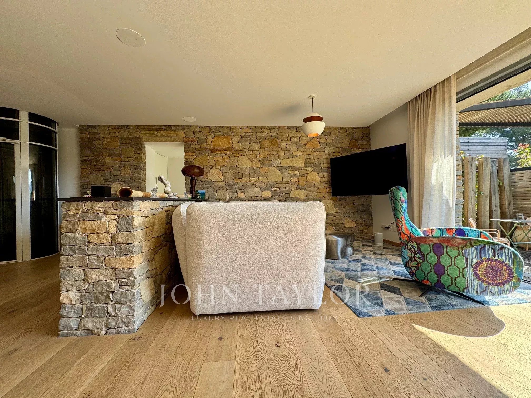 À l’étage, accessible par un ascenseur tubulaire dernière génération, une suite parentale offre un véritable espace indépendant avec chambre, salle de bains et terrasse privative, permettant de profiter pleinement du cadre environnant.