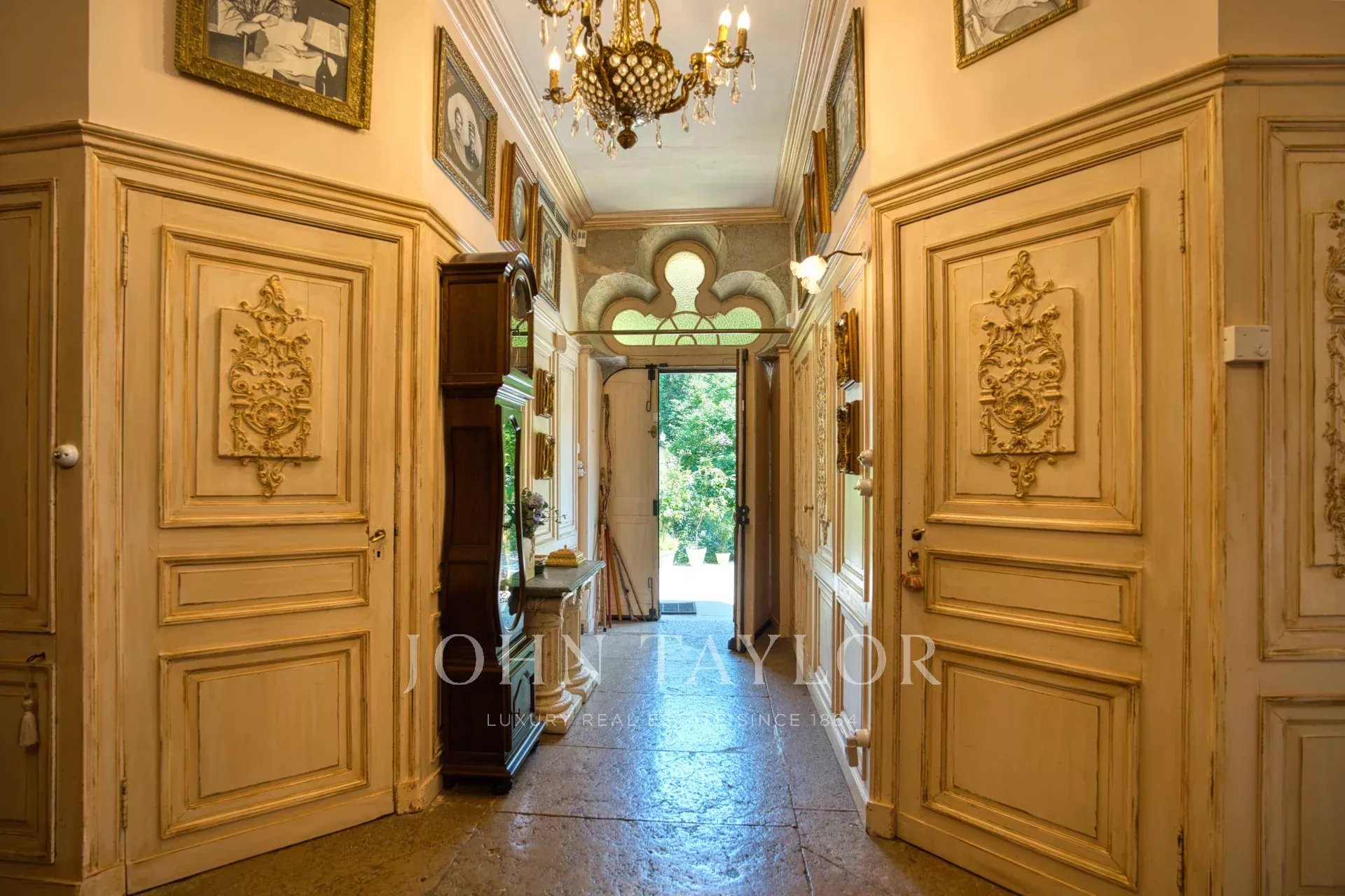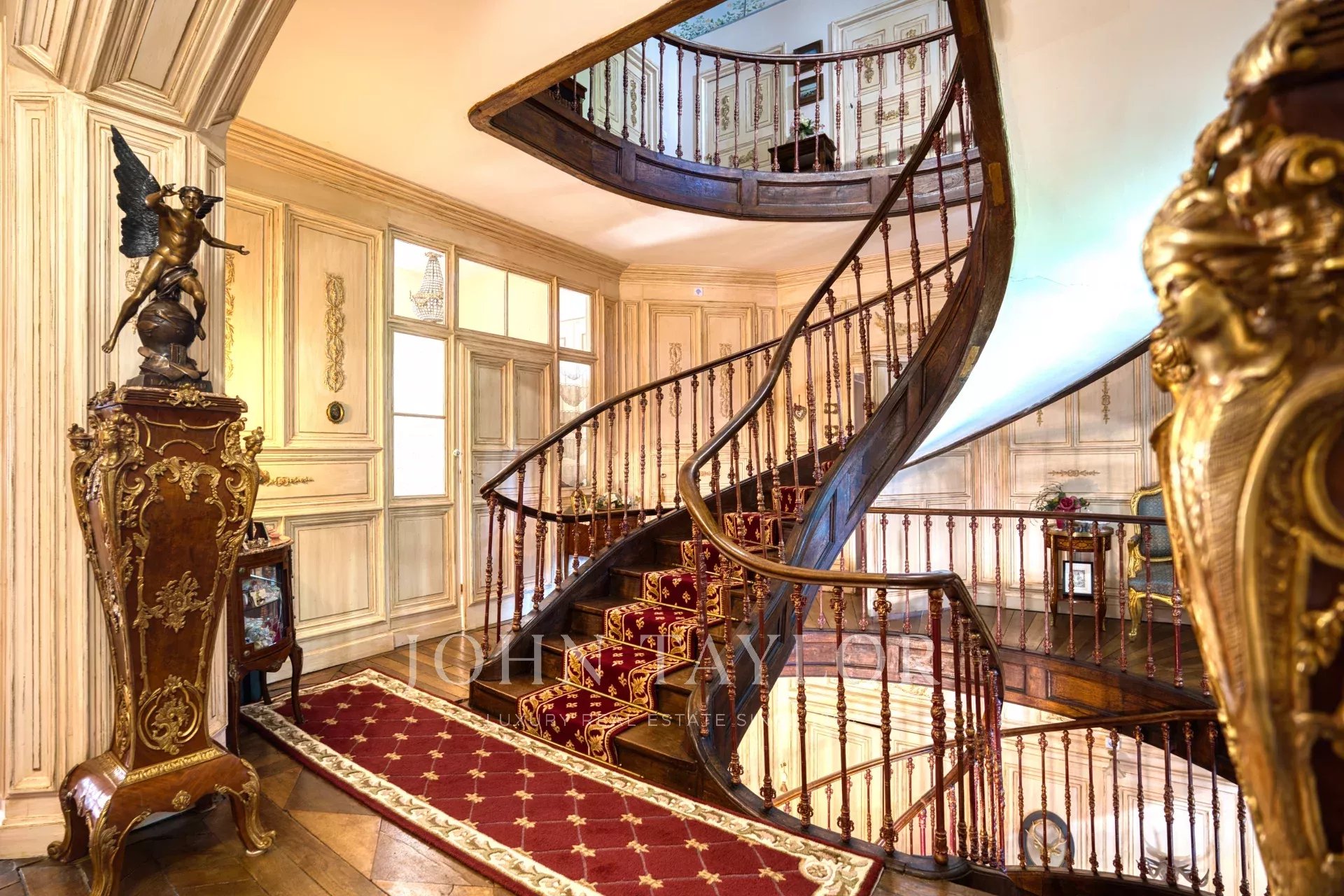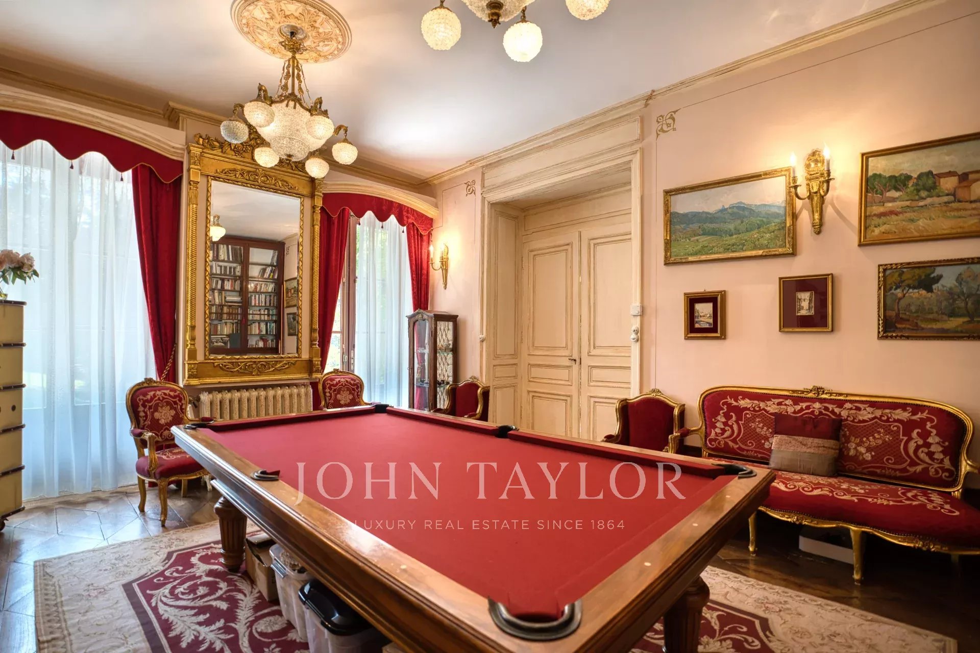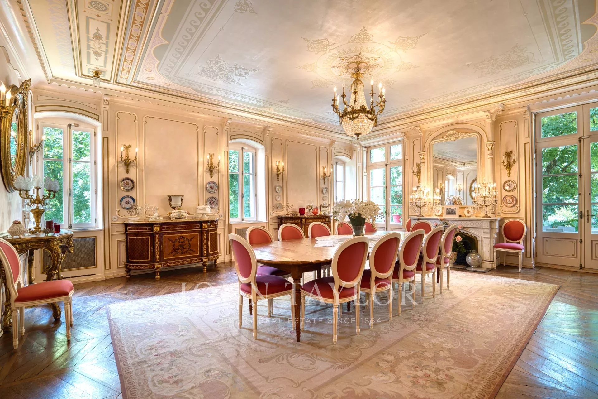 Au rez-de-chaussée, se trouvent les pièces de vie : plusieurs salons, la salle à manger, une grande cuisine donnant sur la terrasse ombragée et une salle de billard.