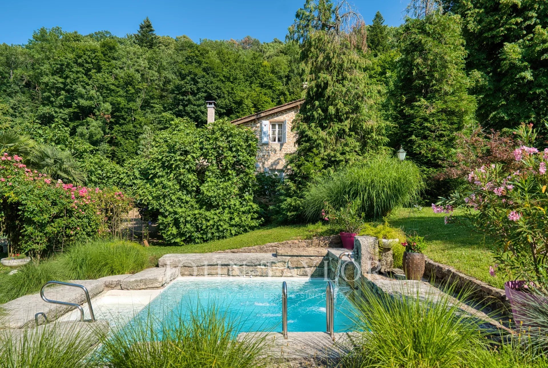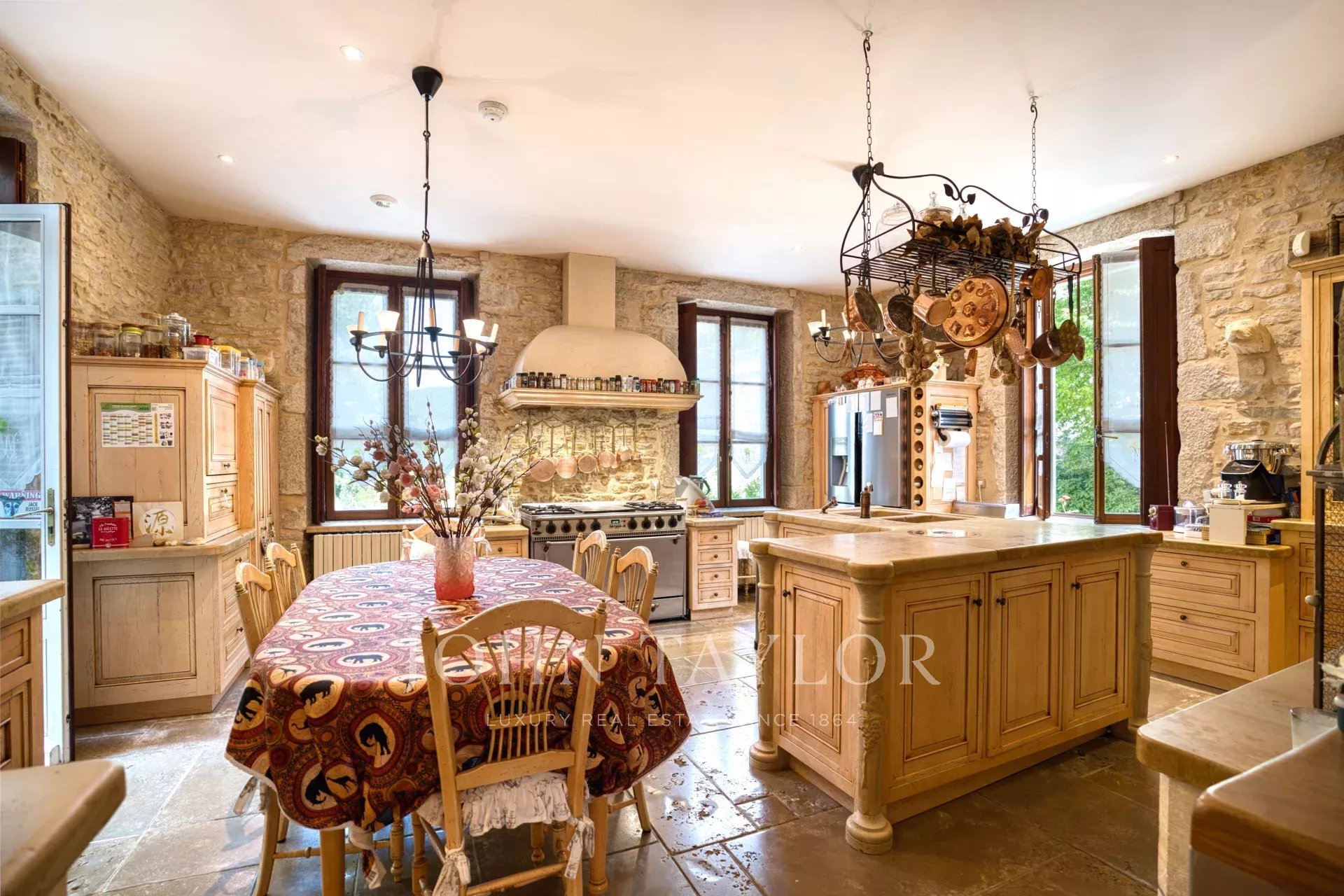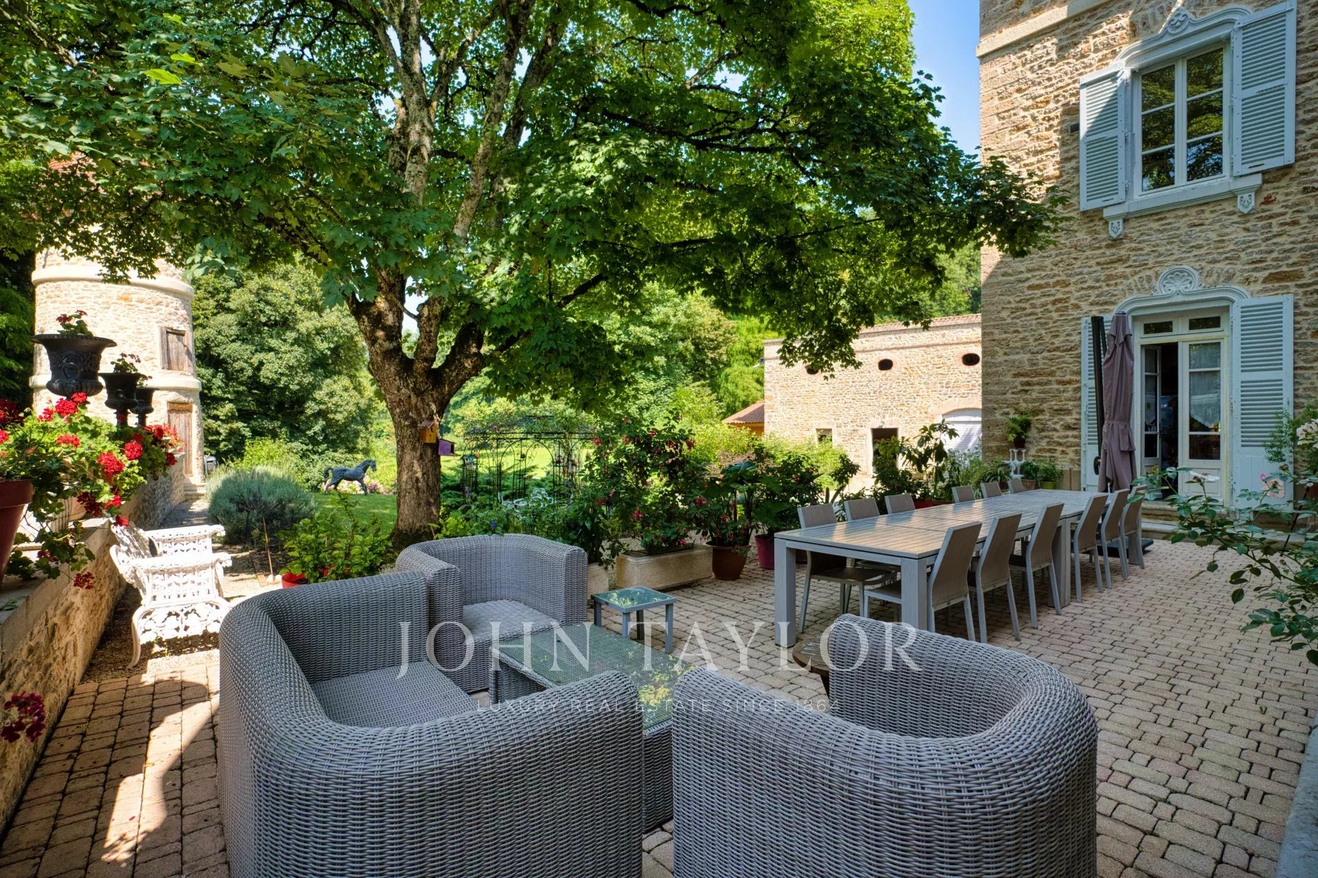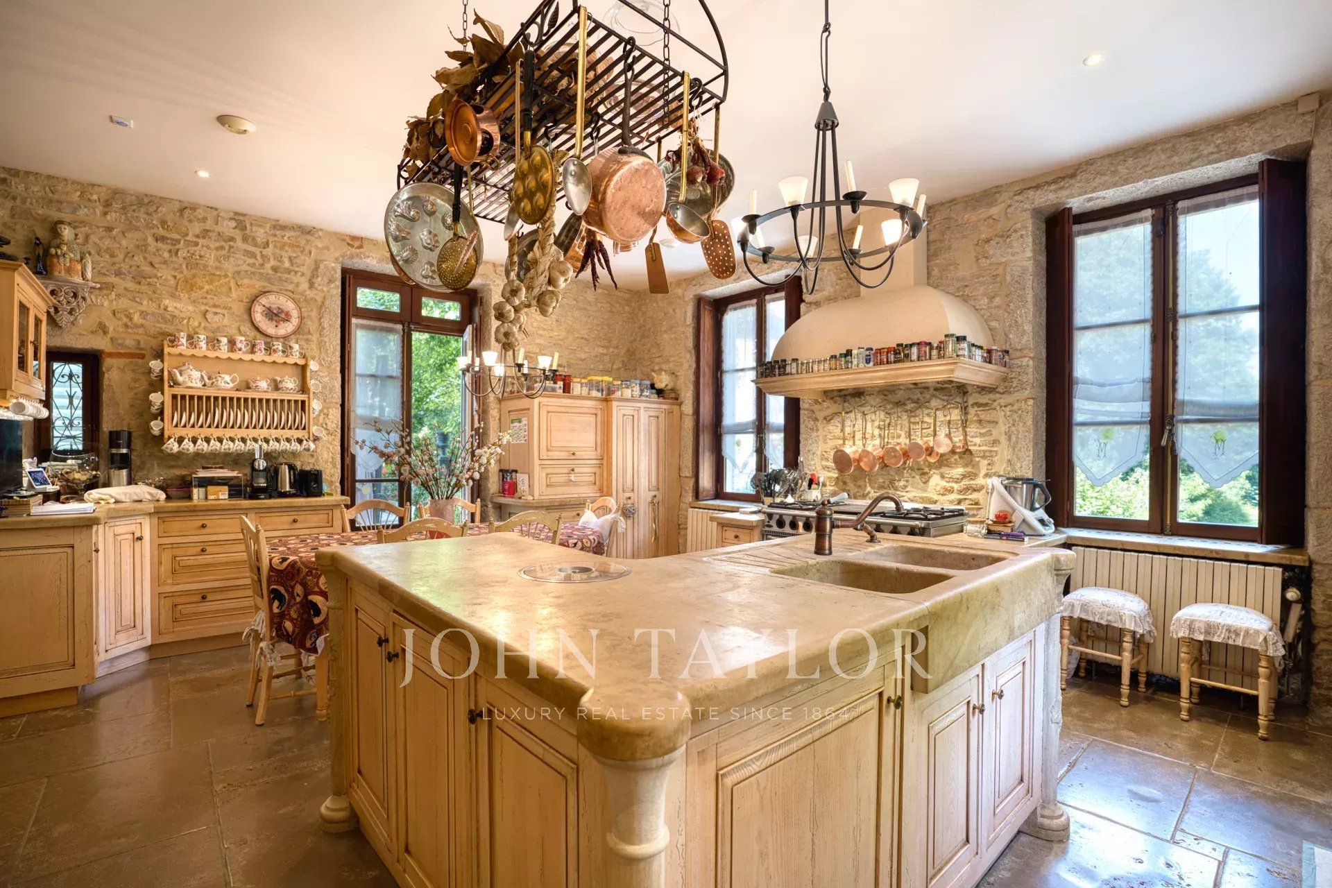 Les dépendances sont constituées d’une petite chapelle avec un studio aménagé à l’étage, un cottage indépendant pour les invités, une maison de gardien de 140 m² avec 3 chambres, une serre, un poulailler, un grand potager, un espace détente et loisirs avec court de tennis, un bassin inspiré des bains romains, en pierres, équipé d’une nage à contre-courant et pompe à chaleur, un puits alimenté par une source. Une ancienne grange, toutes en pierres, reste à rénover.
