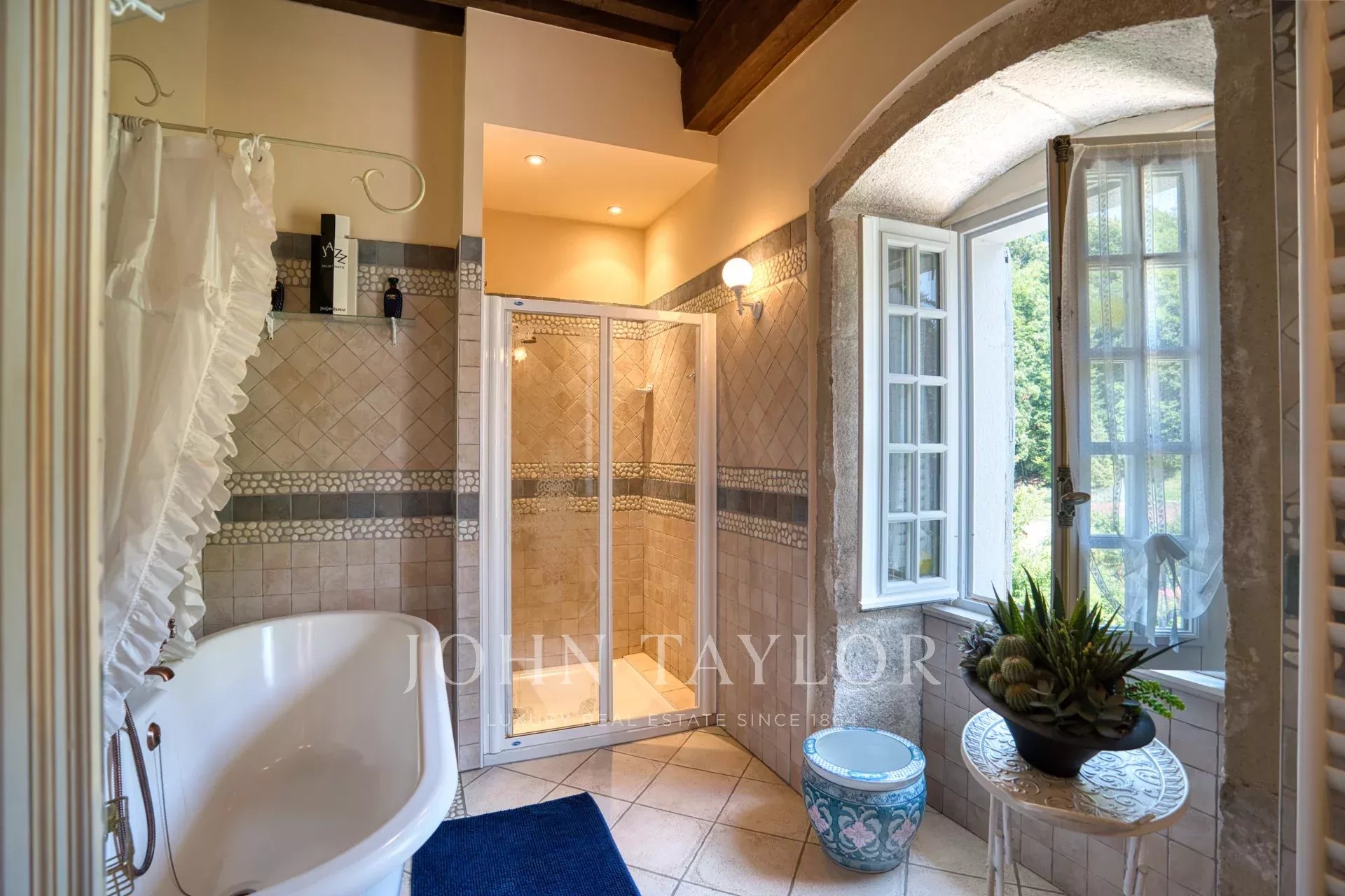 A l’abri des regards, cette belle propriété située entre Genève, Lyon et le Bugey offre un havre de quiétude et de paix. La bâtisse principale datant au début du XVIème siècle, sur trois niveaux, est érigée sur de belles caves voutées.