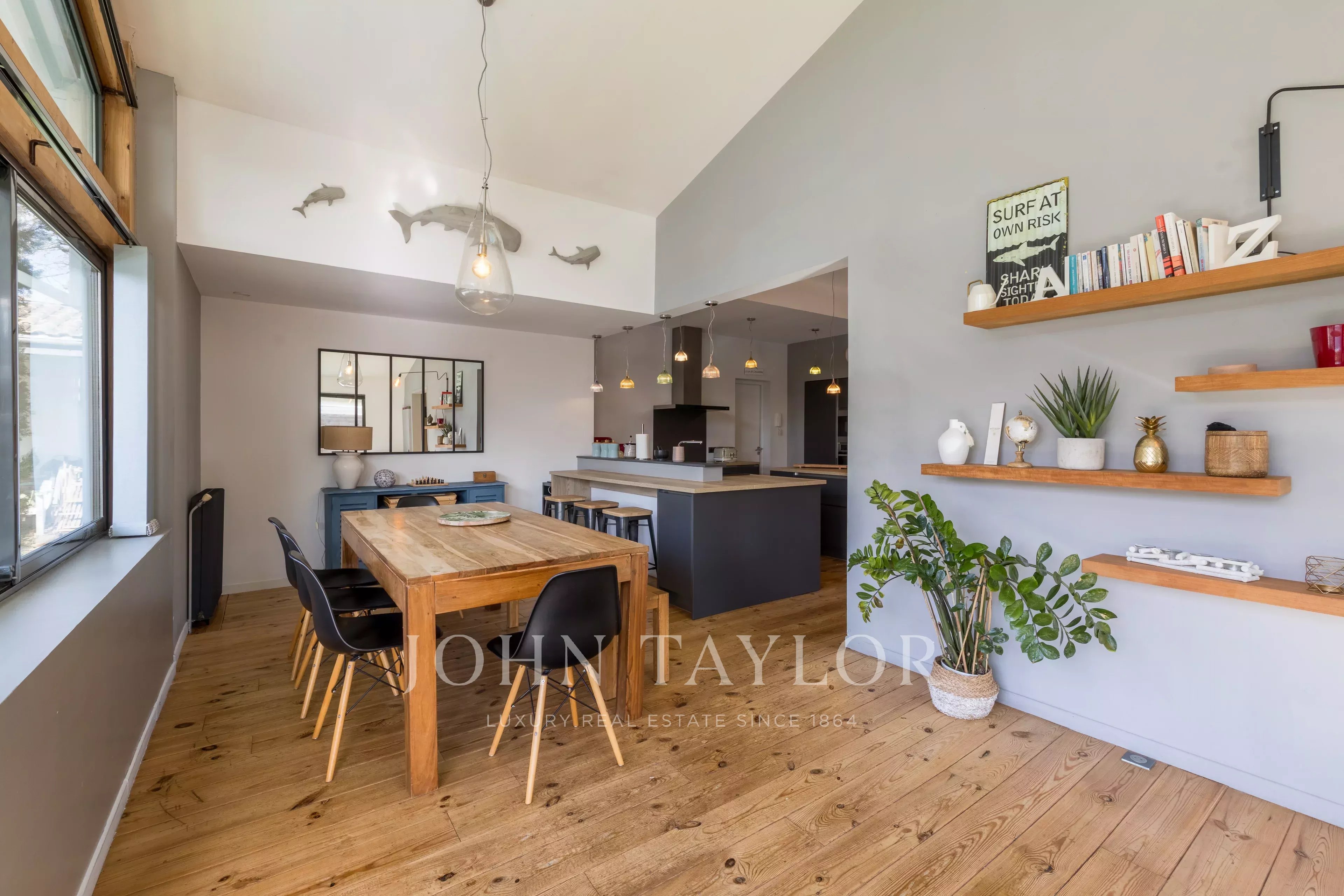Au cœur d’Andernos-les-Bains, dans un environnement résidentiel paisible et recherché, cette authentique maison landaise a fait l’objet d’une rénovation complète, conduite avec exigence et sens du détail. Elle incarne aujourd’hui un équilibre rare entre patrimoine architectural régional et confort contemporain.