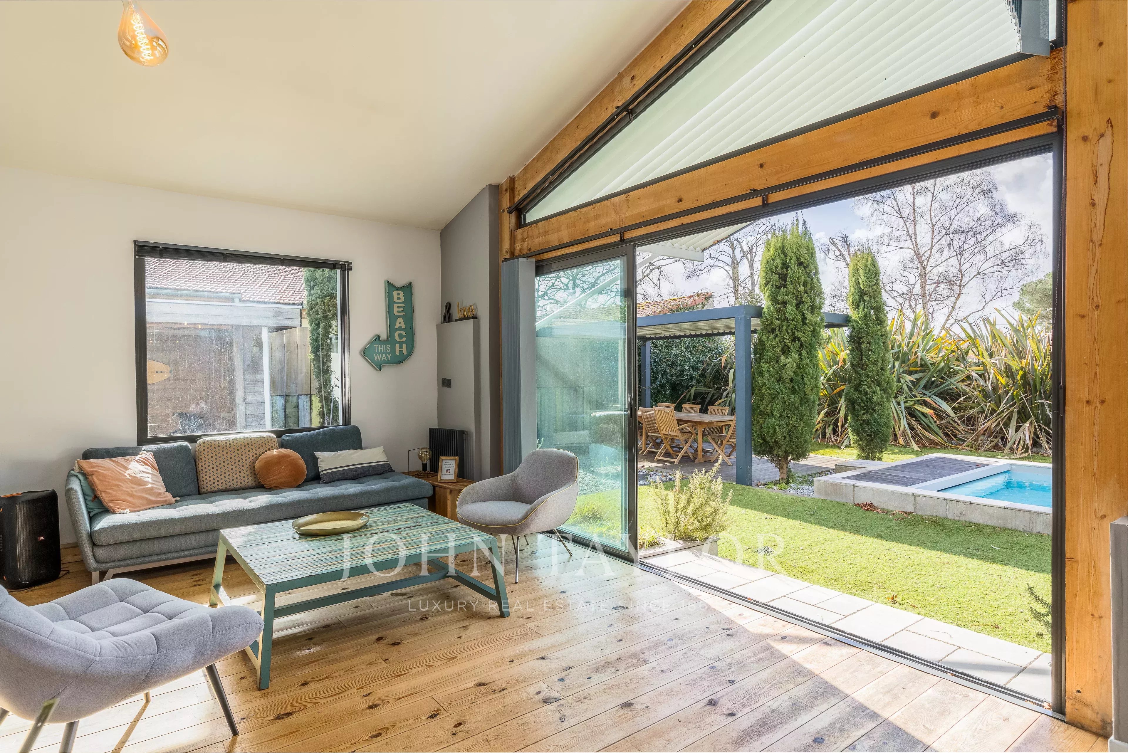 À l’extérieur, le jardin paysager compose un écrin intimiste, sans vis-à-vis. La piscine chauffée de dix mètres prolonge la perspective du séjour et invite à une vie tournée vers l’extérieur, rythmée par la lumière du Bassin. La pergola bioclimatique permet de profiter des espaces extérieurs en toute saison, tandis qu’une dépendance indépendante d’environ 20 m² ouvre de multiples possibilités : atelier, chambre d’amis, espace professionnel ou salle de loisirs.
