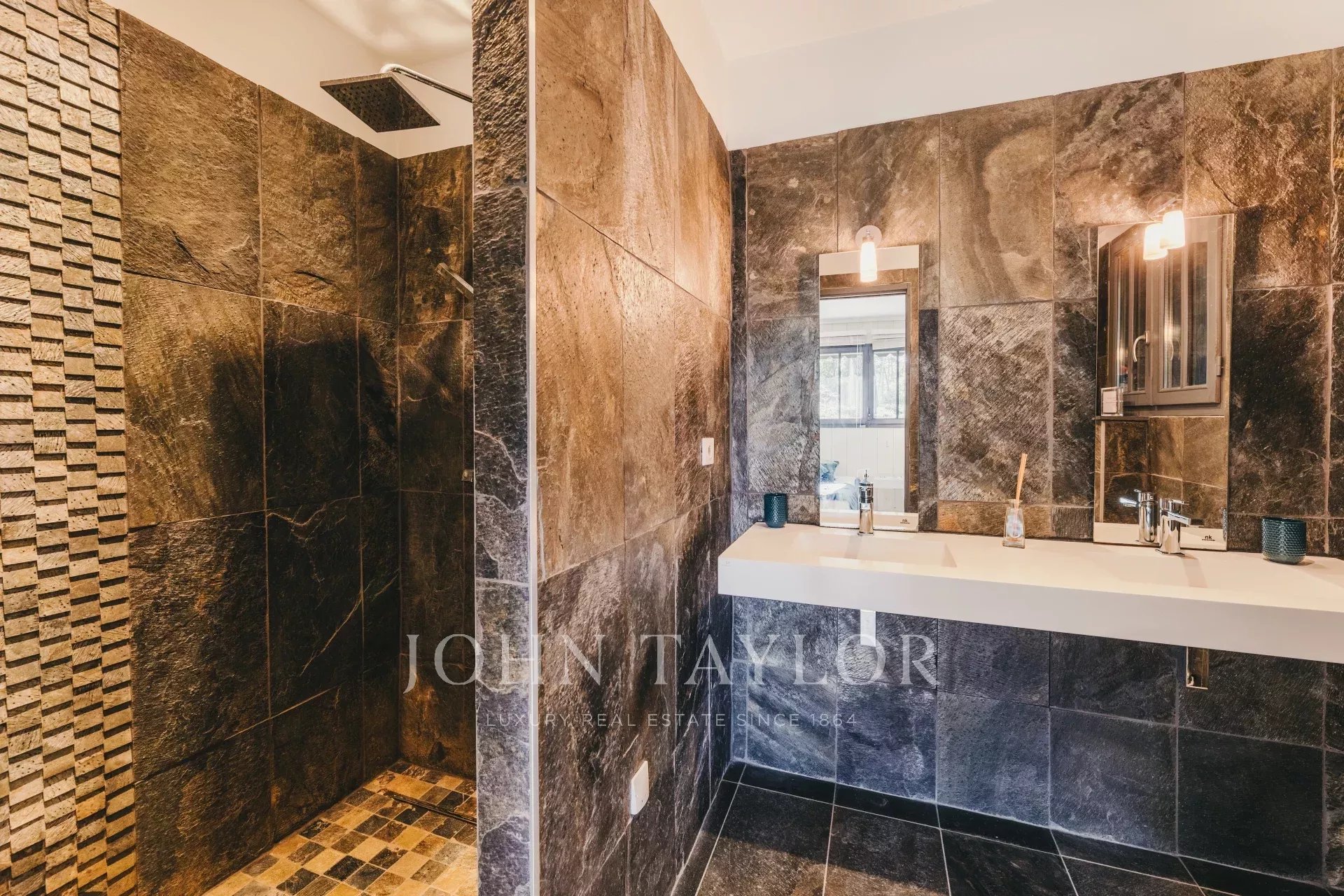 Le rez-de-chaussée comprend deux chambres avec salles de bain attenantes ainsi qu’un studio indépendant. À l'étage, deux autres chambres sont disponibles, dont une suite parentale bénéficiant d’un balcon privé.