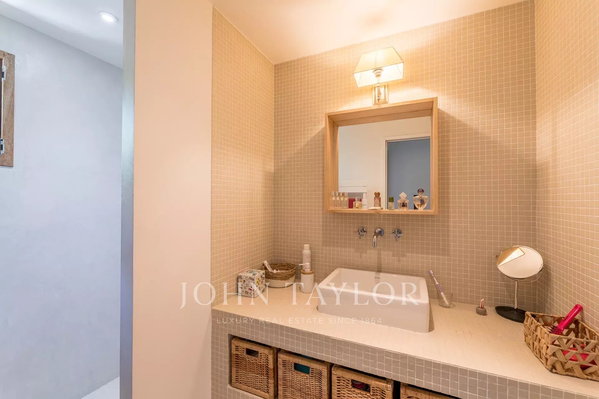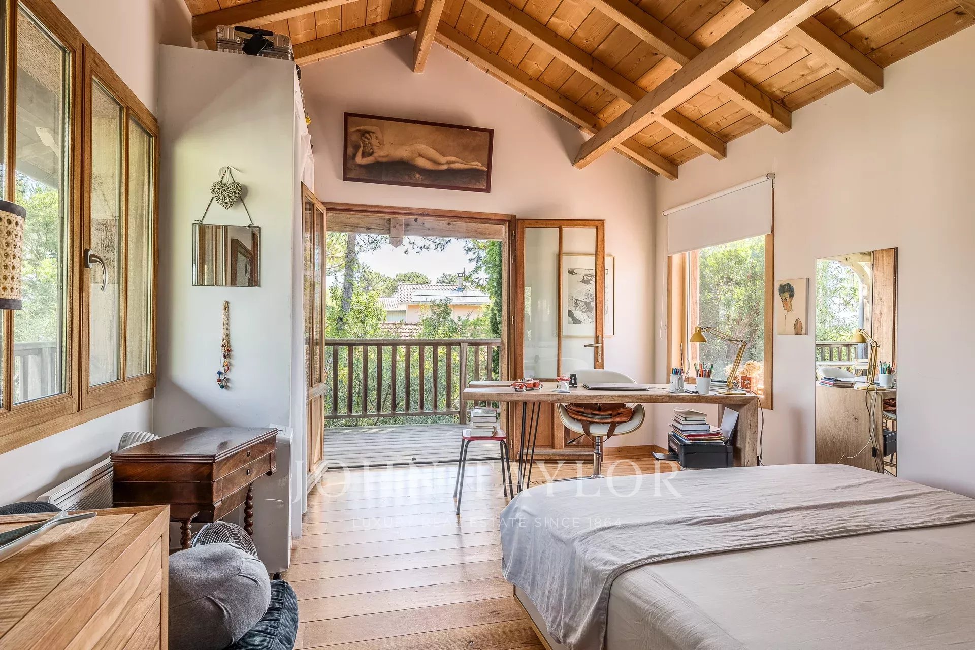 À l’étage, la suite parentale comprend une salle de bains, un espace bureau et s’ouvre sur un balcon avec une vue partielle sur le Bassin.