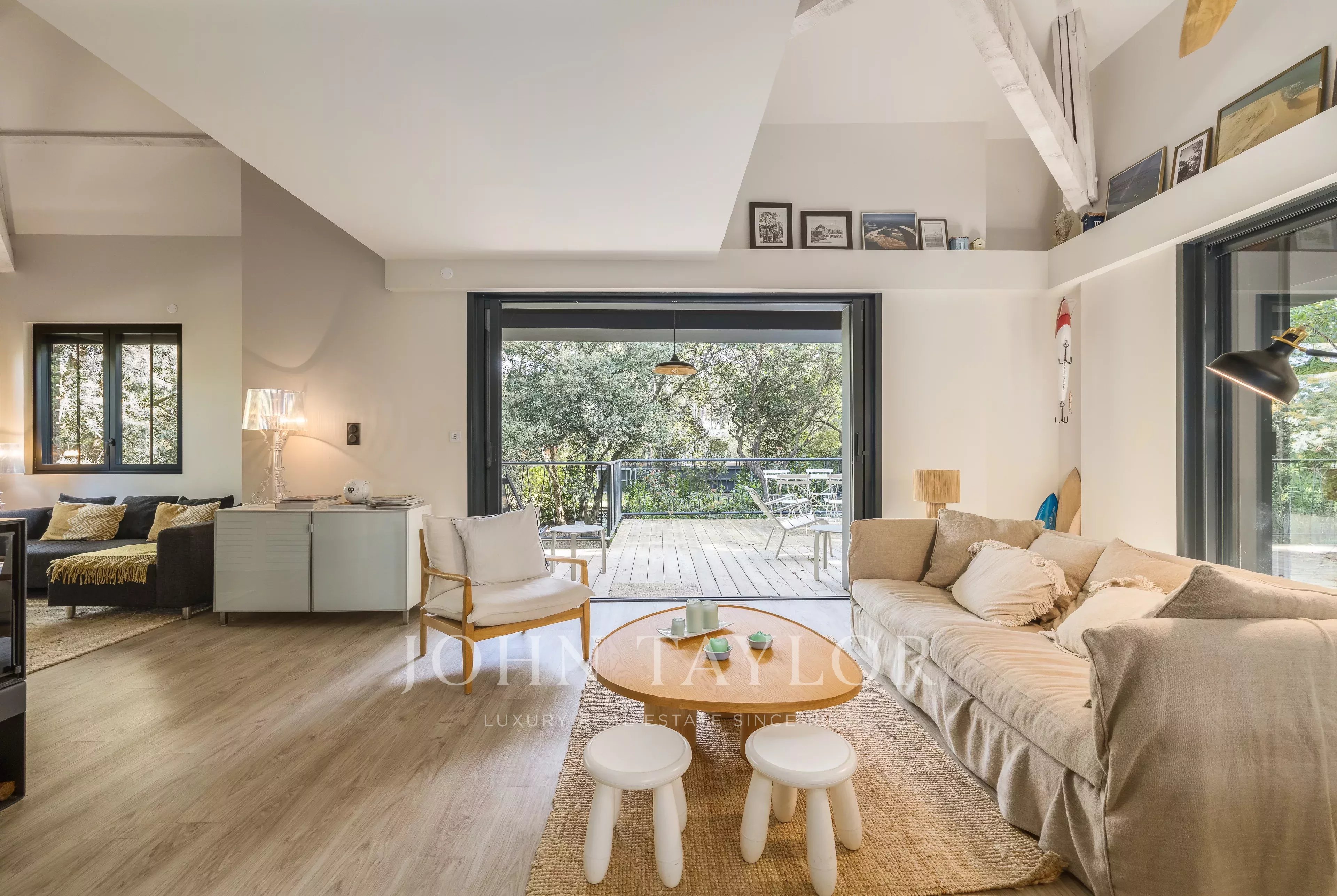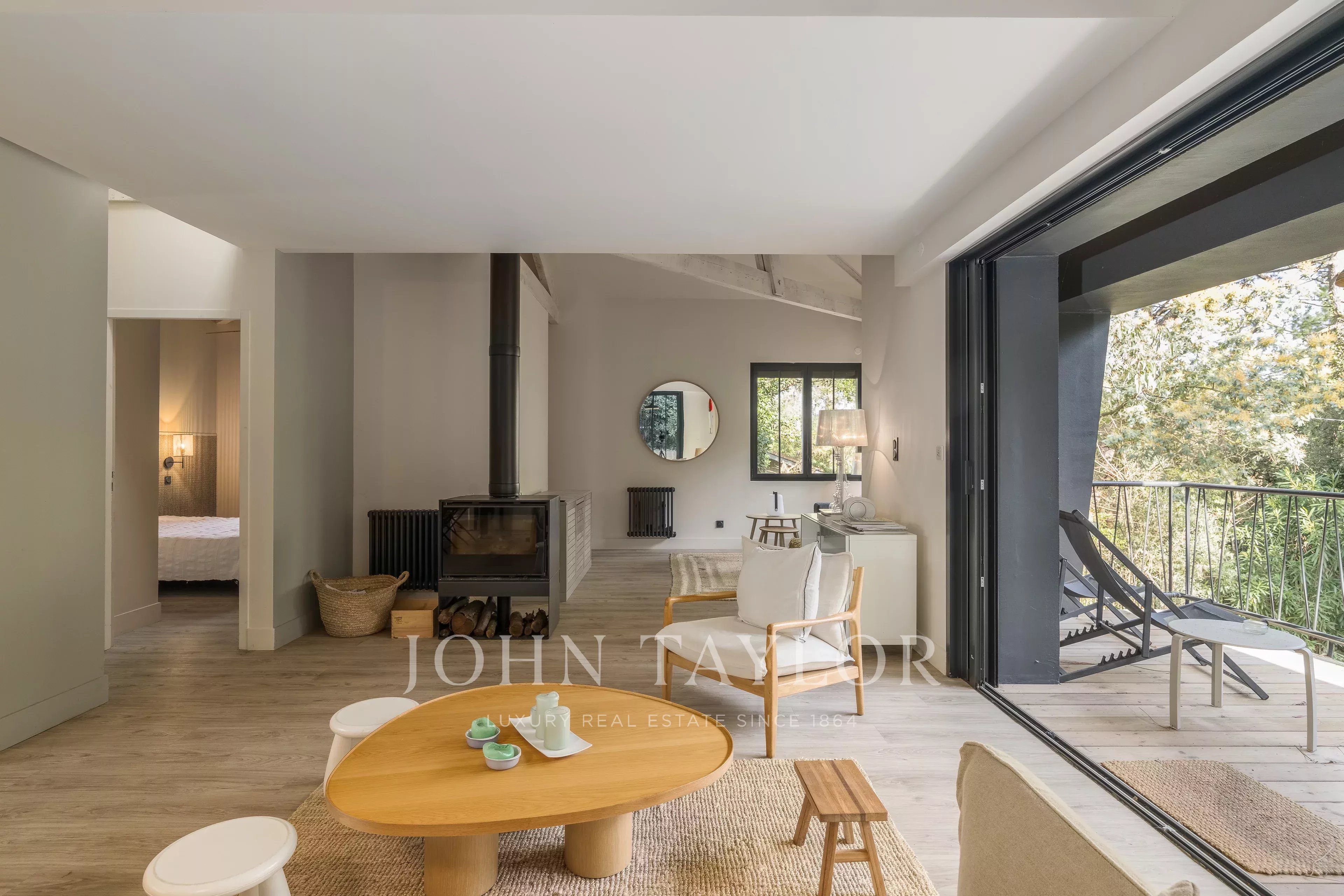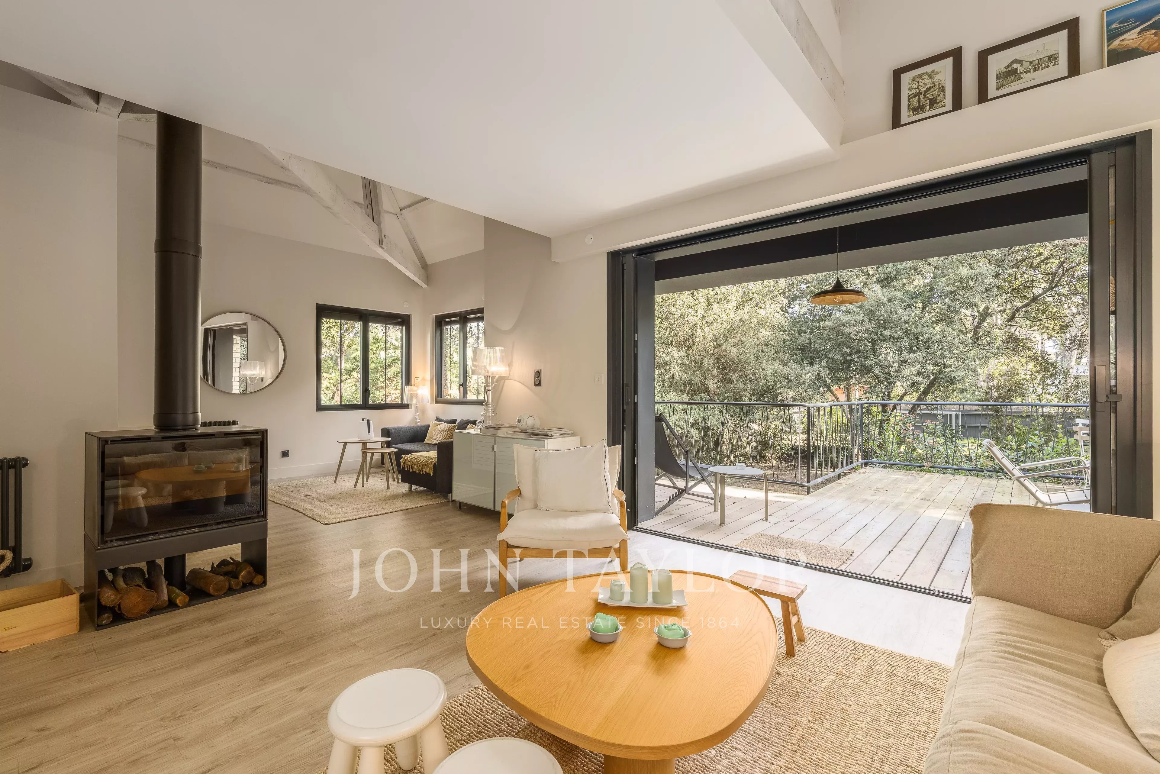 • Espace de vie : Un vaste séjour baigné de lumière ouvert sur une terrasse nichée dans la verdure.