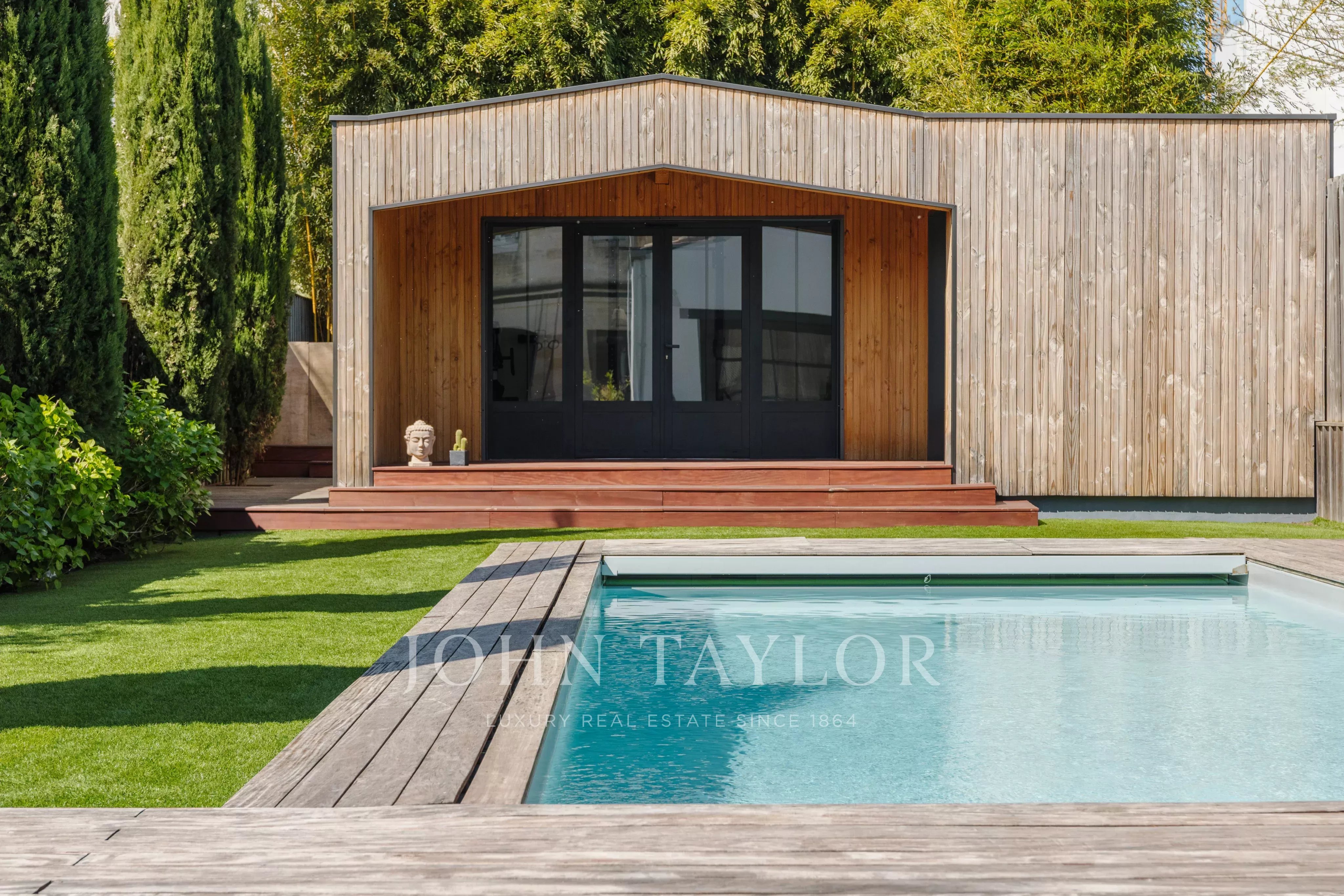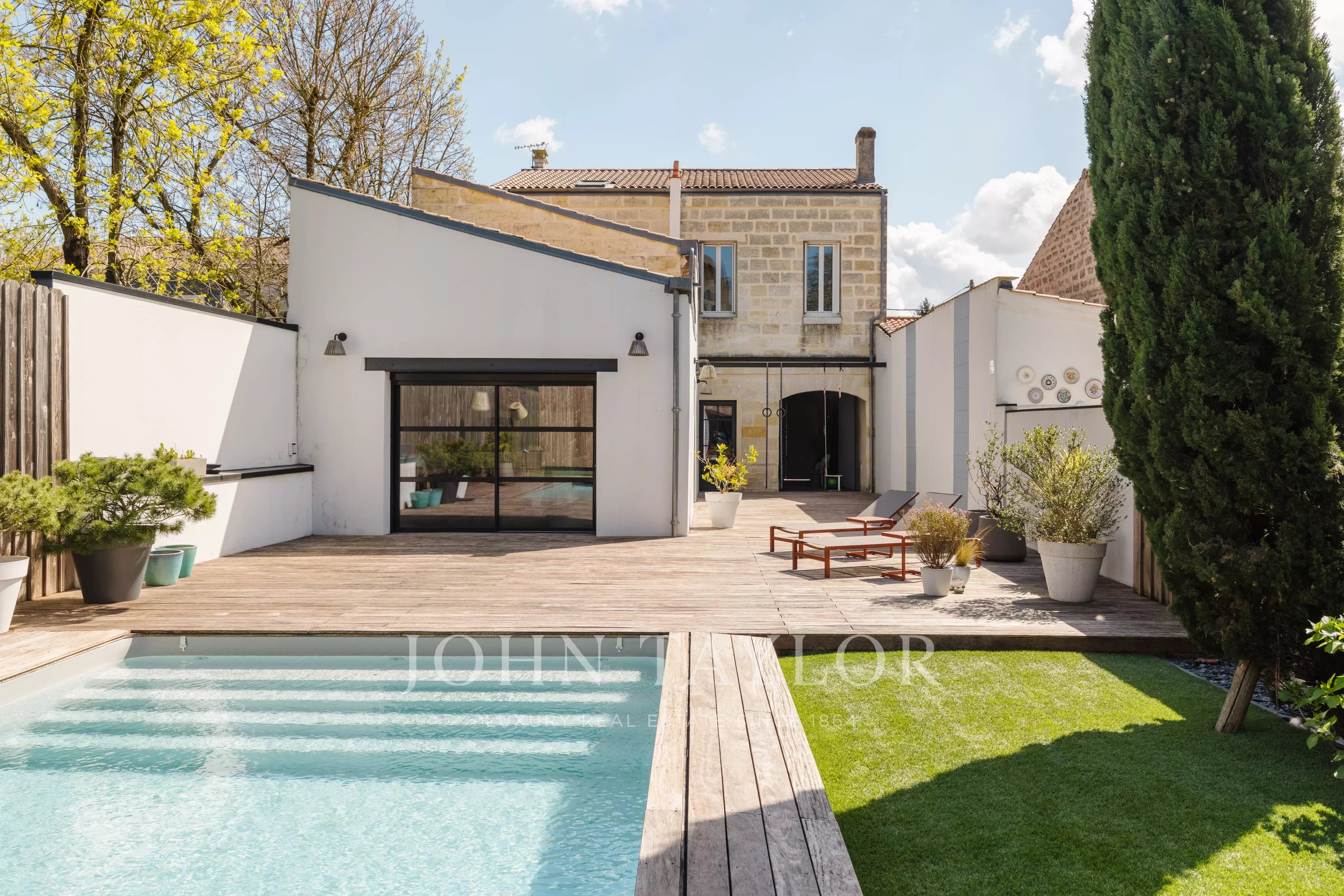 À l’extérieur, la maison dévoile un espace de vie exceptionnel, rare en milieu urbain : une vaste terrasse d’environ 185 m², agrémentée d’une piscine, invite à la détente et aux moments de convivialité.