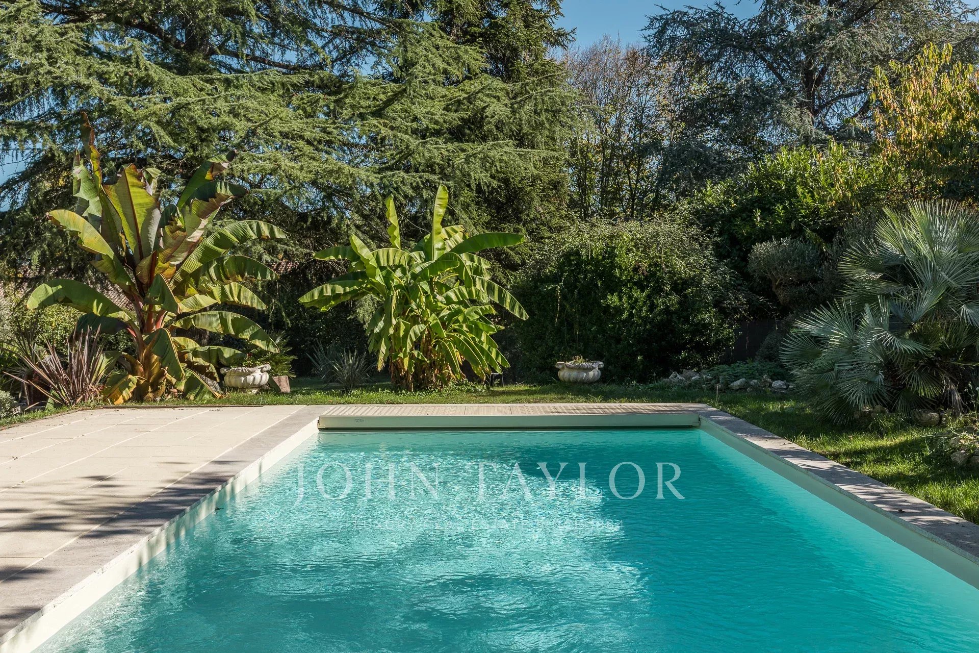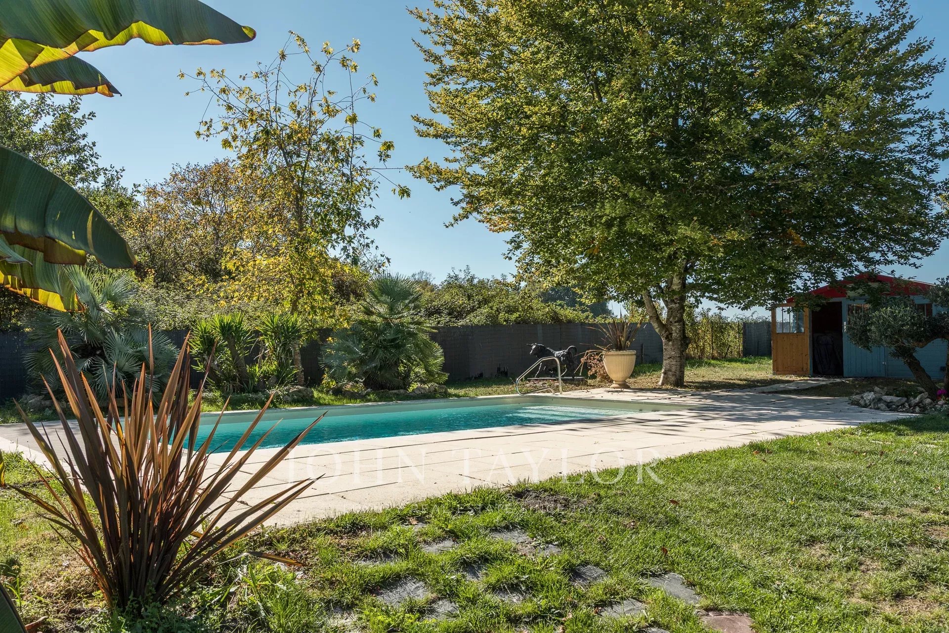 À l’extérieur, sur un terrain de 3 000 m² préservé de tout vis-à-vis, la magie opère encore. Nichée sous de grands arbres, une cuisine d’été équipée d’un barbecue et d’un four à pizza invite aux soirées conviviales. La piscine, entourée de verdure, complète ce tableau idyllique, offrant un véritable havre de paix à l’abri des regards.