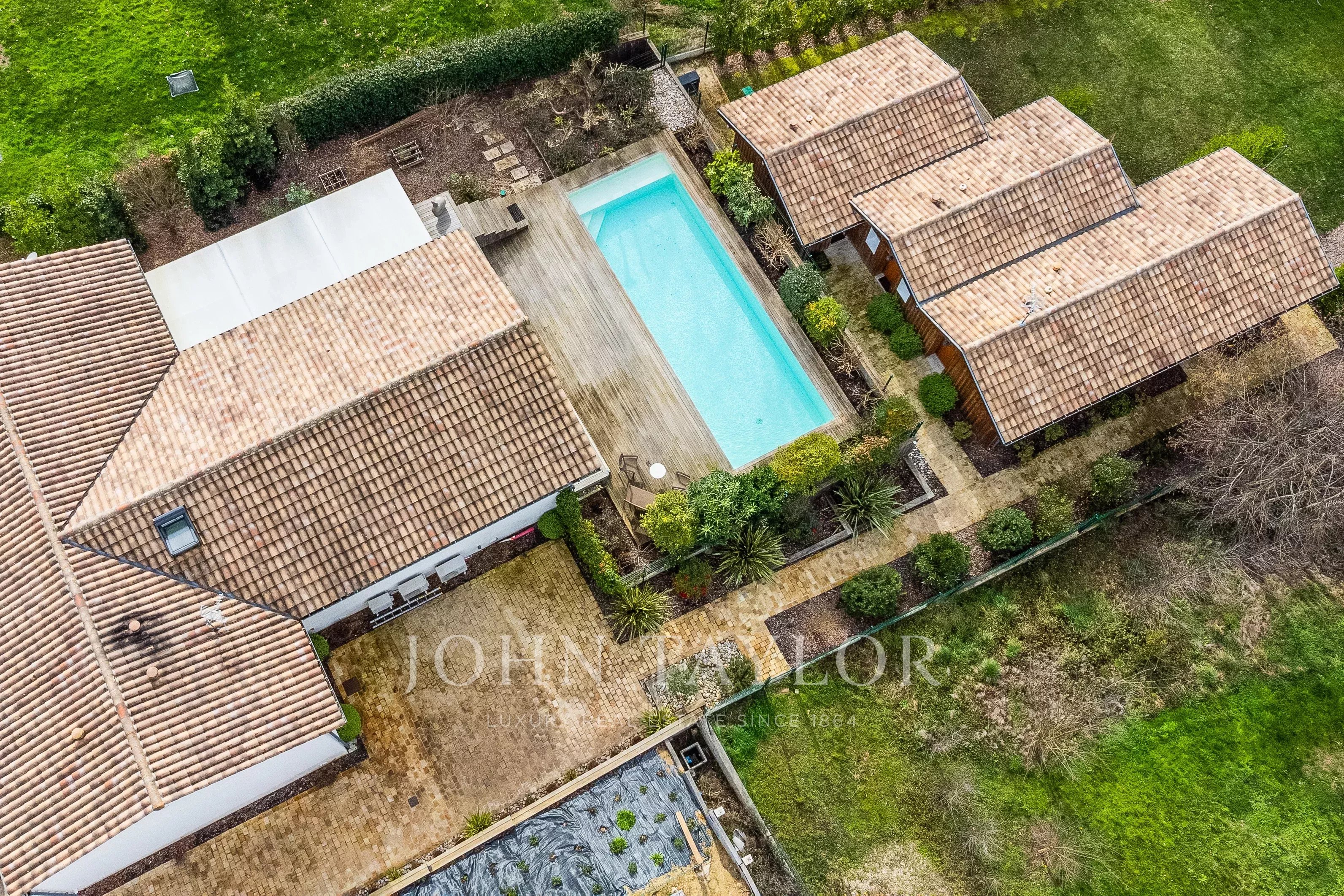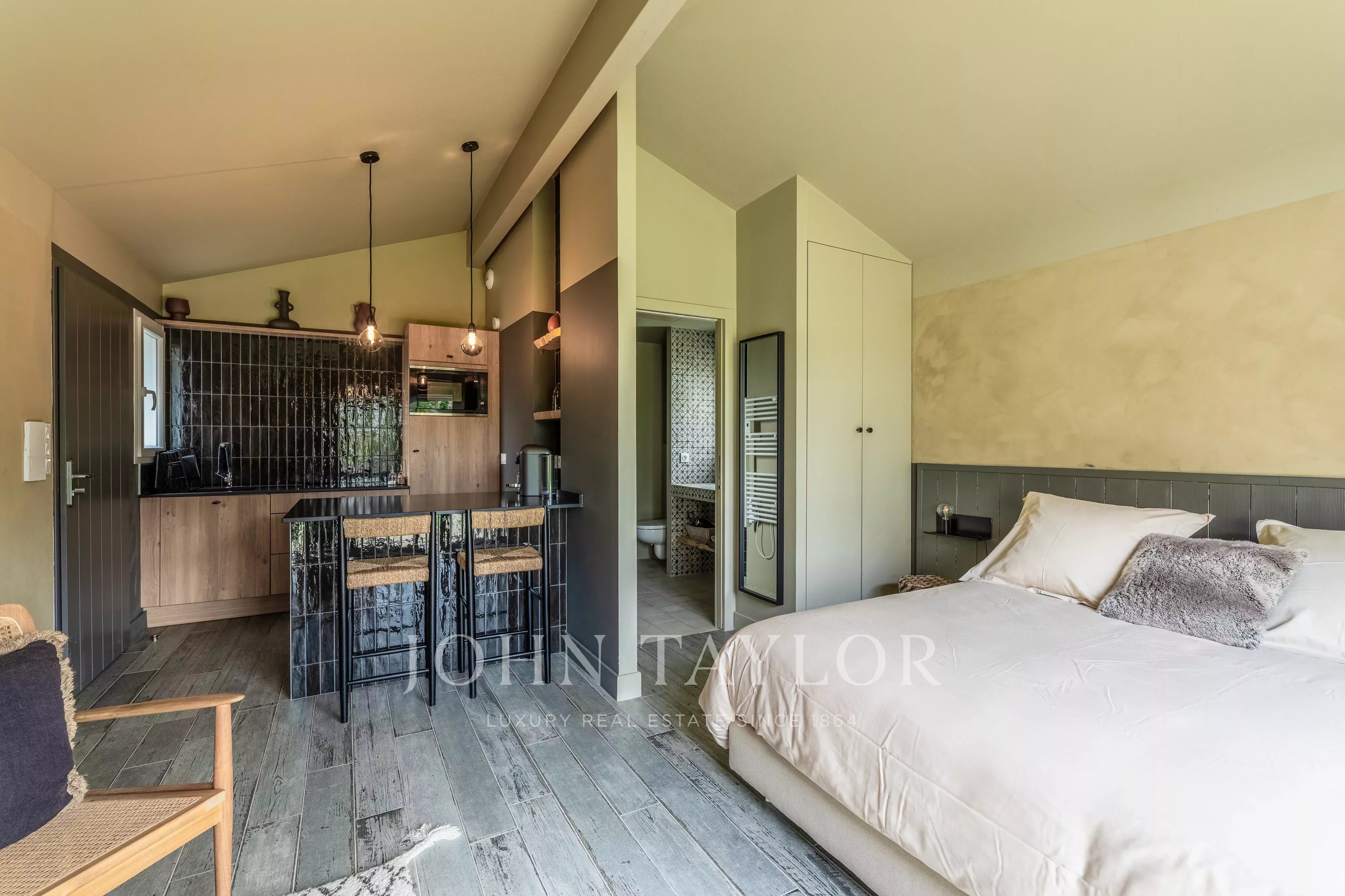 La maison principale, livrée en 2020, se distingue par une architecture contemporaine aux lignes épurées et de larges baies vitrées à galandage offrant une luminosité remarquable. La pièce de vie s’ouvre sur une terrasse couverte et une piscine harmonieusement intégrée au paysage.