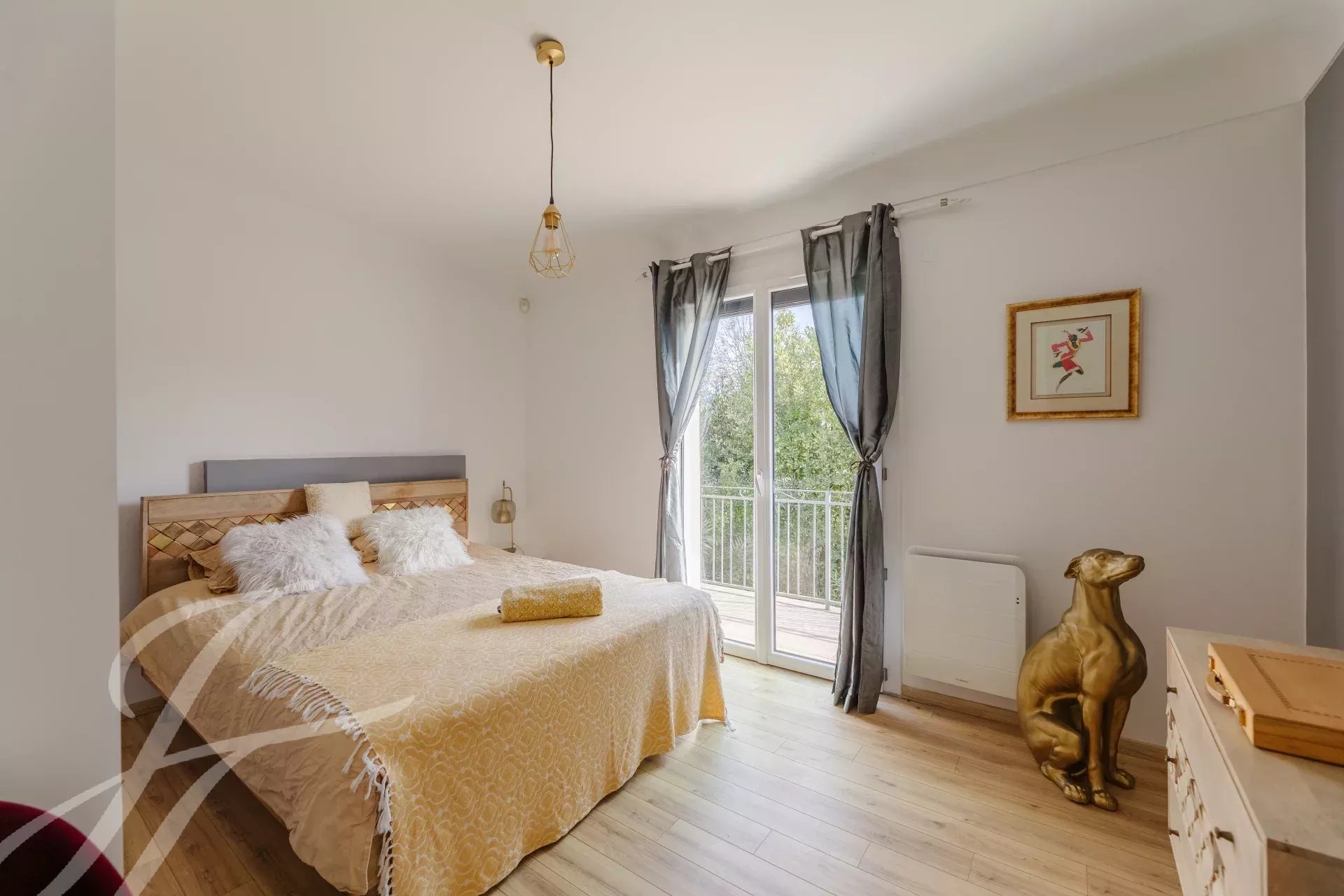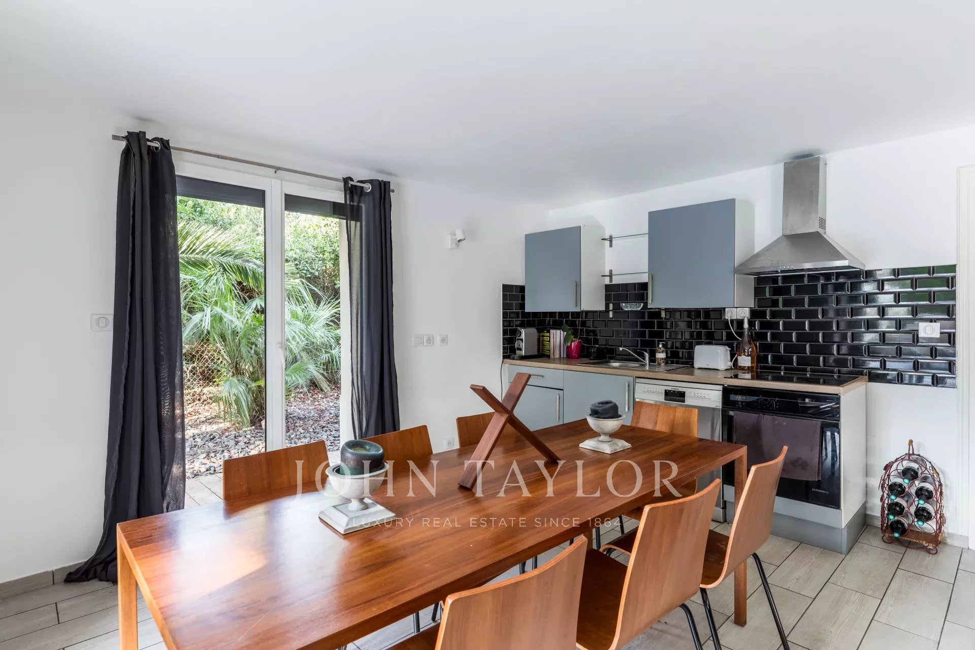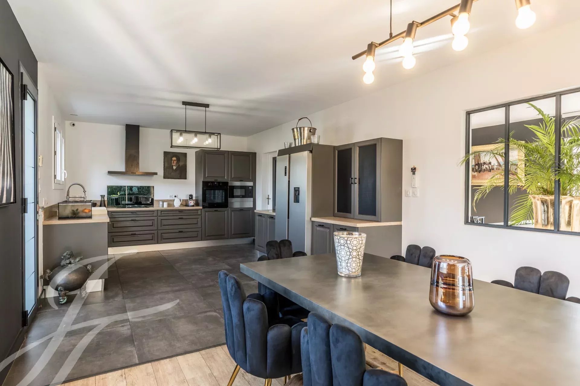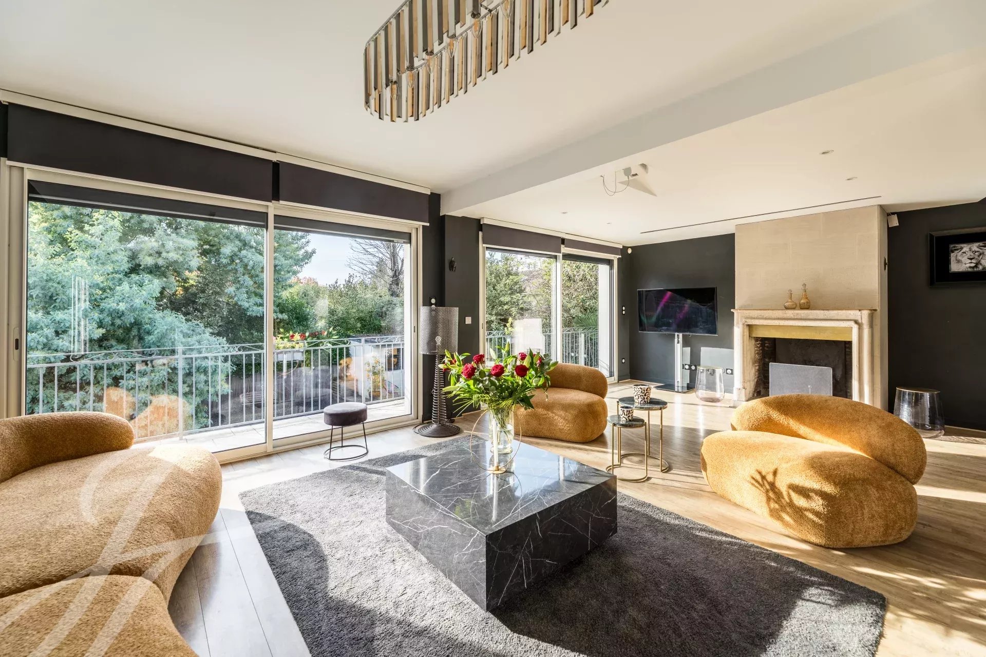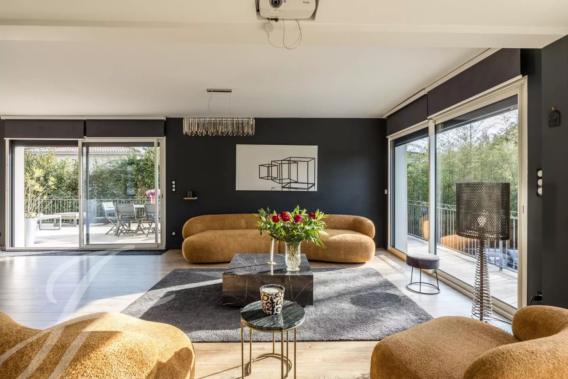 Cette demeure luxueuse est dotée de prestations haut de gamme : climatisation, volets et stores électriques, cheminée en pierre, ainsi que deux rétroprojecteurs intégrés au plafond avec écrans rétractables.