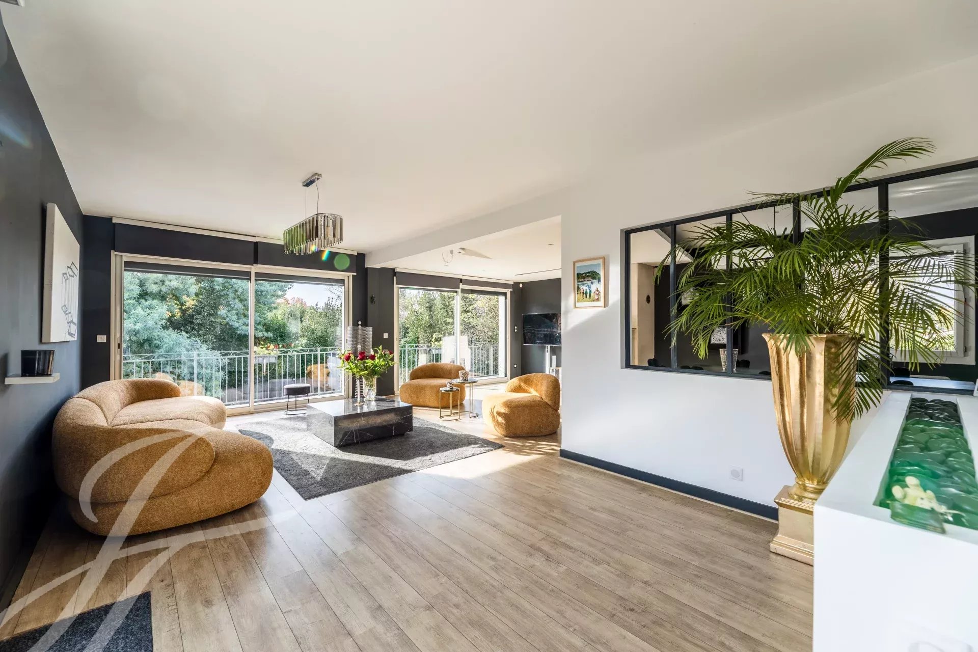 L’escalier en marbre conduit au premier étage, où le palier s'ouvre sur un espace de vie circulaire harmonieux et fluide, entouré d’une grande terrasse et d’un balcon filant dominant la piscine. Cet espace est composé d’un vaste séjour baigné de lumière grâce à ses grandes baies vitrées et ses trois expositions, de la salle à manger et de la cuisine ouverte.