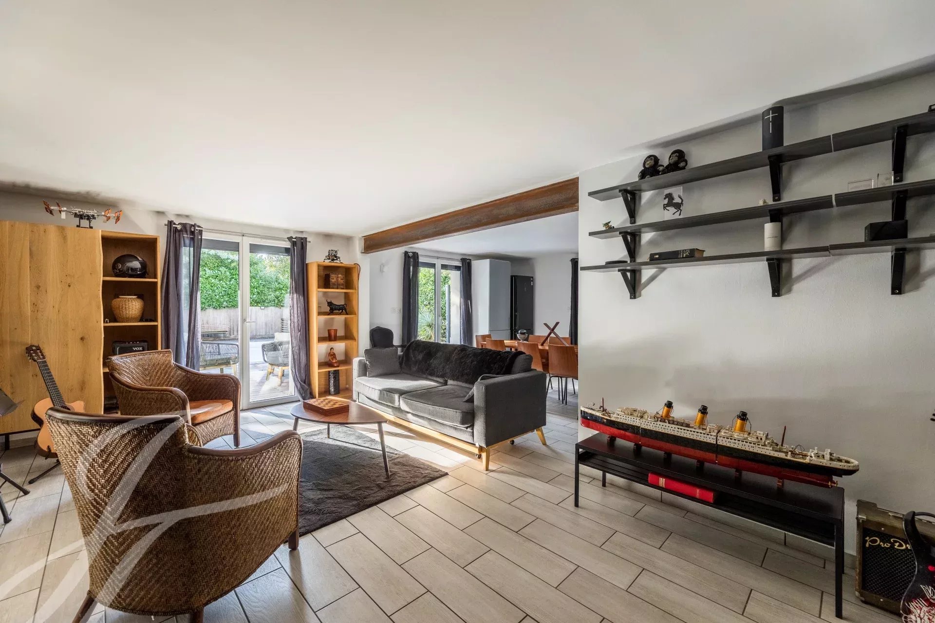 Au rez-de-chaussée, une entrée mène à un appartement indépendant, comprenant un séjour/salle à manger avec cuisine ouverte, une chambre avec salle d’eau privative, parfait pour accueillir famille ou invités.