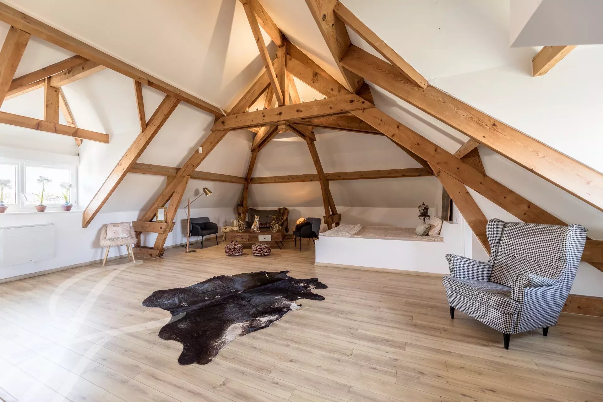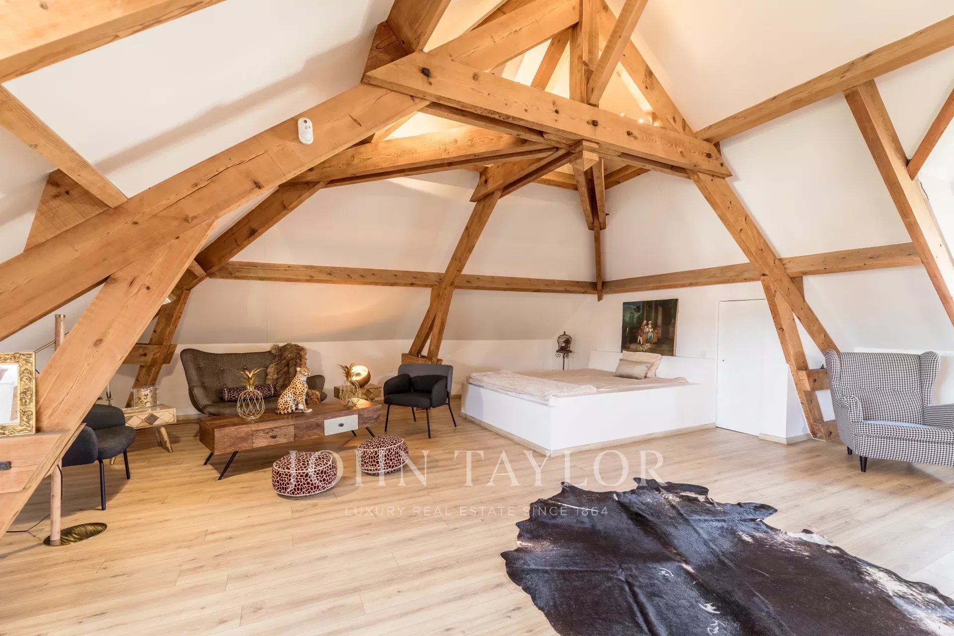 Le dernier étage se dévoile comme une impressionnante suite de sous charpente apparente, offrant un espace détente/lecture, une salle de bains avec baignoire et douche, ainsi que deux dressings. Cette suite bénéficie d’une lumière naturelle grâce à ses six fenêtres.