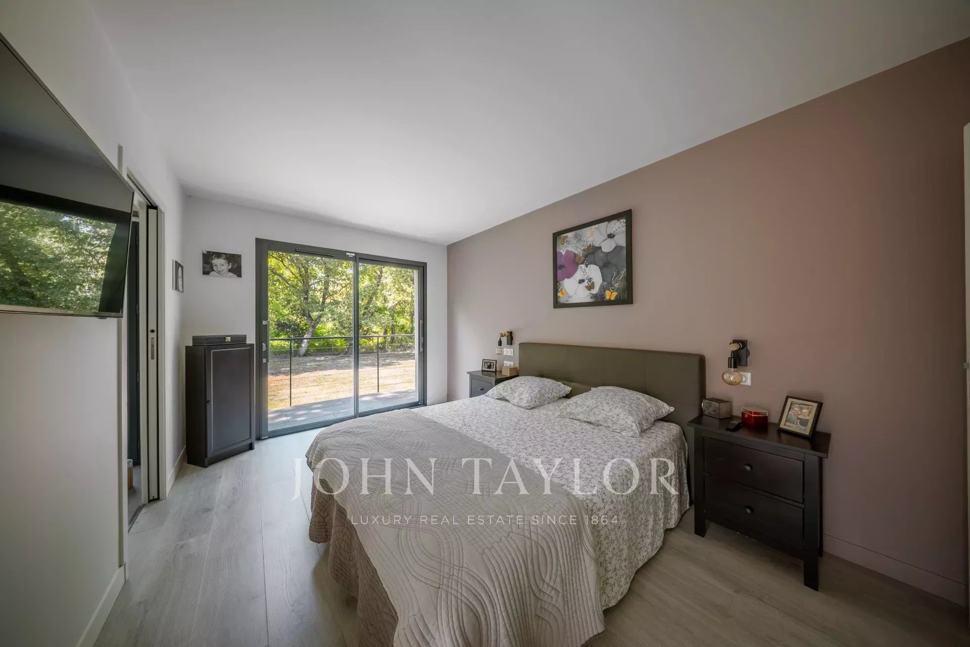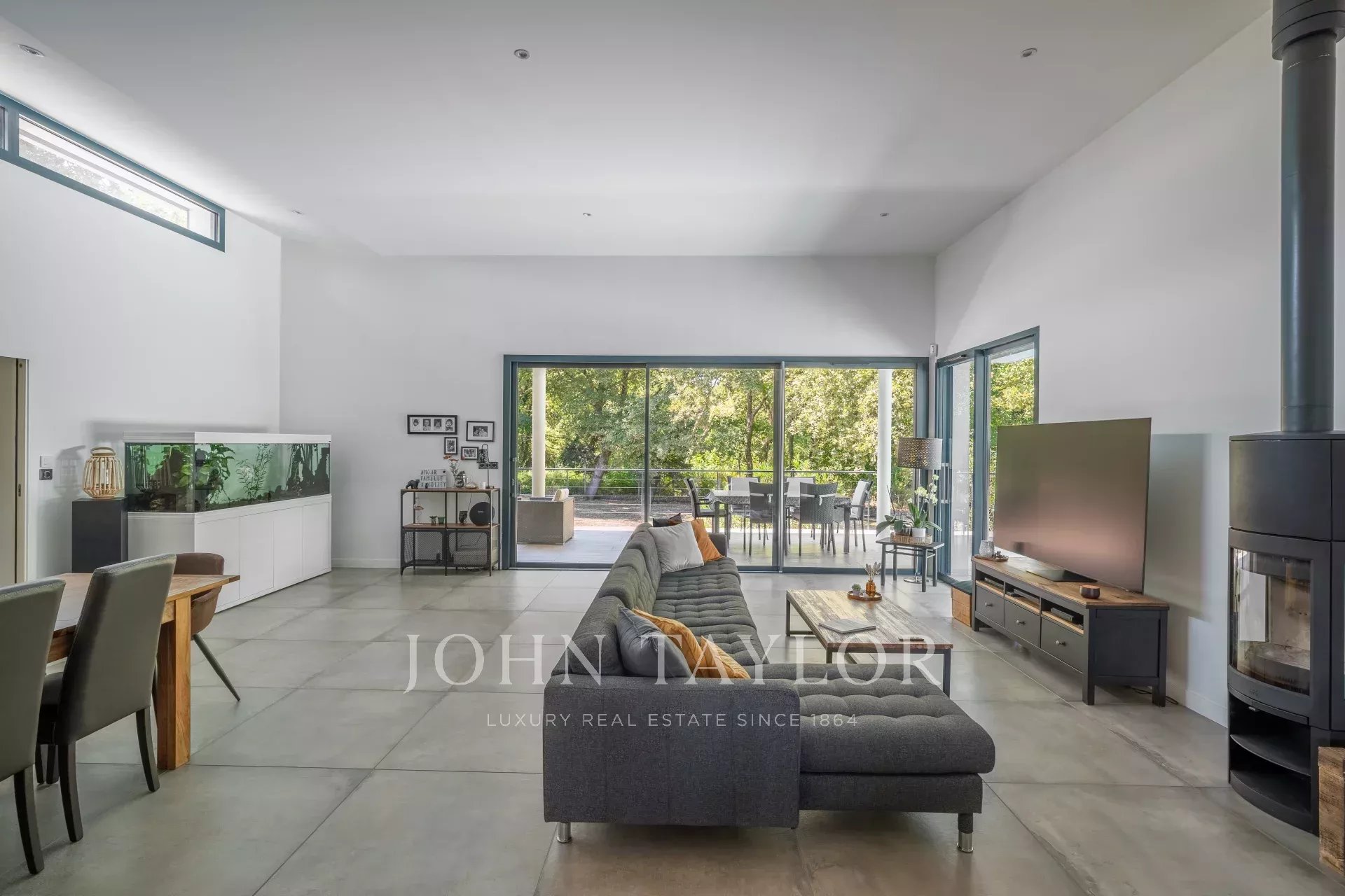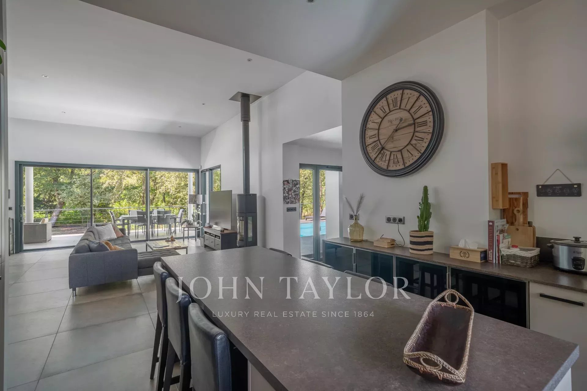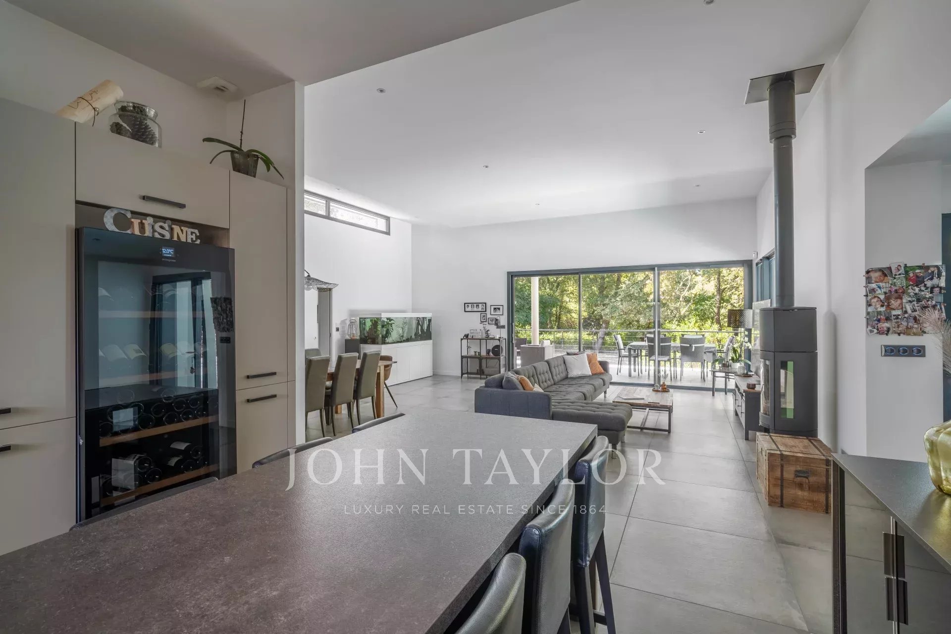 Implantée sur un terrain paysager de 2 800m², en lisière directe de la forêt, elle séduit dès l’entrée par ses volumes ouverts et sa luminosité exceptionnelle. La grande pièce de vie, pensée pour la convivialité, s’articule autour d’un séjour double et d’une cuisine contemporaine avec îlot central, entièrement équipée. De larges baies vitrées prolongent l’espace vers une terrasse sur pilotis et une piscine surplombant le jardin, à l’abri de tout regard.