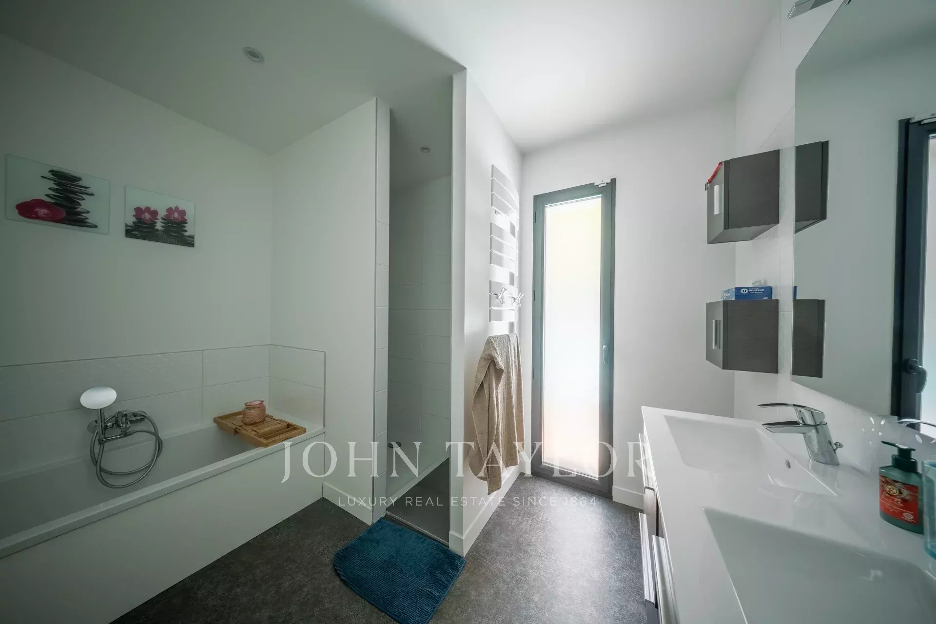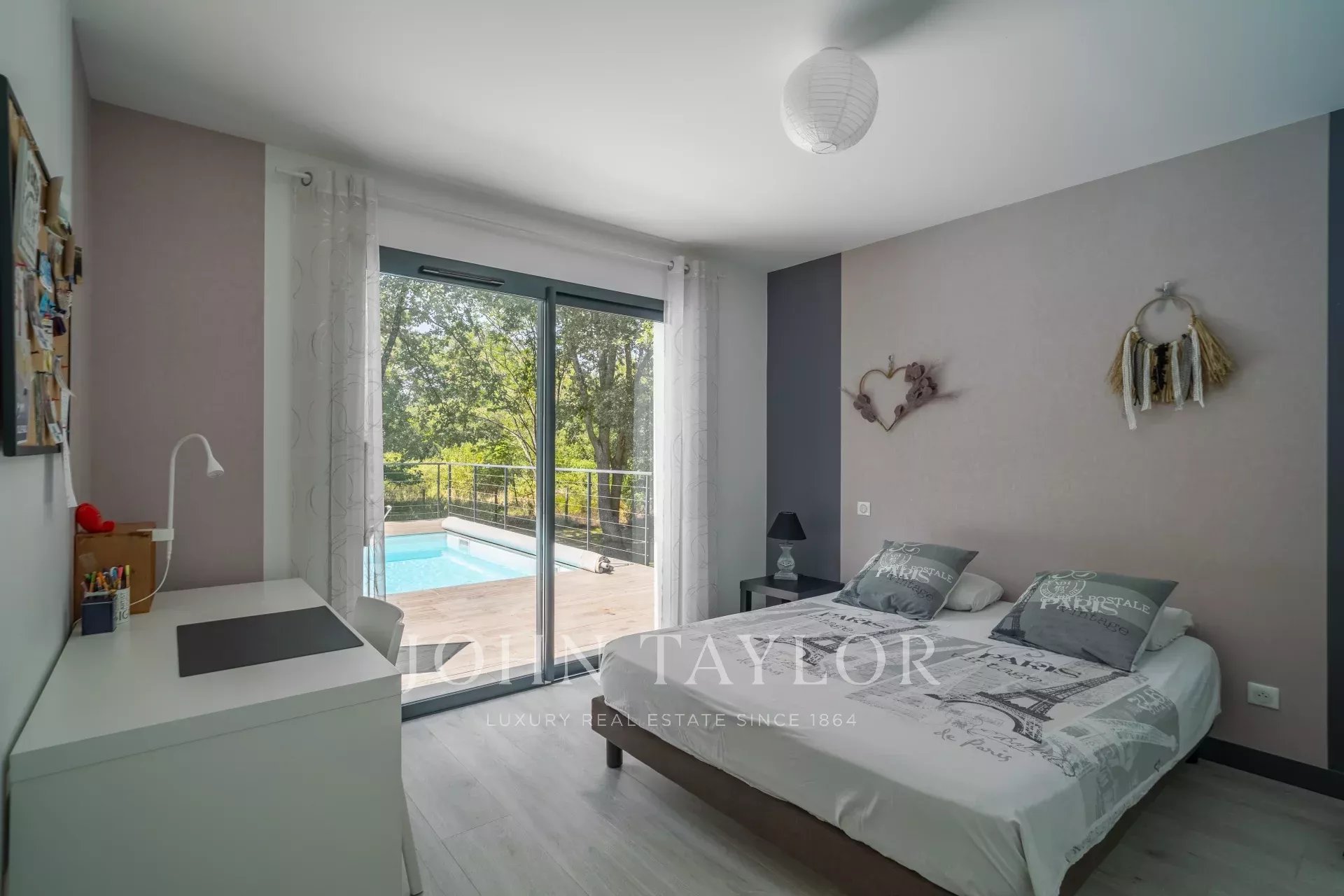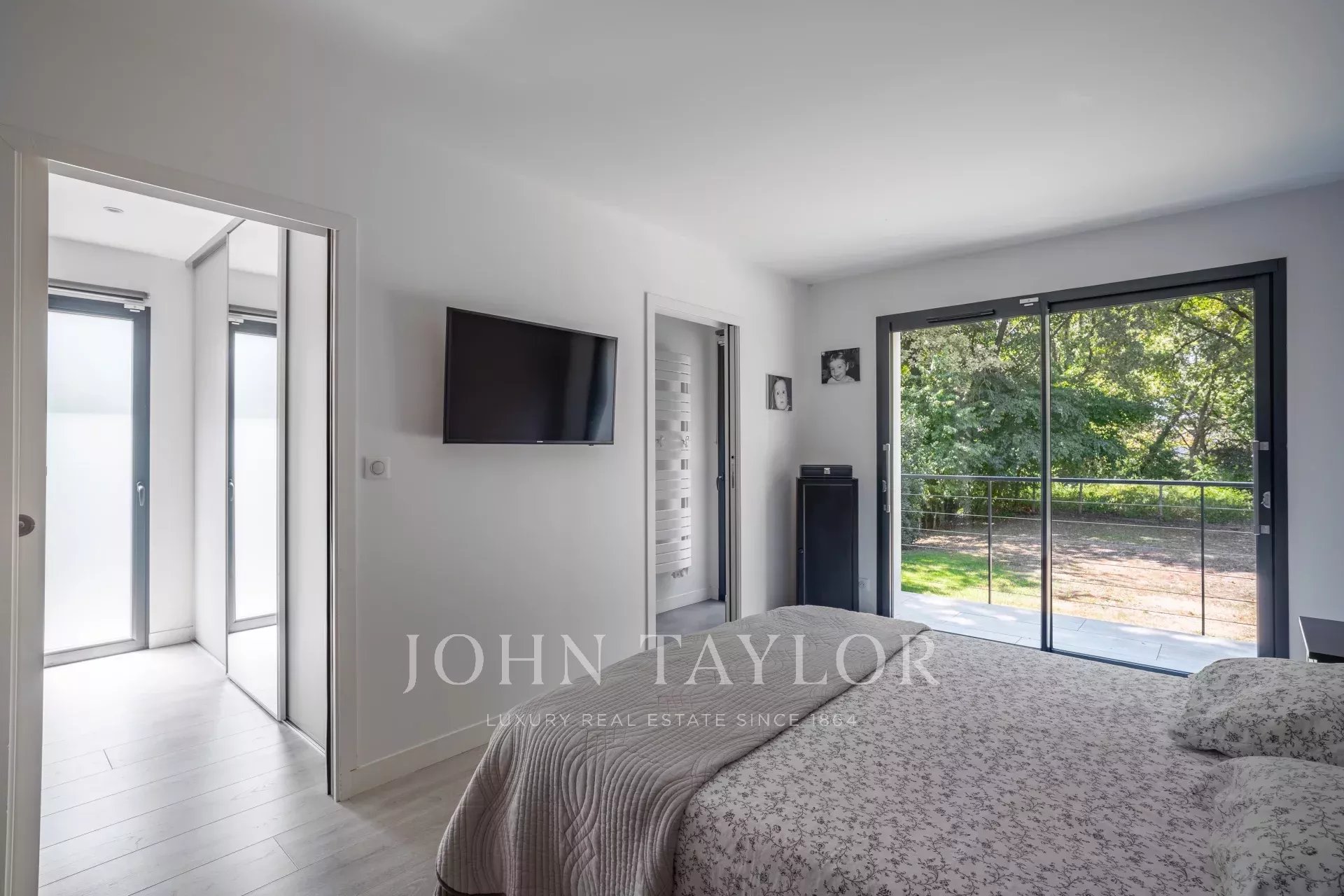 La partie nuit se déploie en deux ailes distinctes, assurant confort et intimité. Trois chambres, une salle de bains avec douche et baignoire ainsi qu’un WC indépendant composent la première aile. La seconde est dédiée à la suite parentale, avec dressing, salle d’eau privative, toilettes séparées et un espace supplémentaire pouvant accueillir un bureau, une salle de sport ou une cinquième chambre selon les besoins.