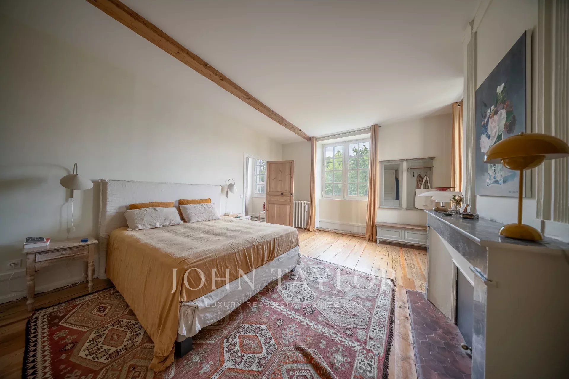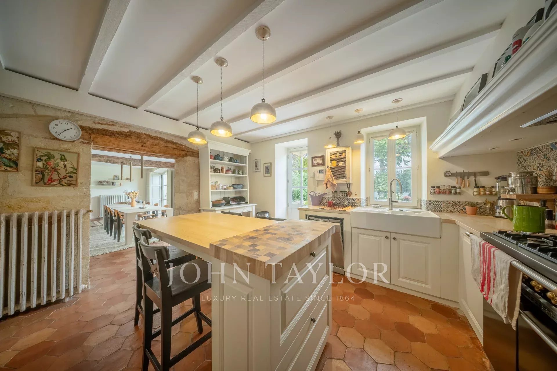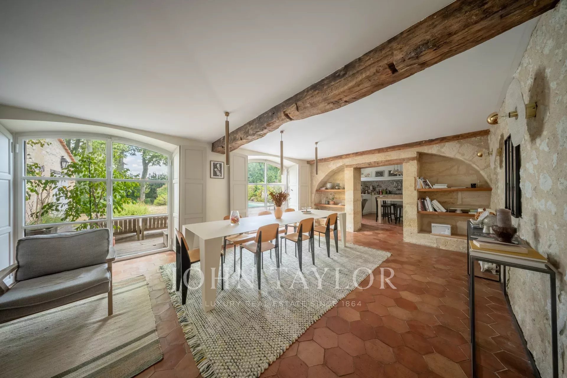 Au rez-de-chaussée, une belle entrée avec tomettes dessert un vaste bureau avec cheminée, un séjour chaleureux aux poutres apparentes, ainsi qu’une grande salle à manger baignée de lumière grâce à ses doubles portes-fenêtres ouvrant sur la terrasse et le jardin. La cuisine semi-ouverte dispose d’une arrière-cuisine et d’un accès direct au garage.