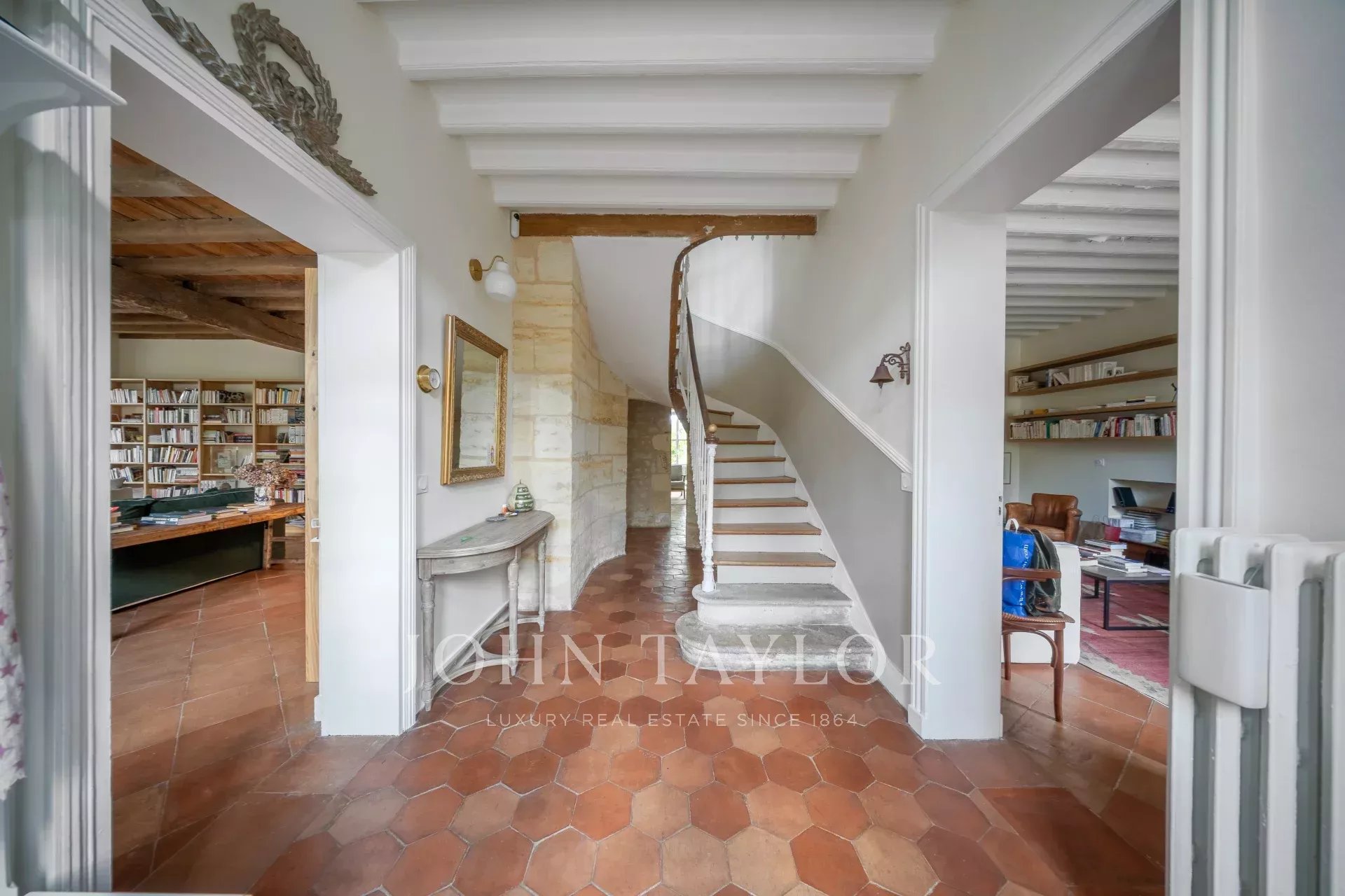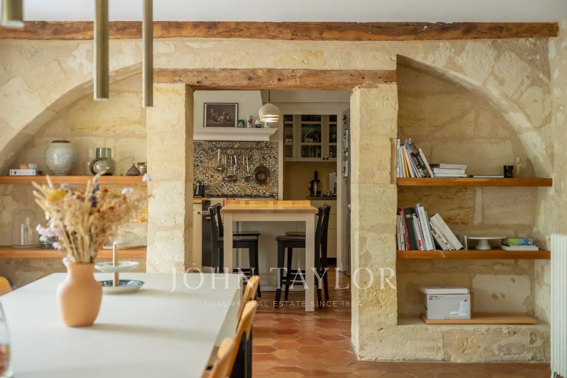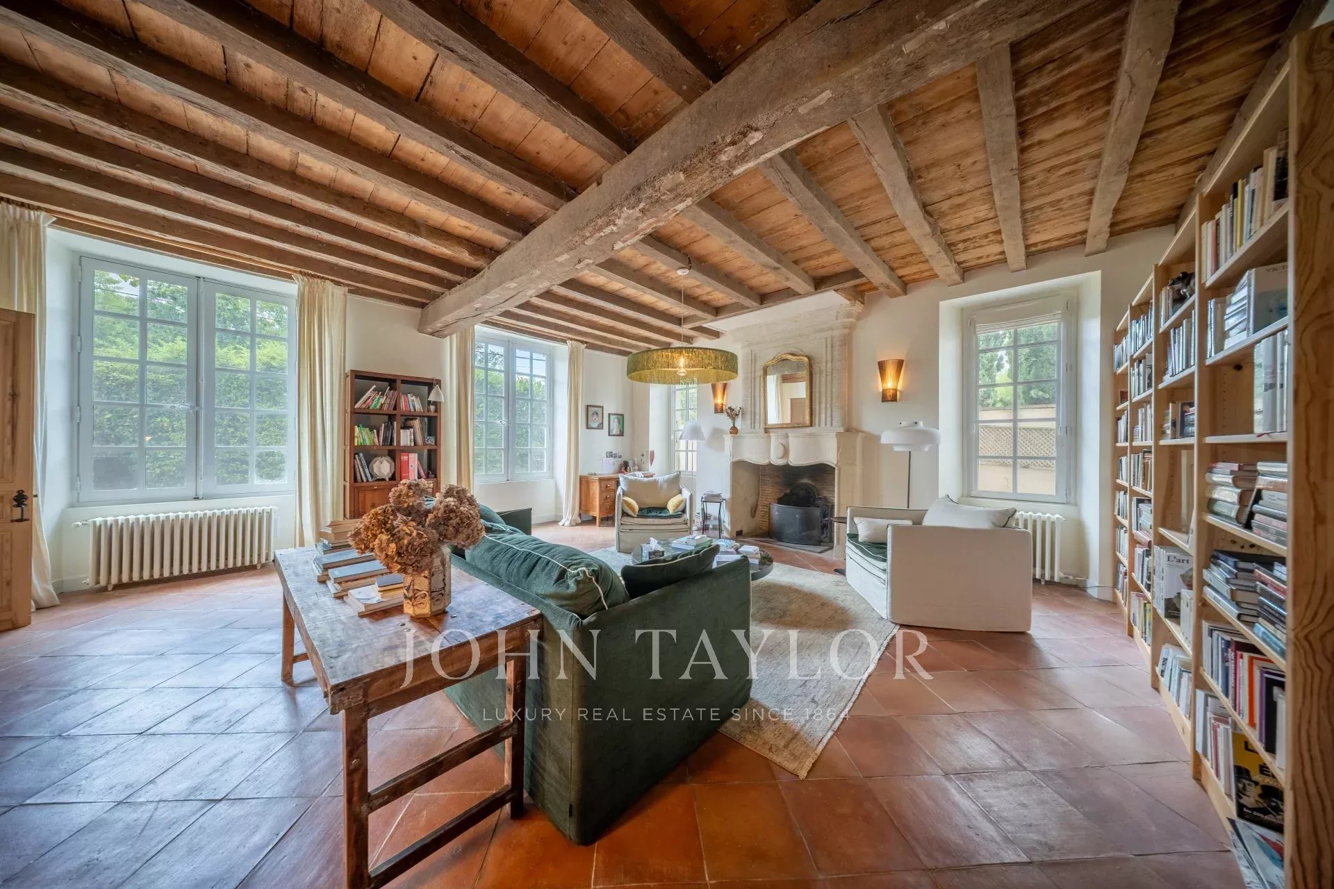 Au rez-de-chaussée, une belle entrée avec tomettes dessert un vaste bureau avec cheminée, un séjour chaleureux aux poutres apparentes, ainsi qu’une grande salle à manger baignée de lumière grâce à ses doubles portes-fenêtres ouvrant sur la terrasse et le jardin. La cuisine semi-ouverte dispose d’une arrière-cuisine et d’un accès direct au garage.