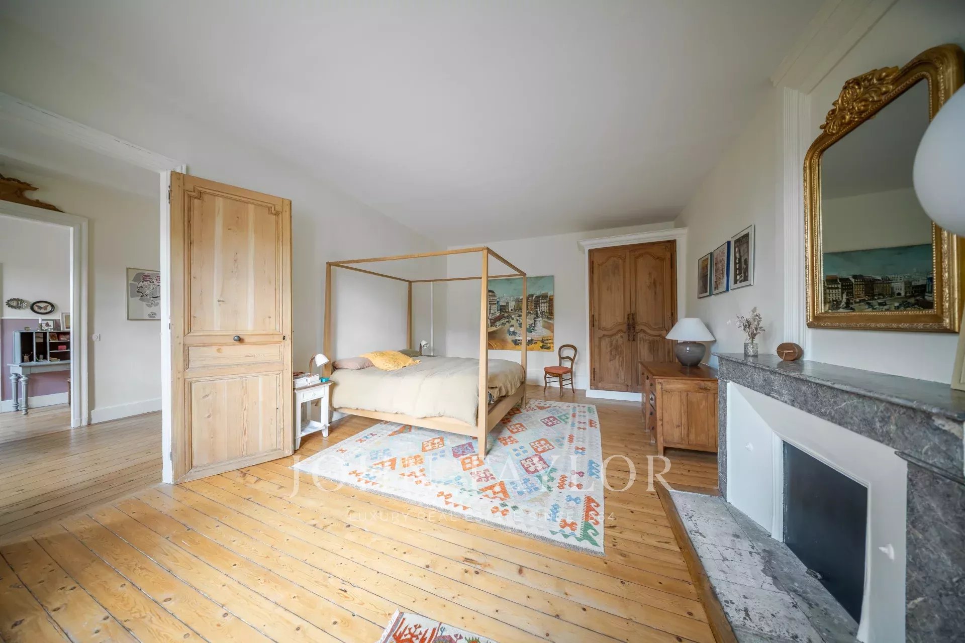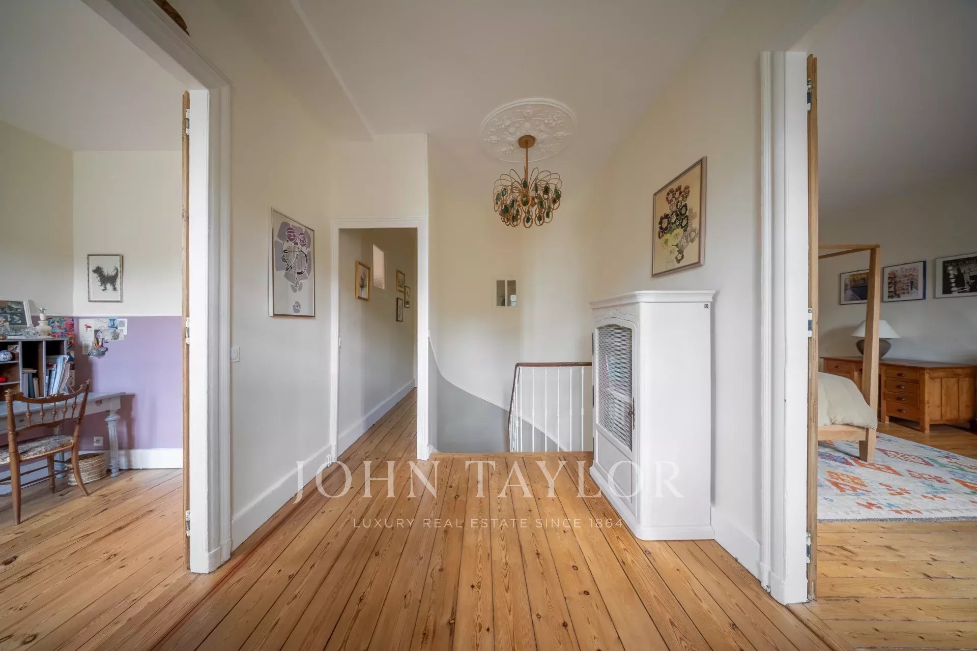 À l’étage, le charme se poursuit avec un parquet massif d’époque dans toutes les pièces. Le palier dessert quatre chambres spacieuses dont deux avec cheminées, un boudoir, deux salles d’eau, un WC indépendant et des combles.