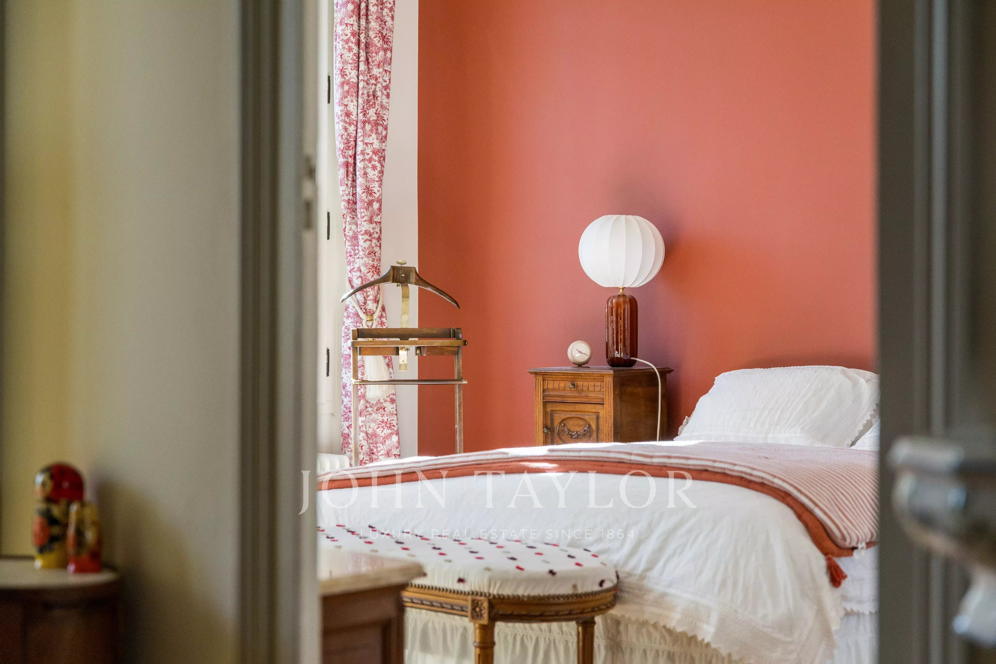 Un escalier d'époque mène aux étages : quatre belles chambres, deux salles de bains, bureau et un vaste palier pouvant faire office d’espace jeux ou bureau. De nombreux rangements sont également présents.