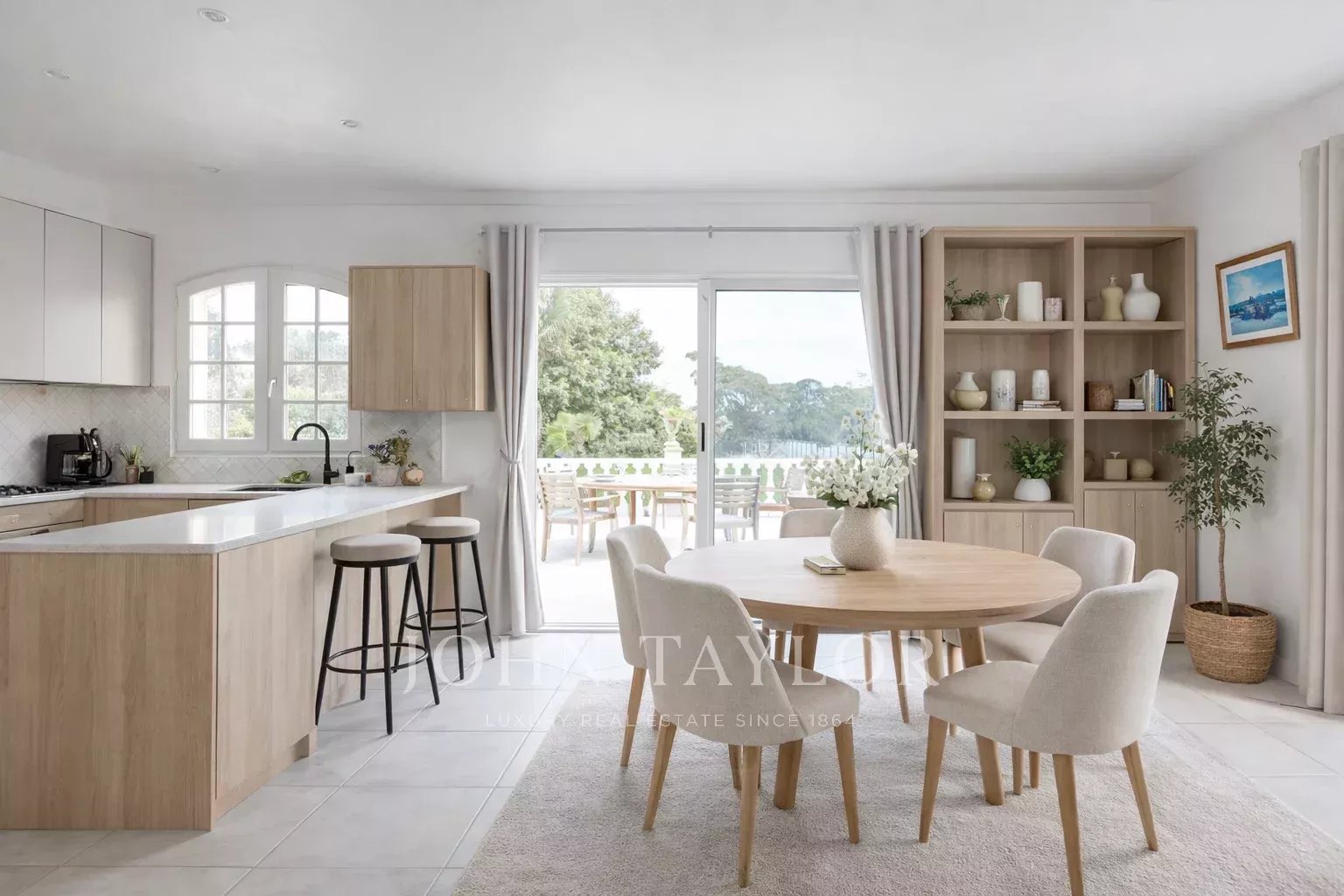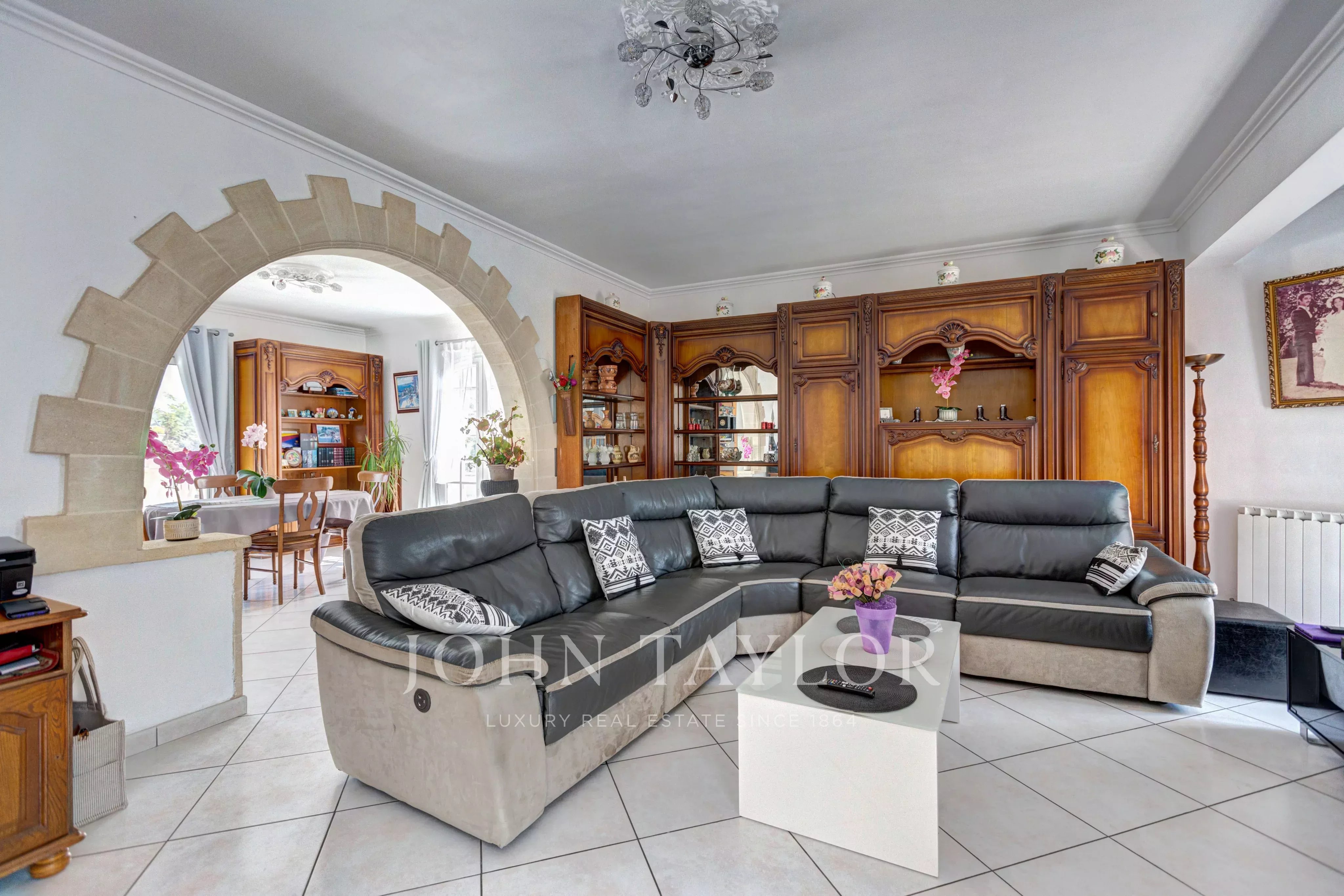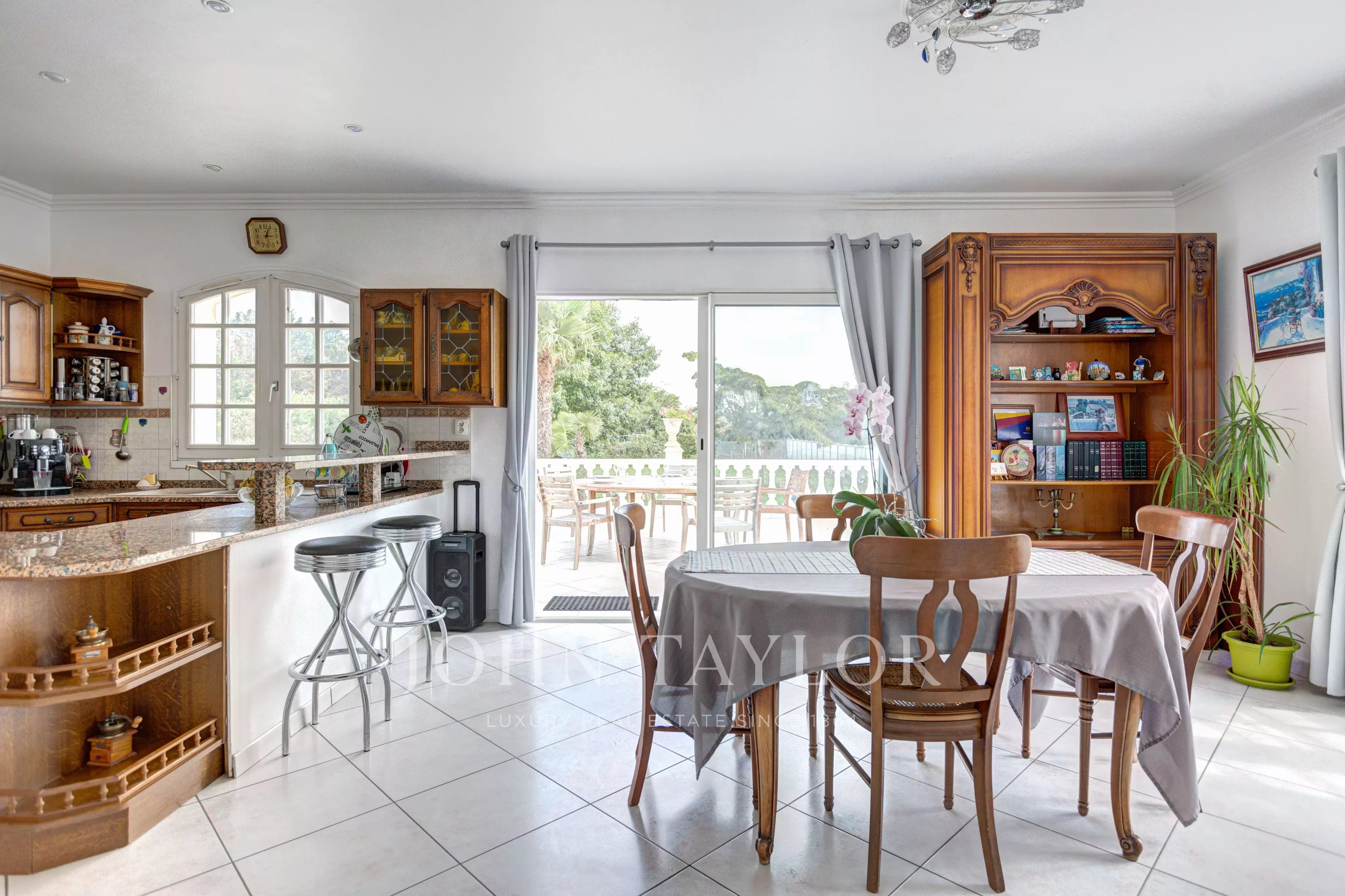 L’entrée principale donne sur un vaste espace de vie baigné de lumière, composé d’une salle à manger, d’une cuisine ouverte et d’un salon avec accès direct à une terrasse qui surplombe le jardin et la piscine. L’espace nuit comprend trois chambres équipées de placards, une salle de bains avec baignoire, douche et doubles vasques, ainsi qu’un WC séparé et un dressing spacieux.