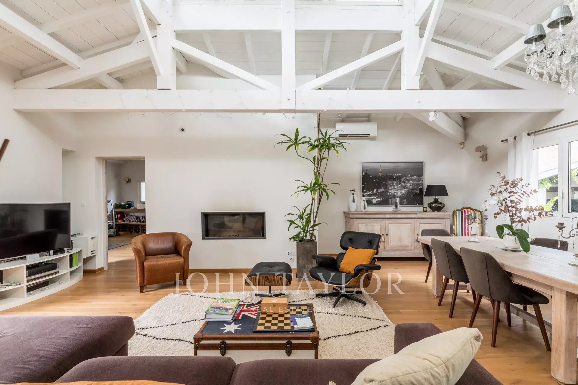 Le séjour avec cheminée, la salle à manger et la cuisine dinatoire ouverte offrent un grand espace de vie ouvert sur les extérieurs, sublimé par une belle hauteur sous plafond et une charpente apparente.