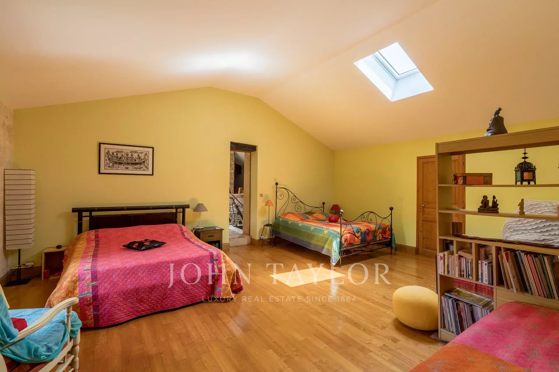 À l’étage, quatre belles chambres, dont deux en enfilade, se partagent une salle d’eau et une salle de bains. Un grenier sous rampants complète cet espace.