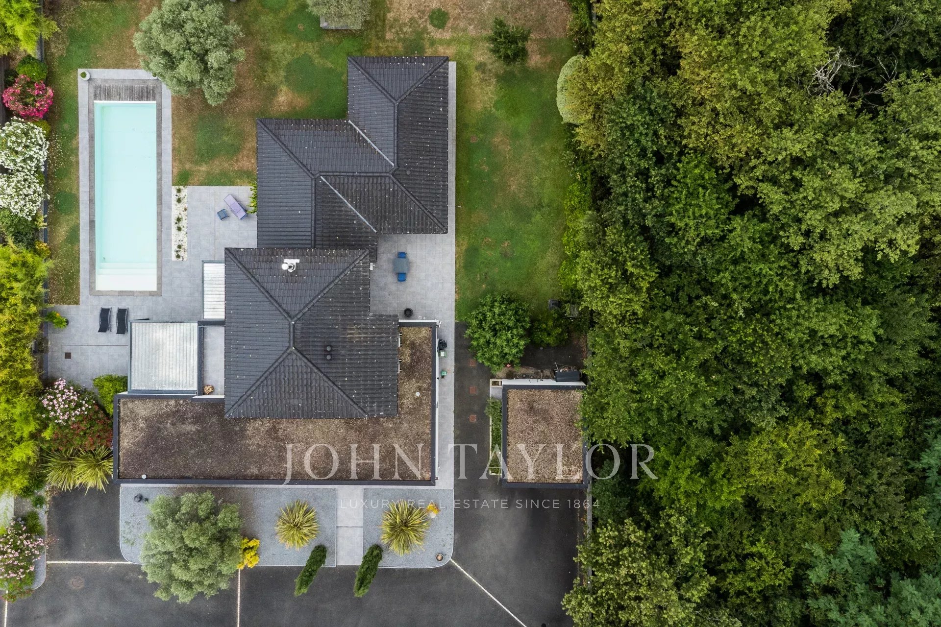 Nichée à l’abri des regards, en fond d’allée privée, elle prend place sur un superbe terrain paysager de plus de 2 000 m², orienté plein sud et sublimé par une piscine chauffée de 13 x 4 mètres, au sel, dotée d’un rideau électrique immergé.