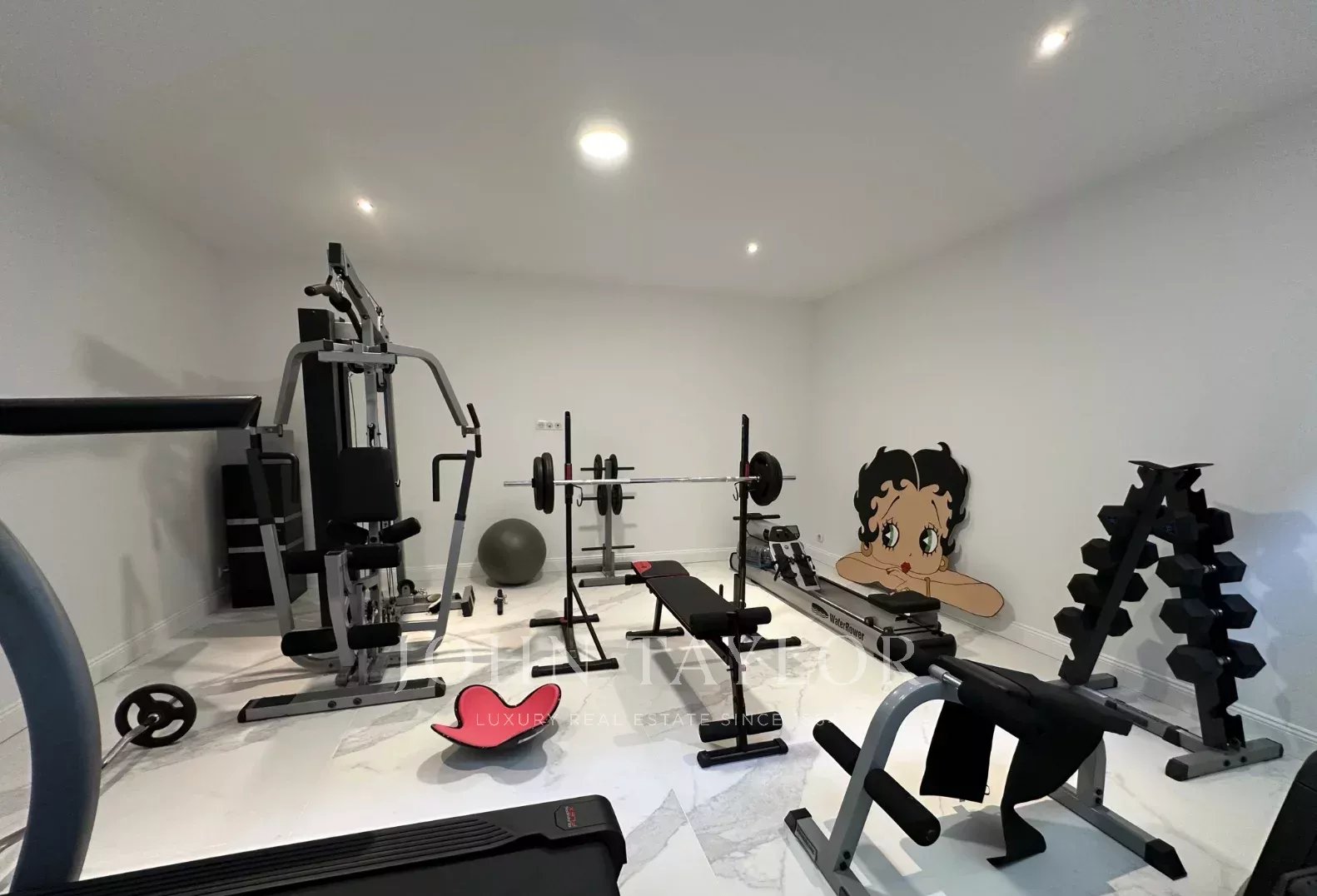 Le rez-de-chaussée comprend également une salle de sport, un bureau et une suite composée d’une chambre et de sa salle d’eau privative.
