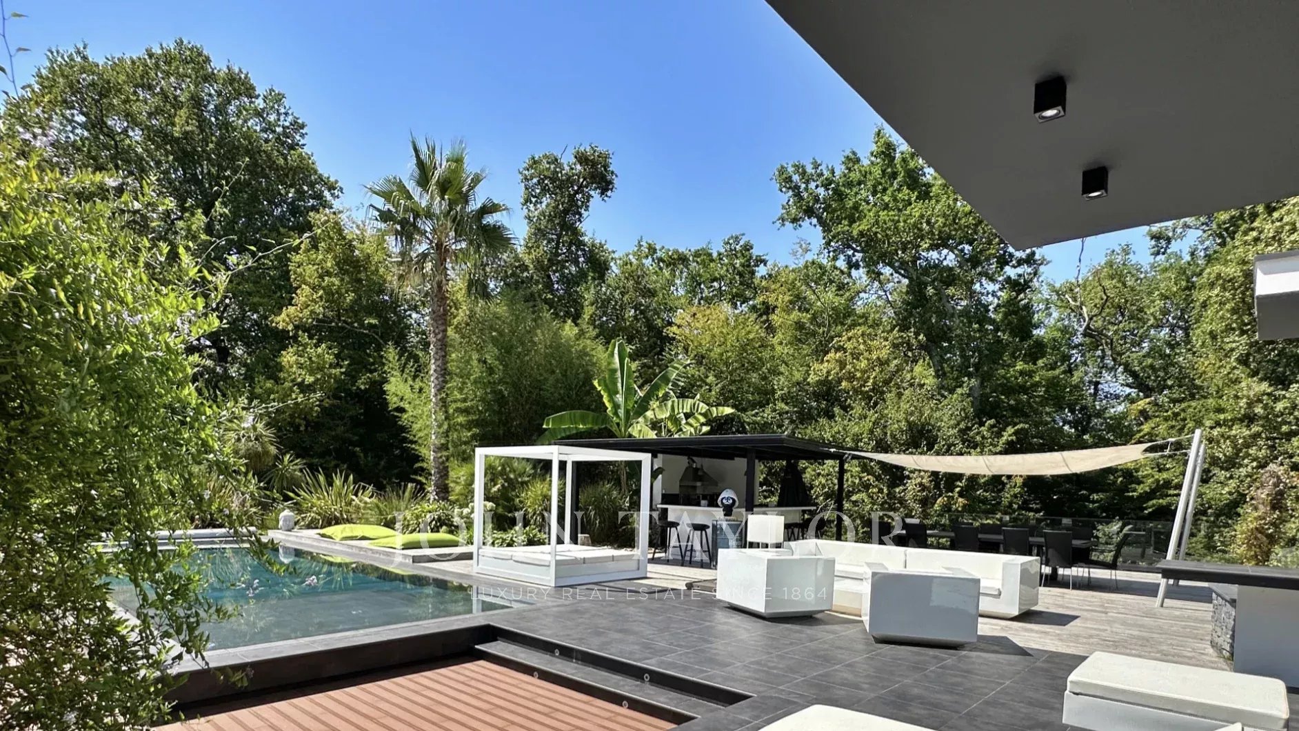 Les extérieurs sont à la hauteur de la villa : une vaste terrasse avec cuisine d’été, un terrain de pétanque et une superbe piscine miroir chauffée de 11 x 4 m, dominant la forêt et offrant des instants de détente en toute intimité.