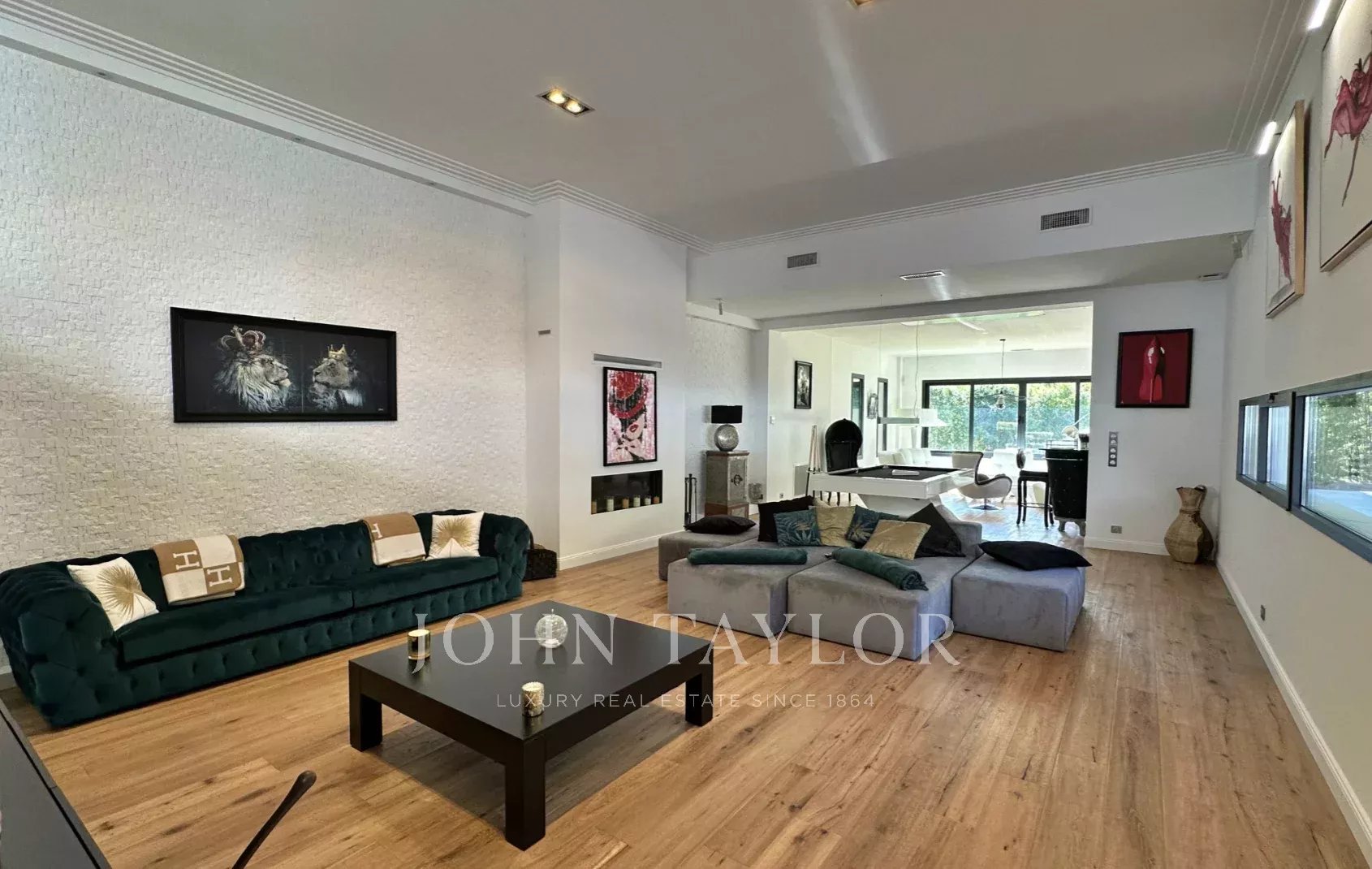 Dès l’entrée, le ton est donné : volumes généreux, finitions raffinées et prestations haut de gamme. La villa offre une vaste cuisine dinatoire entièrement équipée, complétée par une seconde cuisine indépendante. La salle à manger domine un séjour spectaculaire de près de 90 m² avec cheminée insert, sublimé par une belle hauteur sous plafond qui confère à l’ensemble une atmosphère chaleureuse et élégante.