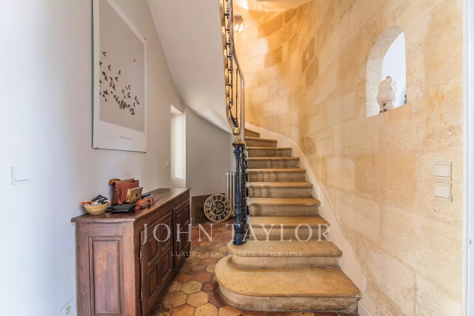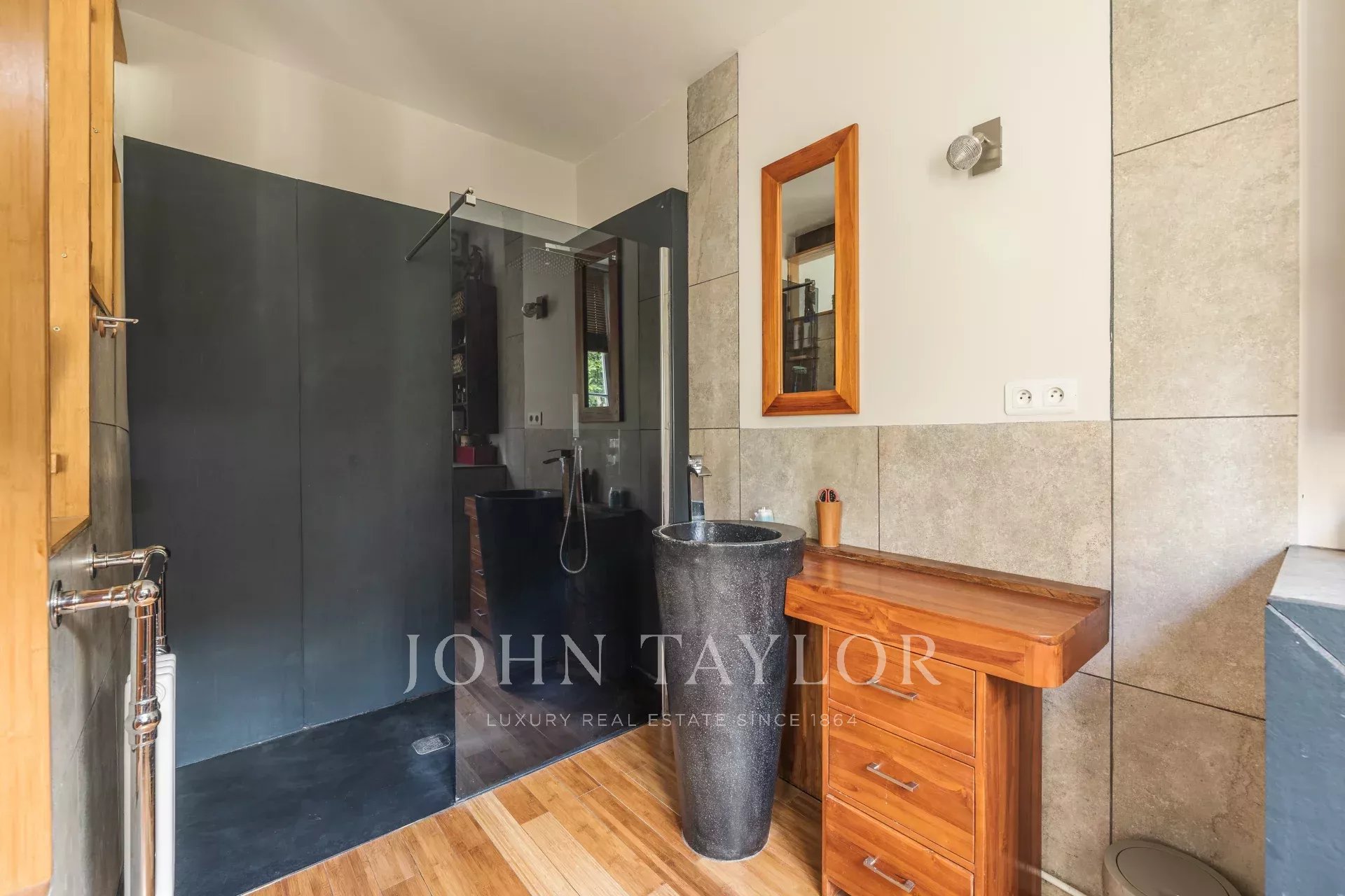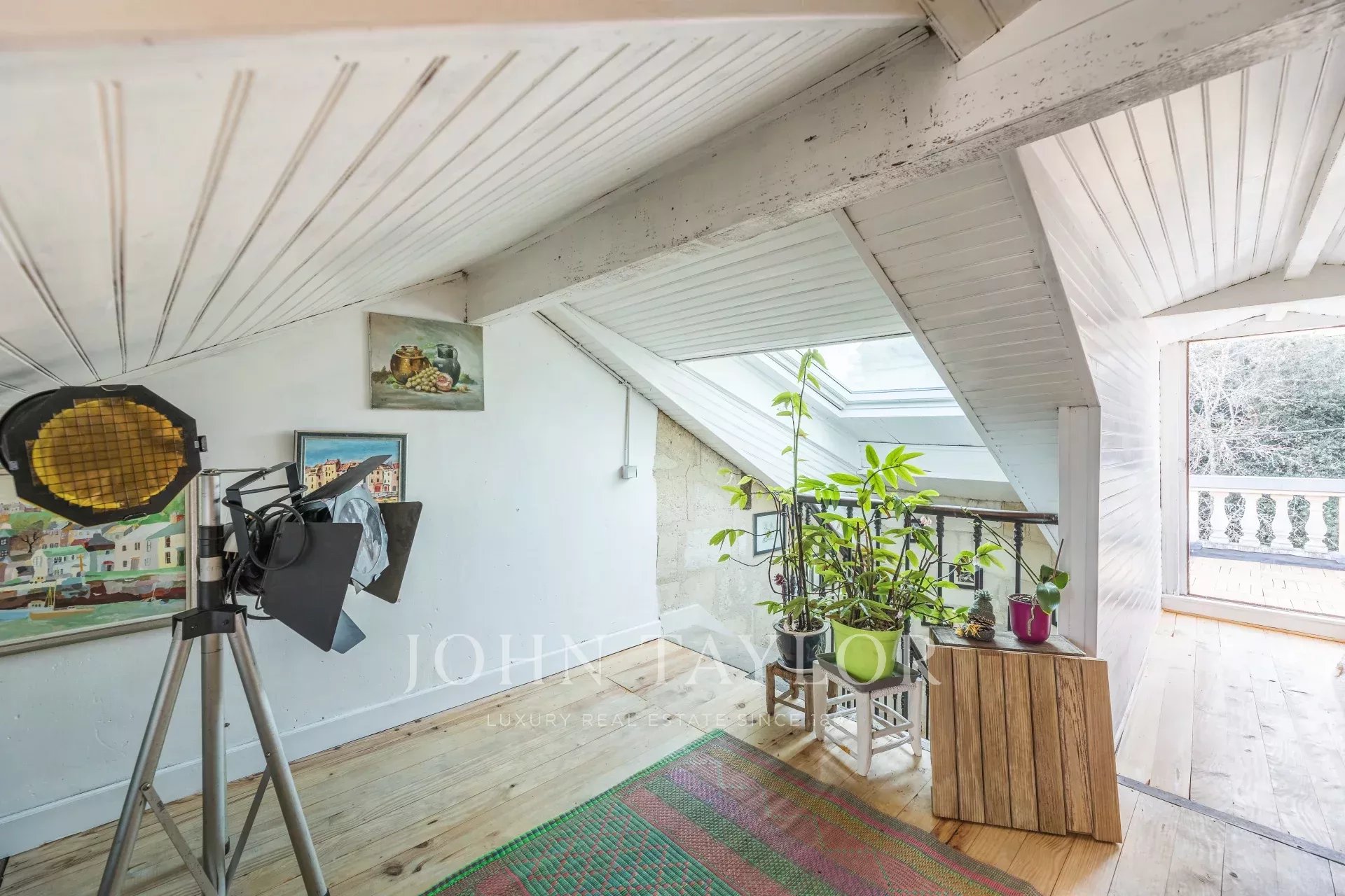 À l’étage, un escalier en pierre mène à trois chambres et deux salles de bains. Les combles, aménageables, donnent accès aux toits-terrasses qui surplombent le jardin et la piscine chauffée.