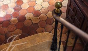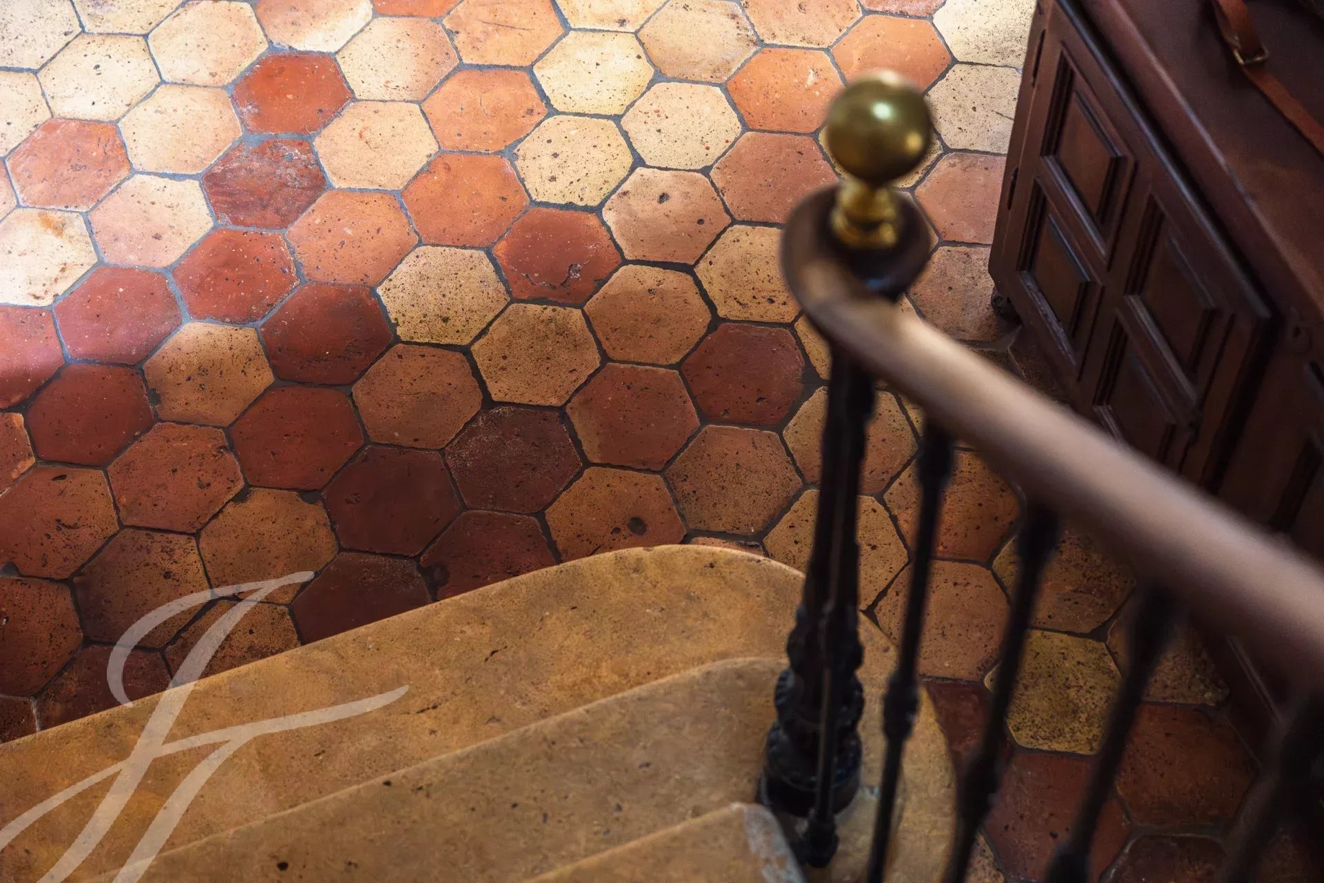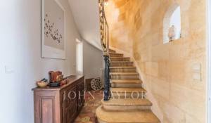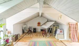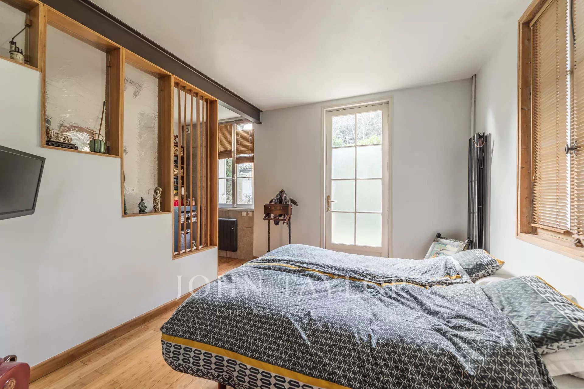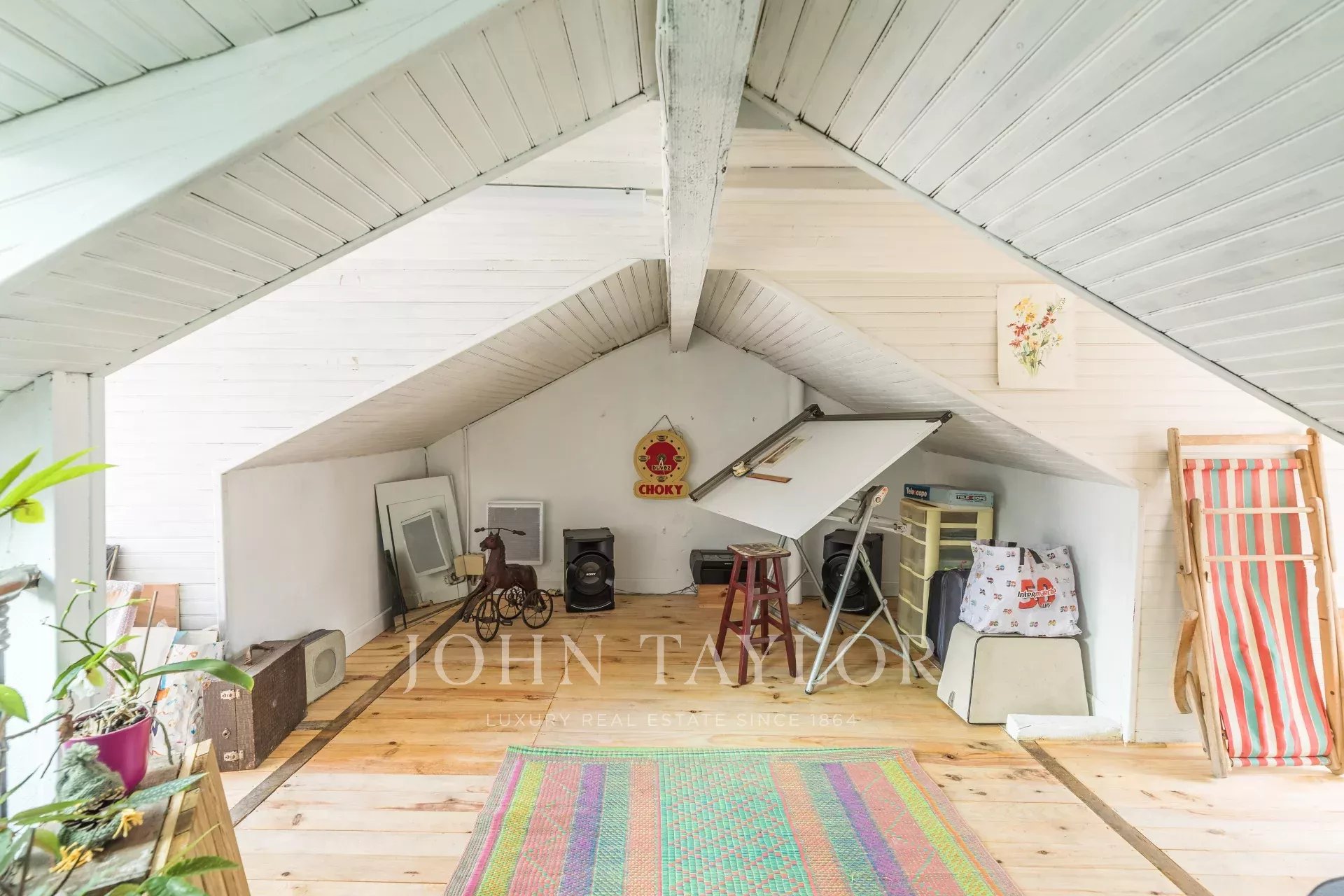 À l’étage, un escalier en pierre mène à trois chambres et deux salles de bains. Les combles, aménageables, donnent accès aux toits-terrasses qui surplombent le jardin et la piscine chauffée.
