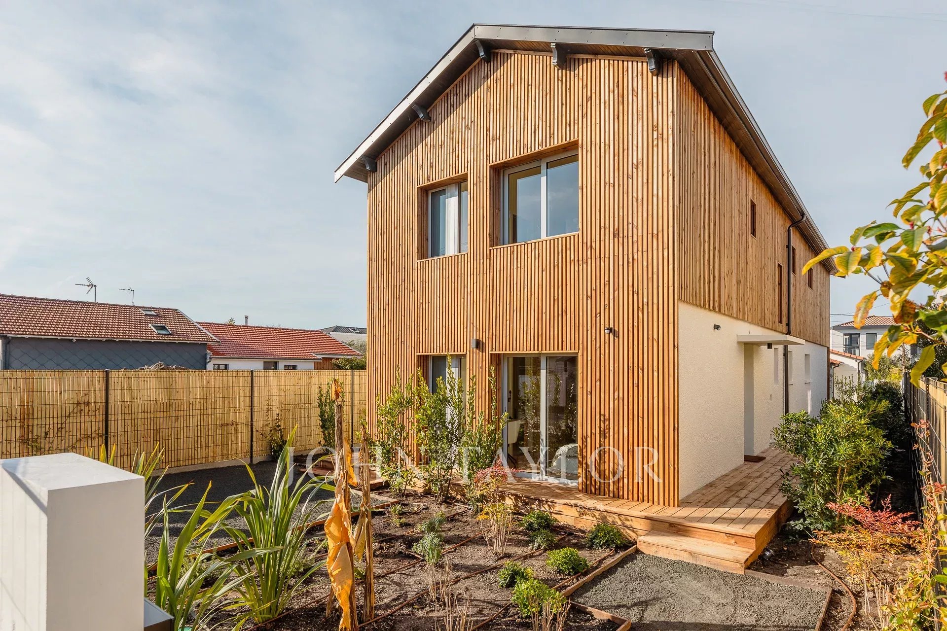 Un jardin d’accueil avec un espace de stationnement complète cette propriété aux lignes élégantes.