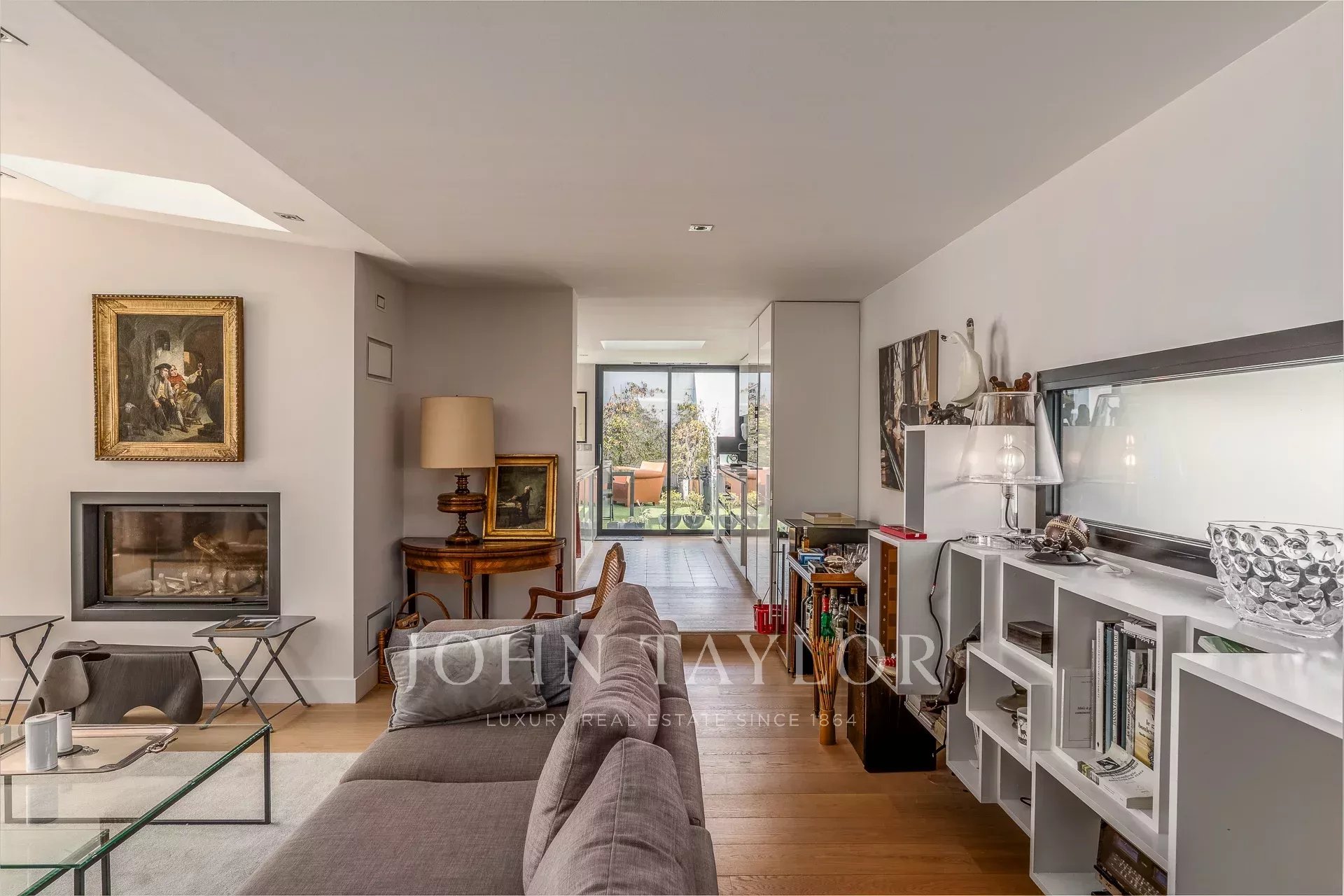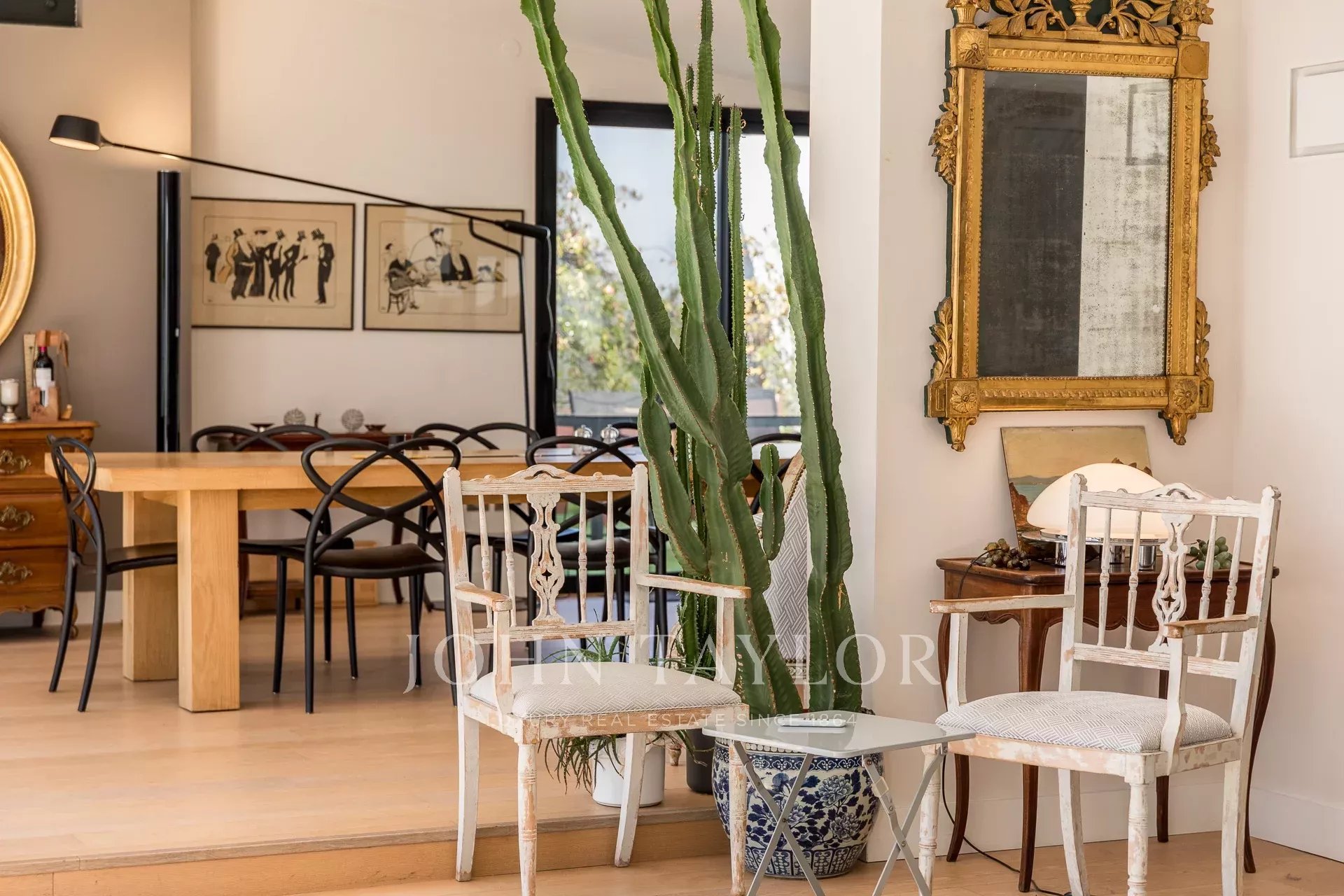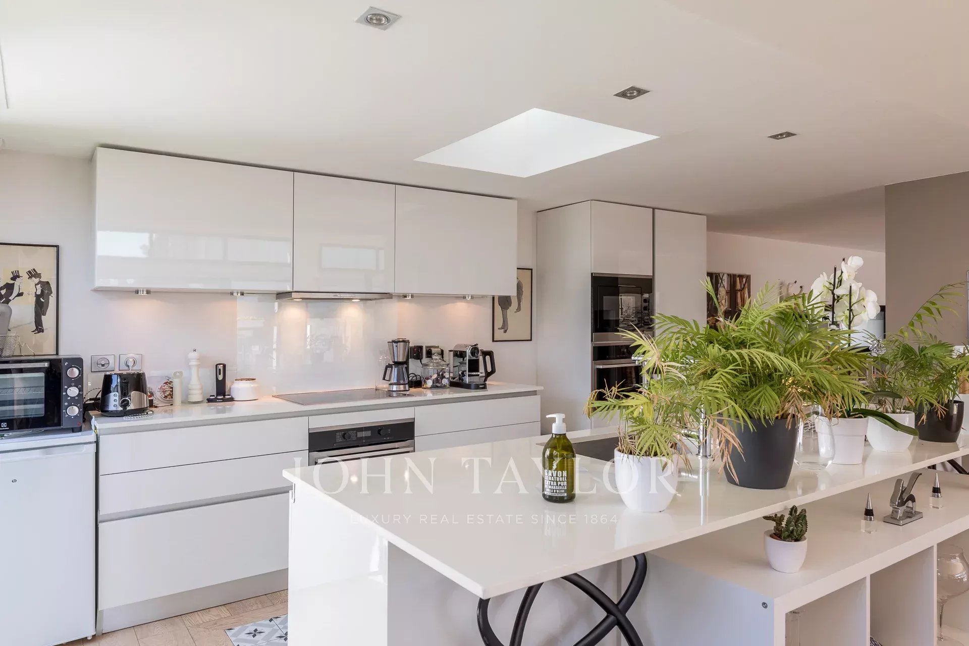 Cette villa contemporaine de plain-pied, positionnée en retrait de la rue, au bout d’une allée privative, offre un cadre préservé dans un calme absolu et à l’abri des regards.
