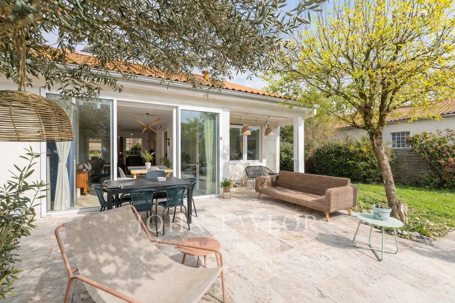 À l’extérieur, le jardin clos et arboré constitue un véritable écrin de verdure. La dépendance d’environ 40 m² permet d’imaginer différents usages : bureau, salle de sport ou espace d’accueil.
