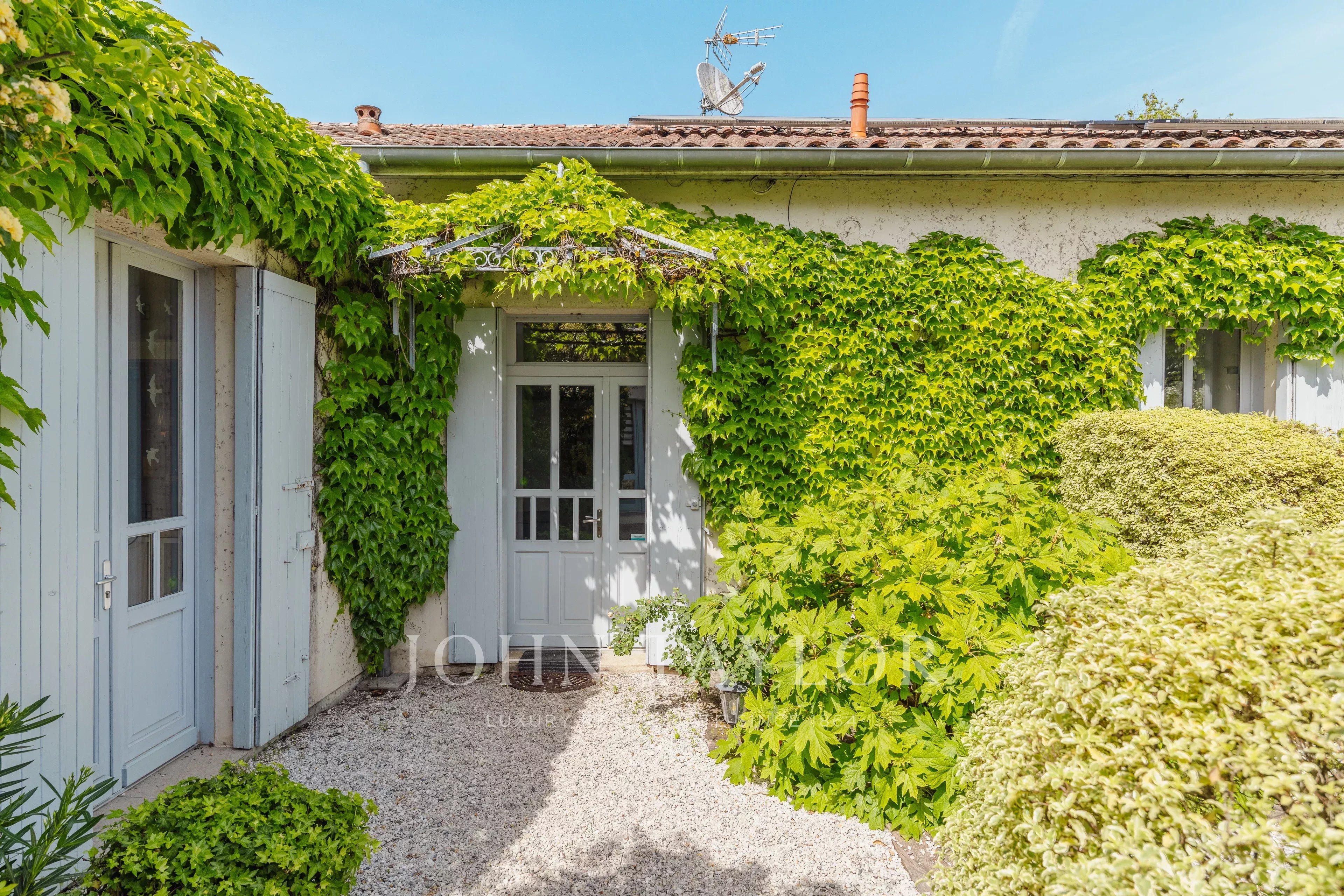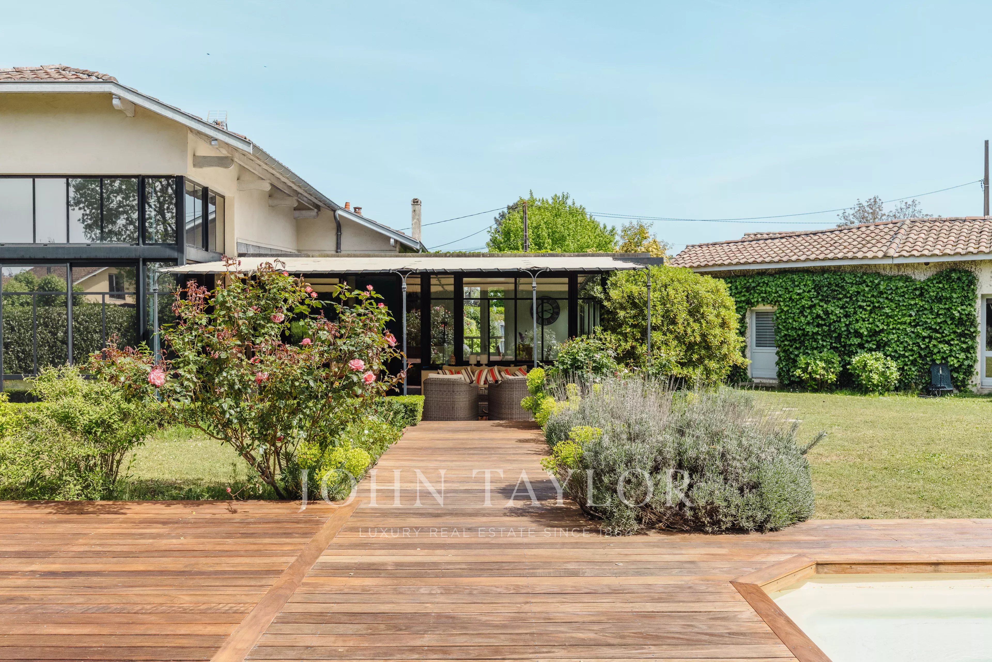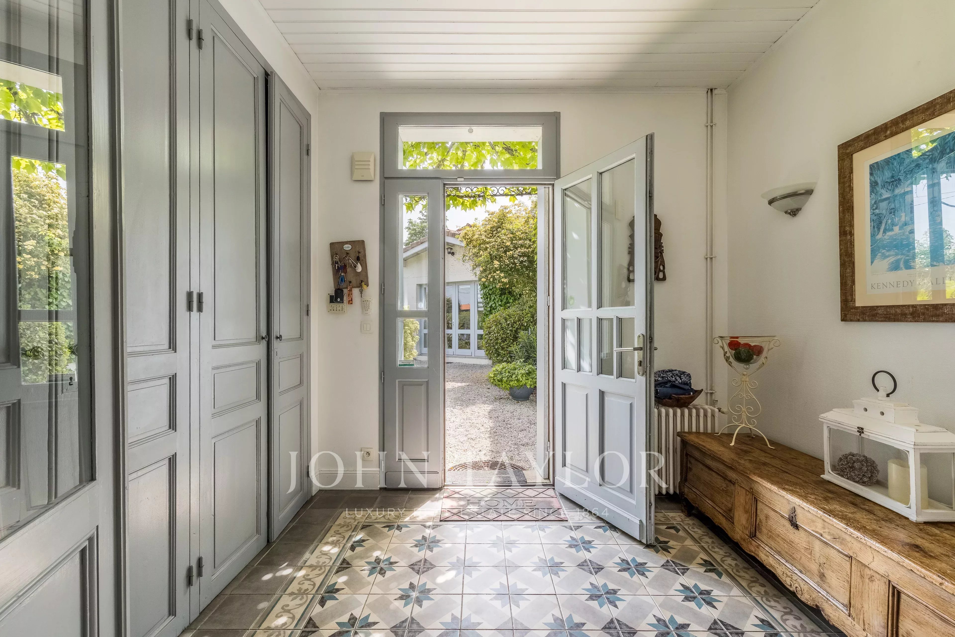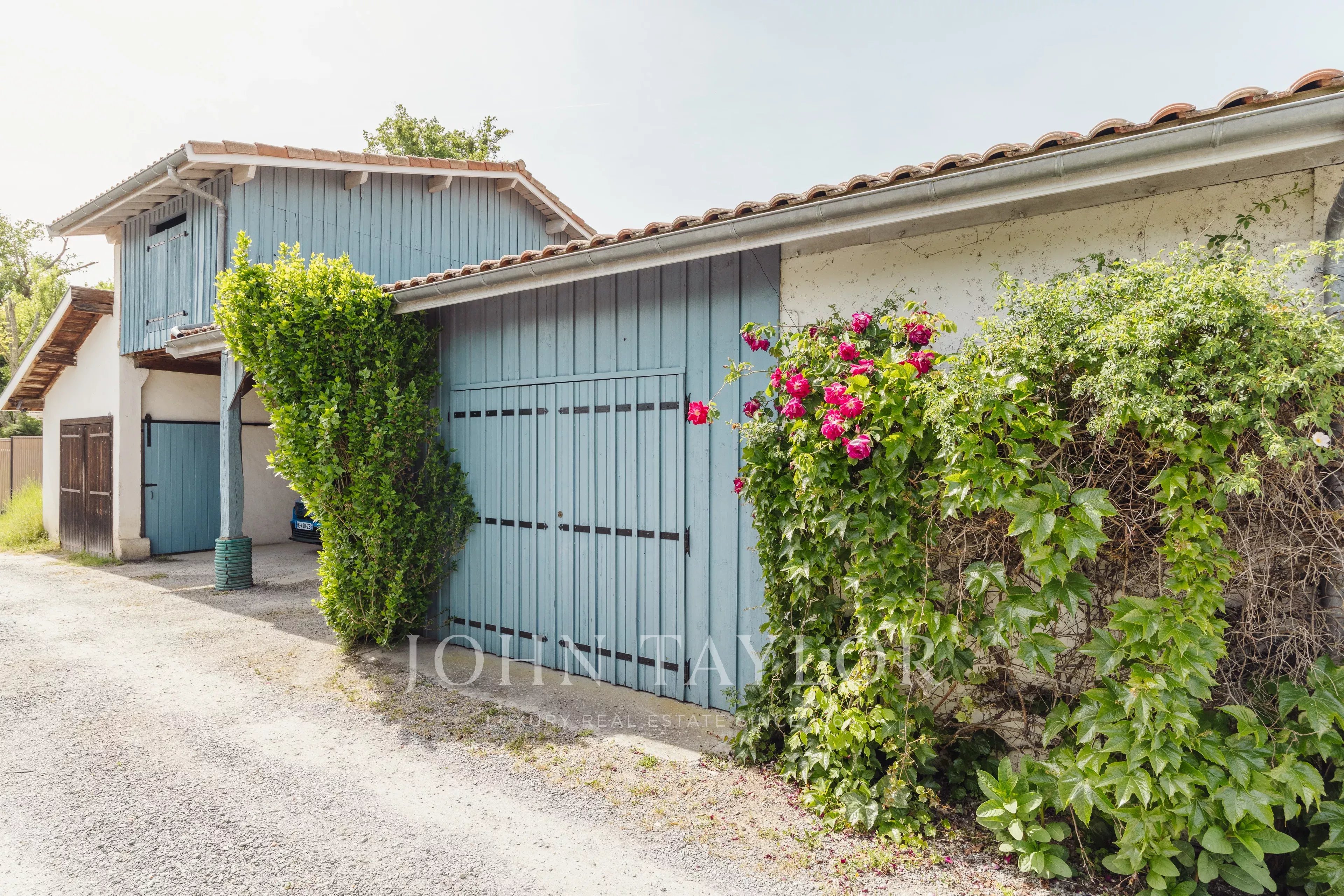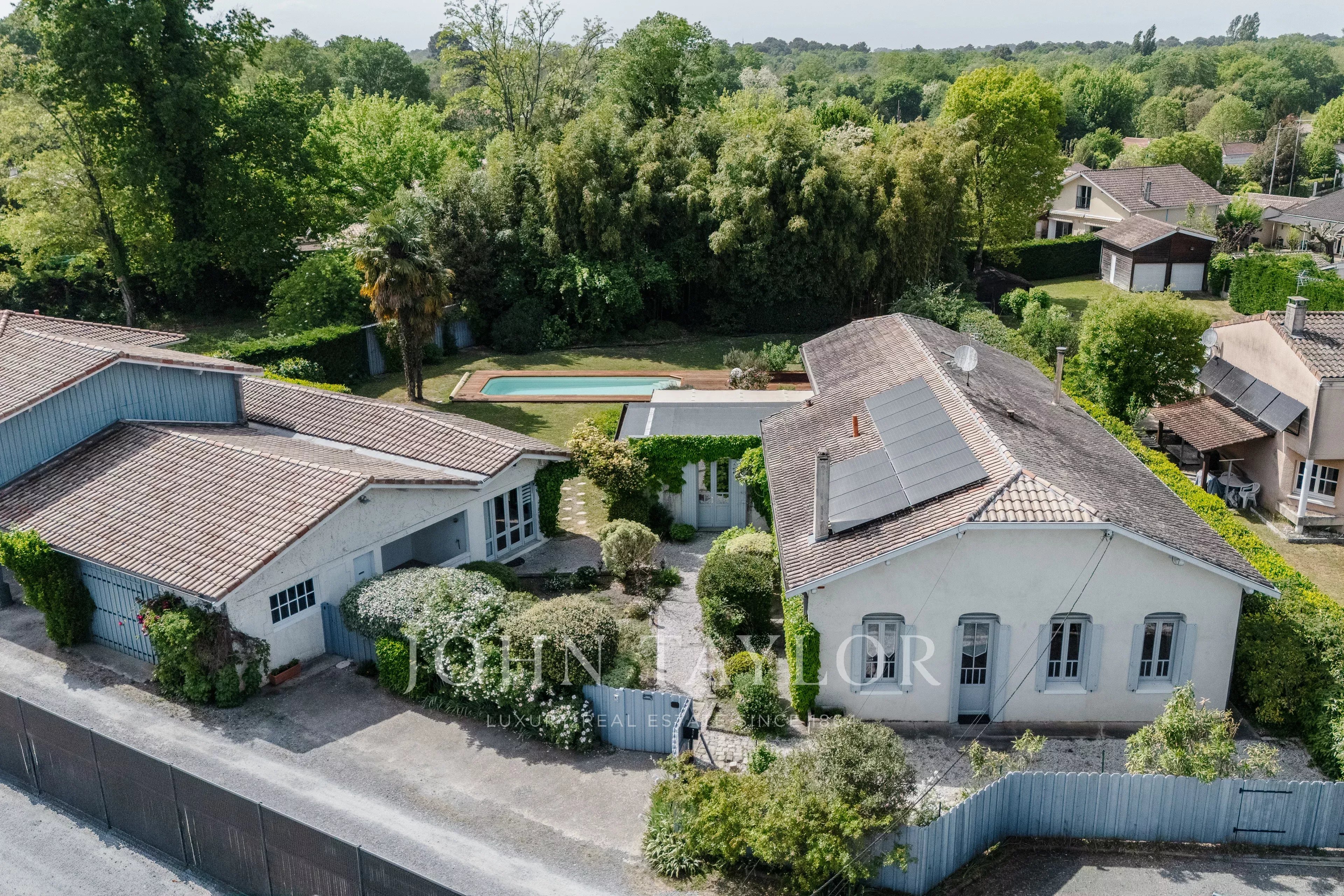 Cette ancienne maison de vigneron de style arcachonnais développe, entre la maison principale et ses dépendances, 238 m² habitables au cœur d’un beau terrain arboré de 1900 m² avec piscine. Rénovée avec soin, elle allie le charme de l’ancien à un confort moderne.